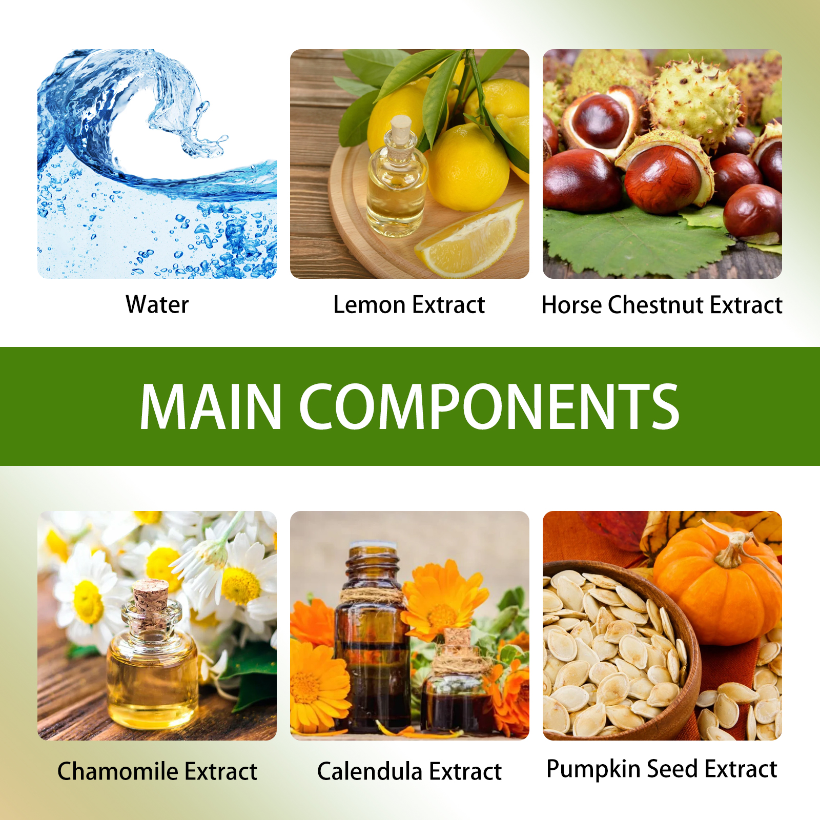 | 成分 | 柠檬提取物、七叶树提取物、洋甘菊提取物 |