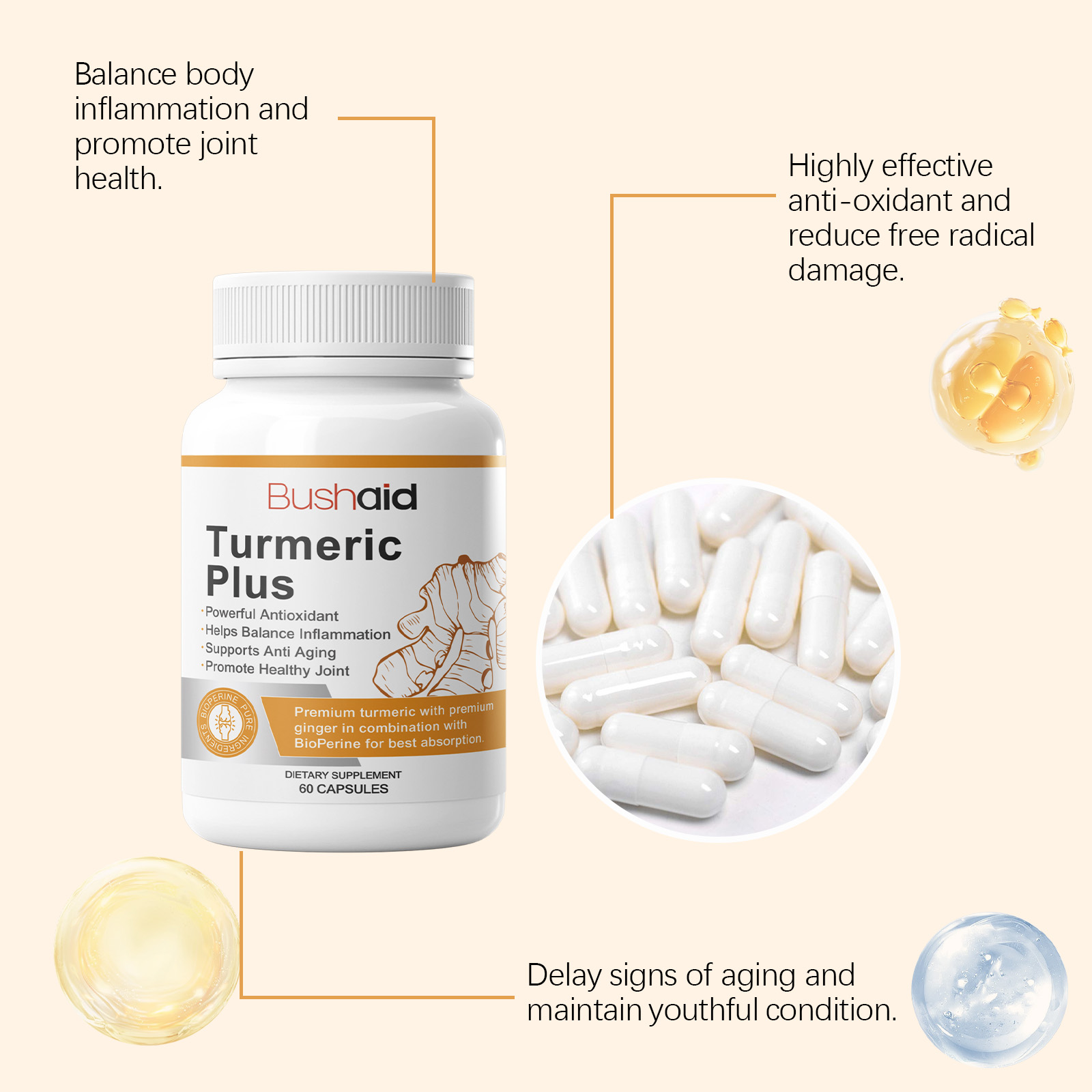 BushAid Turmeric Vitamin Capsules, Body Care Capsules Rejuvenate Body And Mind Care Comfort Capsules