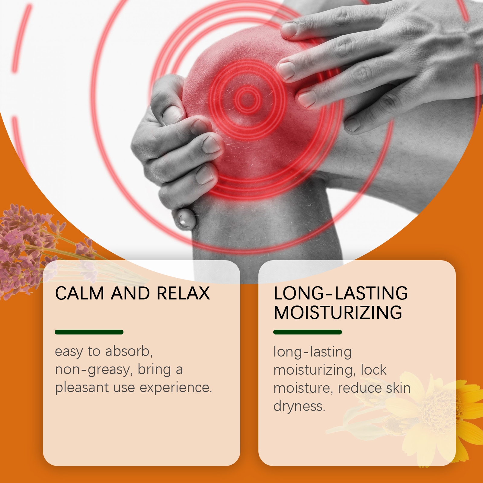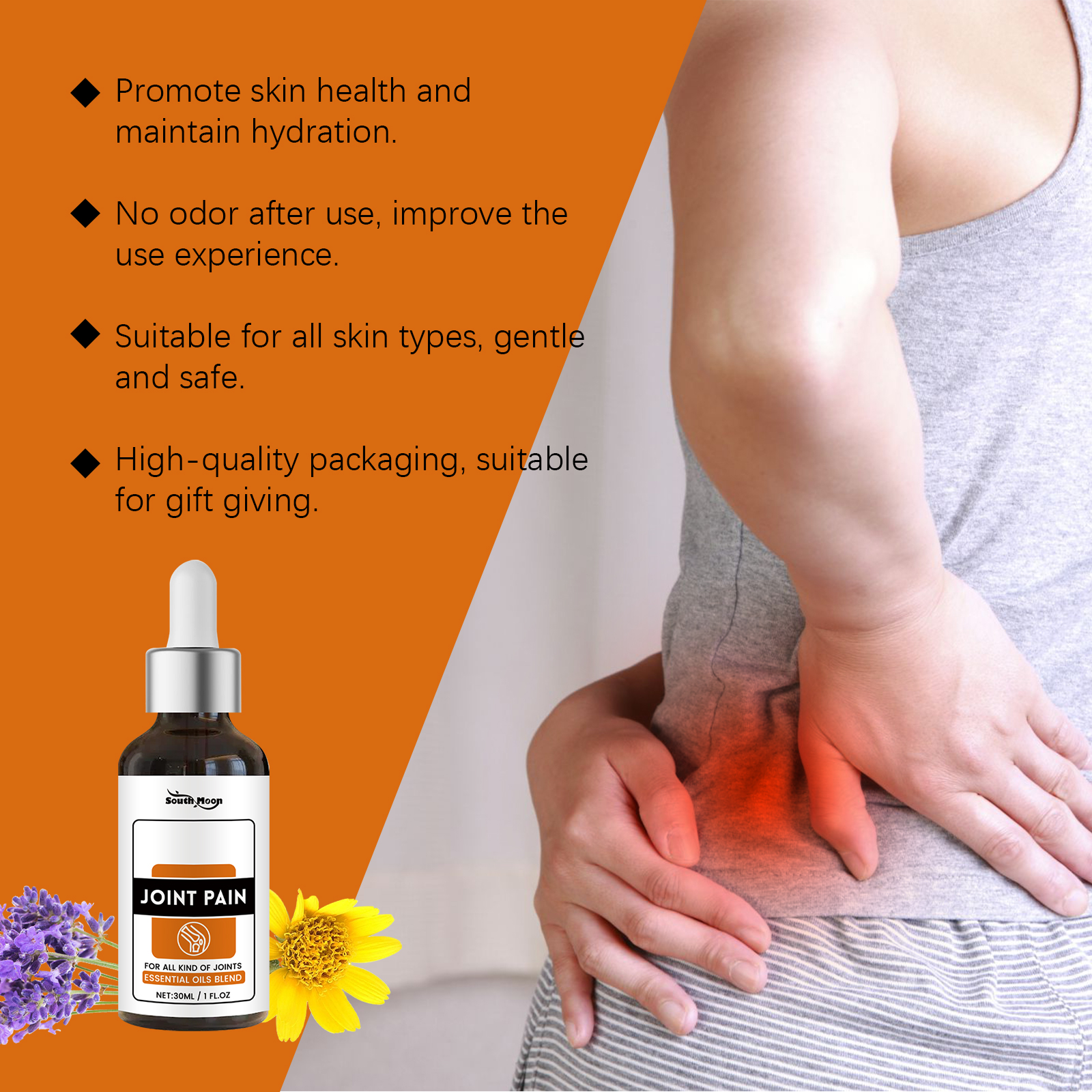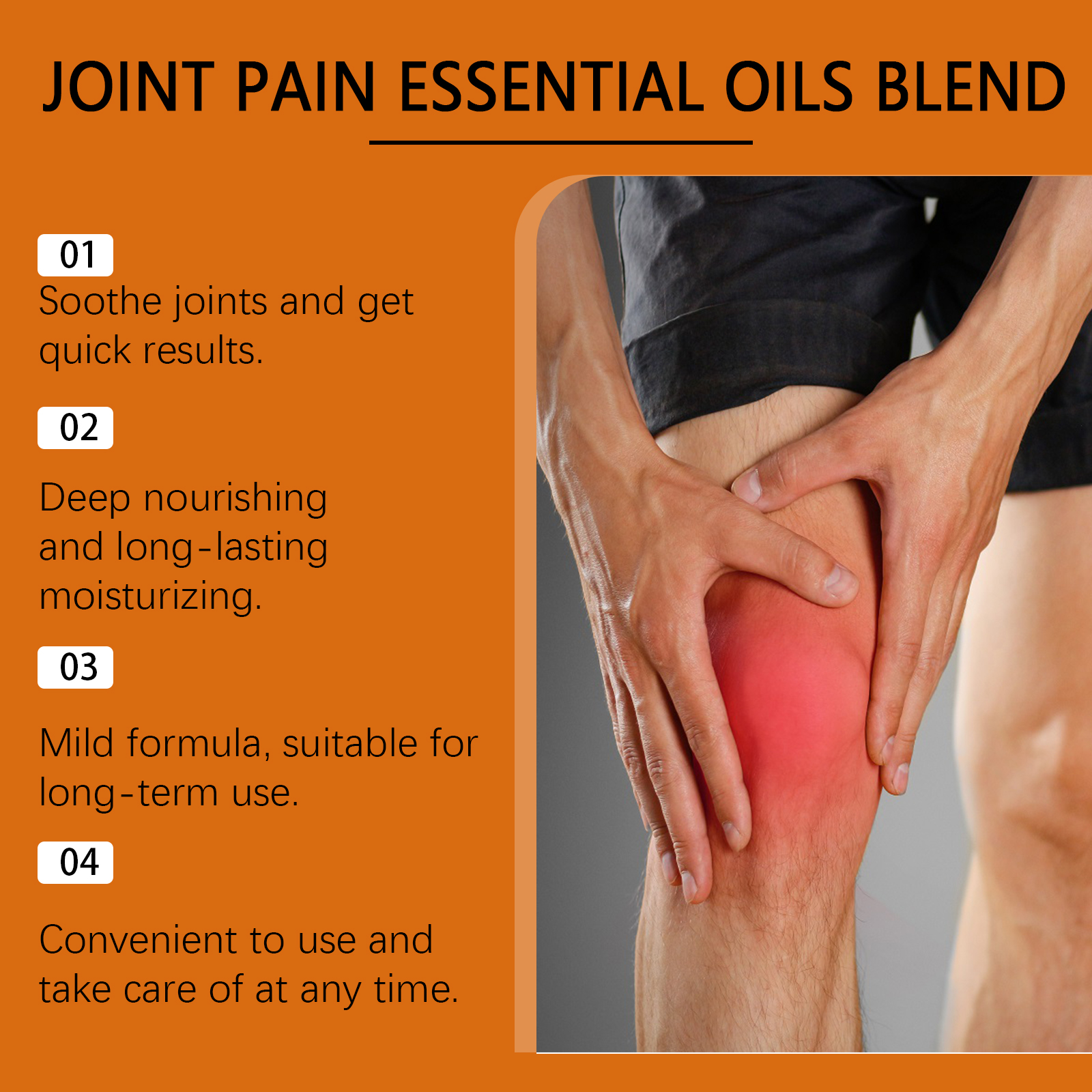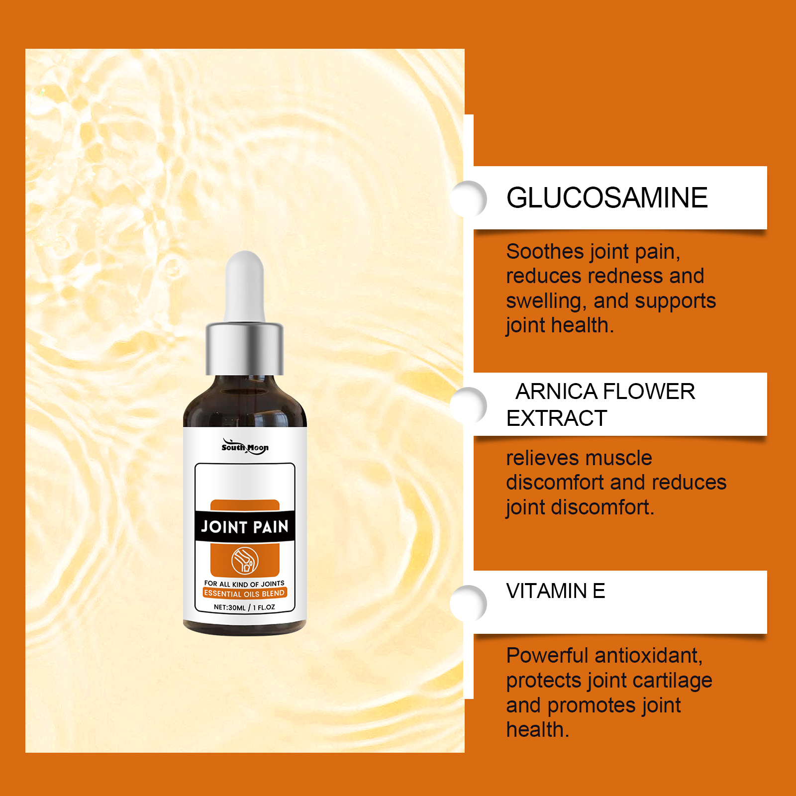 我们的关节精华剂含有甘油、羟乙基纤维素。它易吸收,不油腻,带来愉悦的使用体验。持久保湿,锁住水分,减少肌肤干燥。它的使用方法很简单:取本品适量均匀涂于患处,轻轻按摩至吸收。并且可以深层滋养肌肤,改善关节的血液循环。