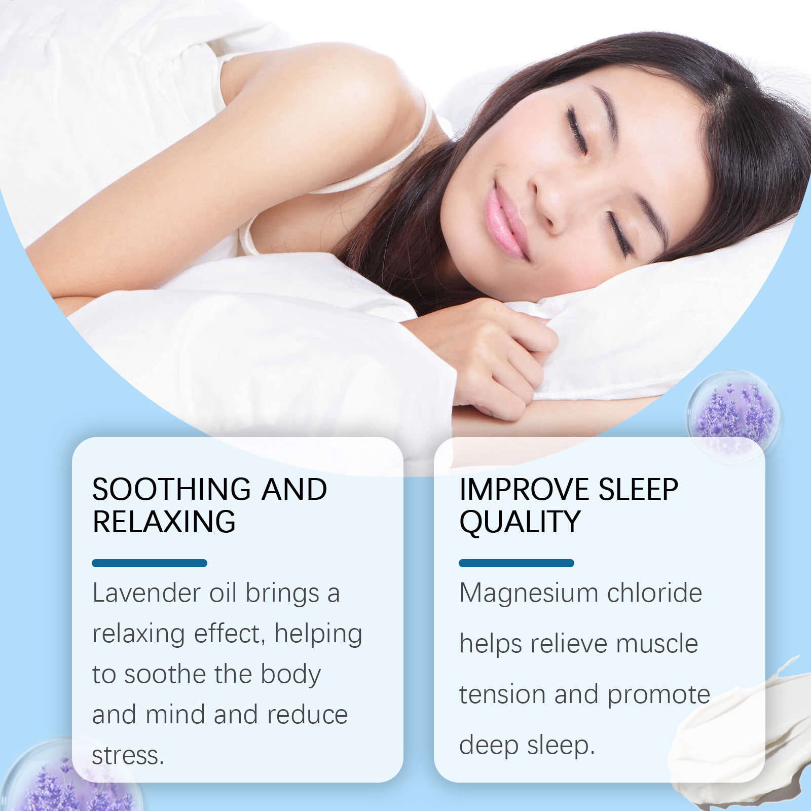 我们的舒缓睡眠镁霜含有三乙醇胺、薰衣草油、氯化镁。它可以带来放松的效果,有助于舒缓身心并减少压力。它的使用方法很简单:睡前取本品少量,均匀涂抹于颈部、肩部和腿部,并轻轻按摩以促进吸收。并且氯化镁有助于缓解肌肉紧张,促进深度睡眠。