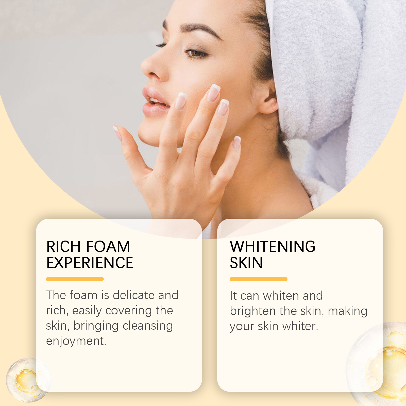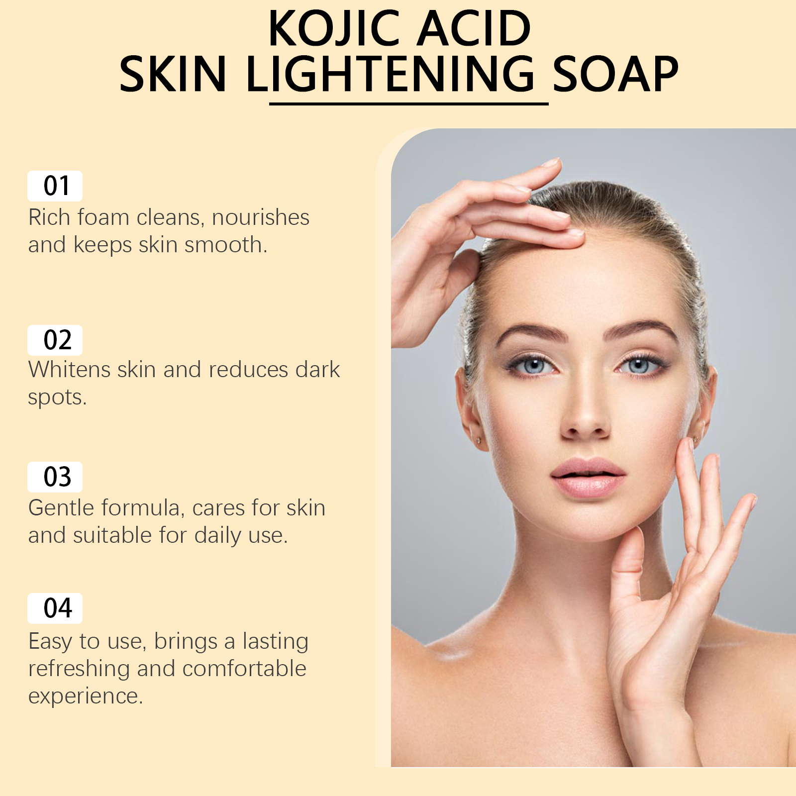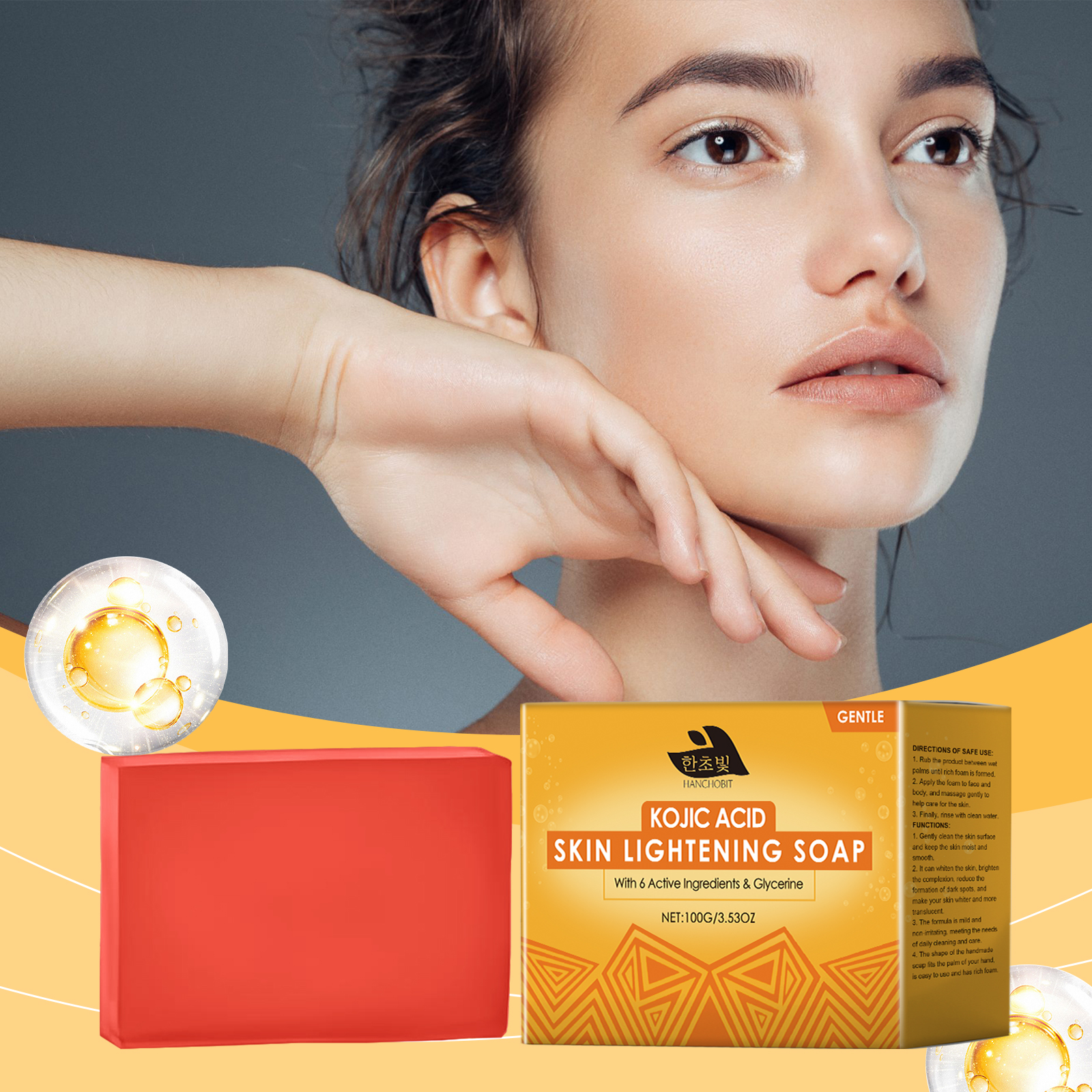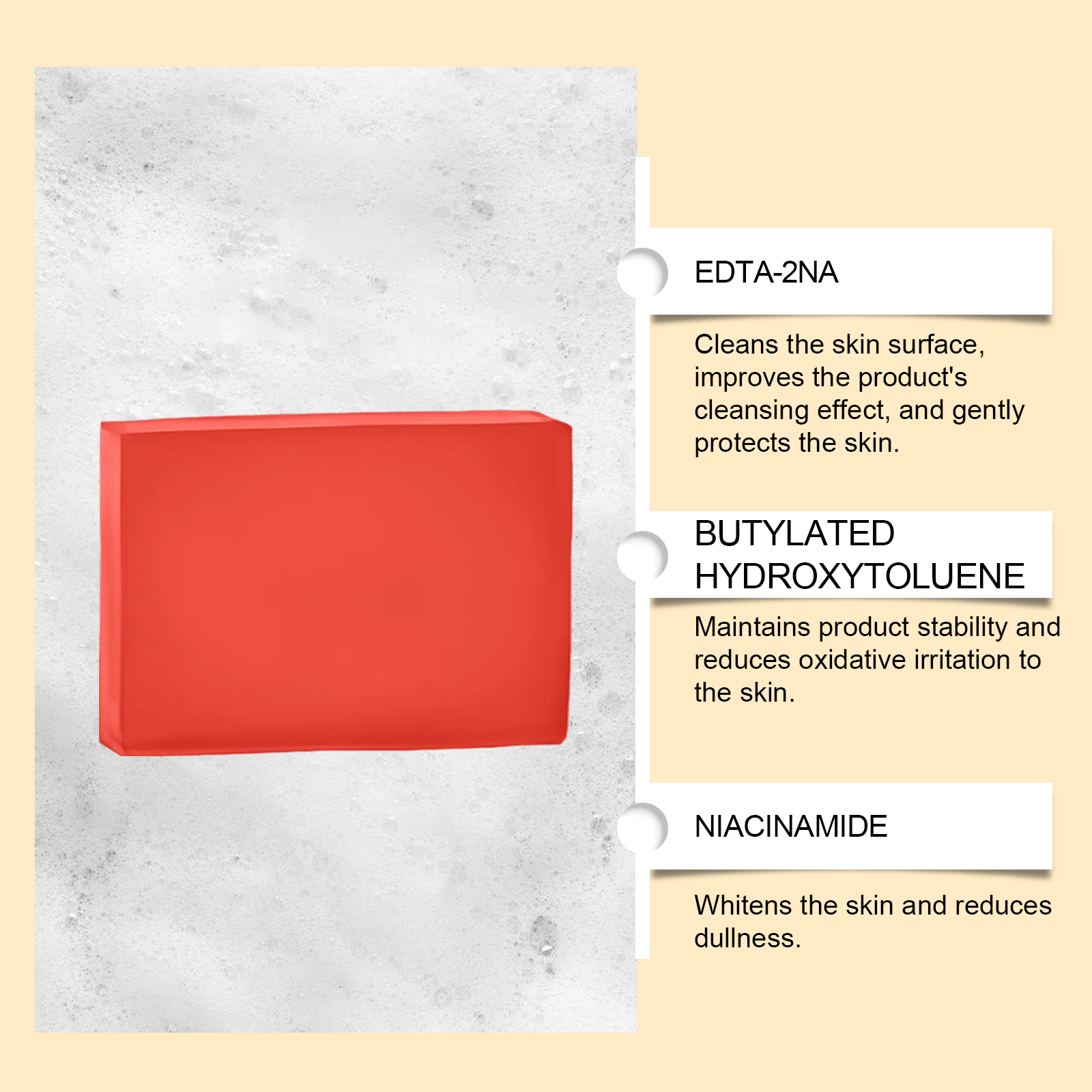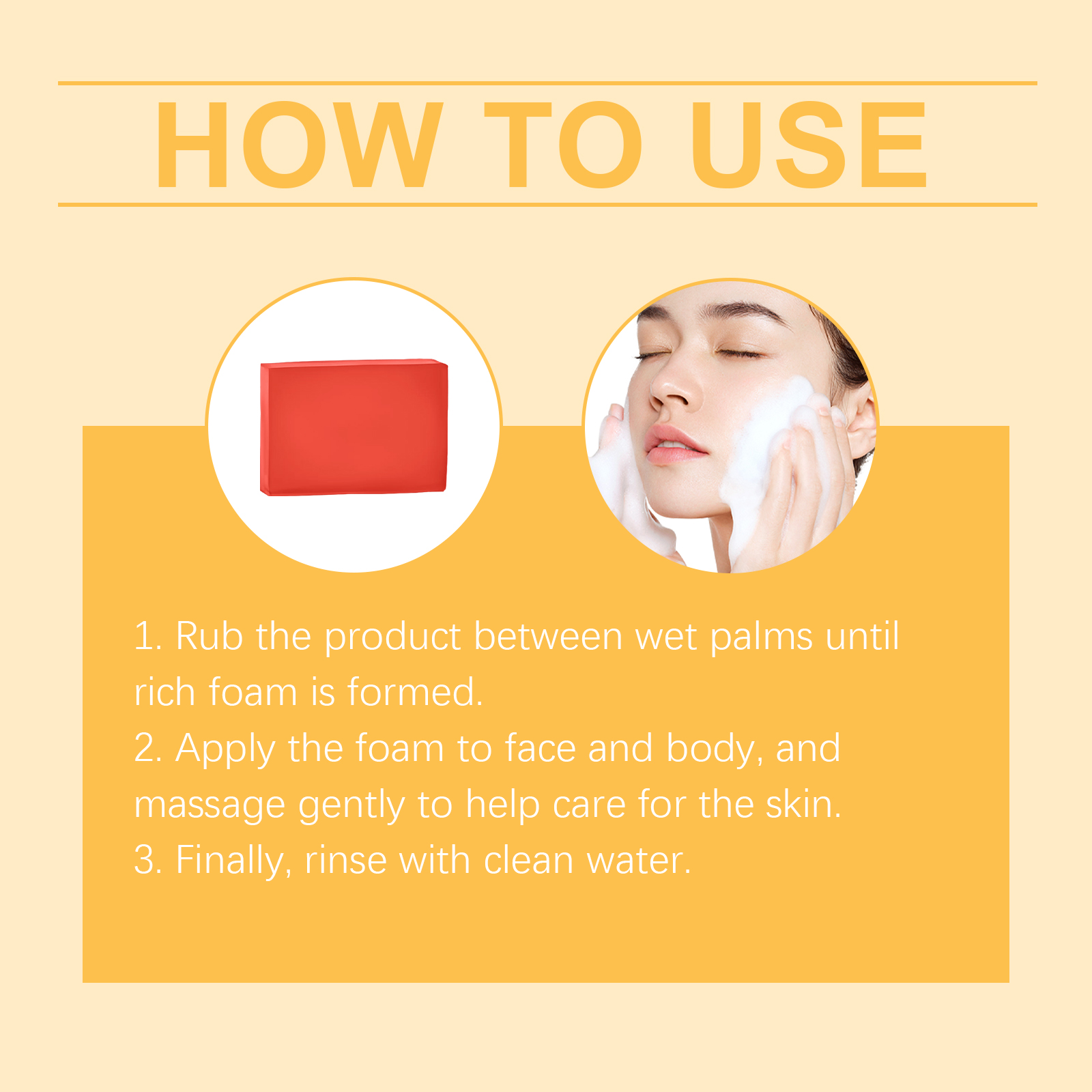 我们的滋润肌肤清洁皂含有抗坏血酸(维生素C)、生育酚(维生素E)。它可以美白和提亮皮肤,让你的皮肤更白。它的使用方法很简单:1.将产品在湿手掌之间摩擦,直到形成丰富的泡沫。2.将泡沫涂抹于面部和身体,并轻轻按摩以帮助护理皮肤。3.最后,用清水冲洗干净。并且用后皮肤感觉更光滑细腻,感觉更舒适。