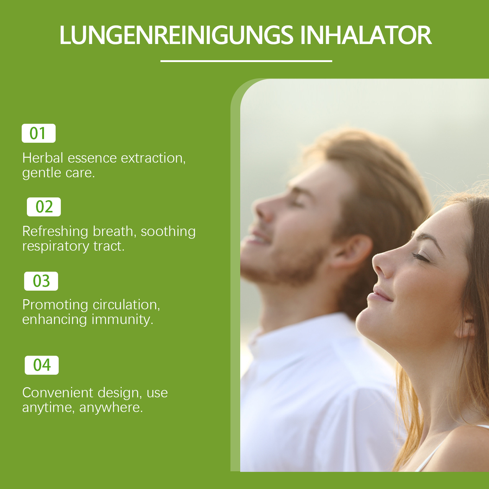 我们的草本吸入器含有PEG-40氢化蓖麻油、苯甲酸钠。它可以有清热作用,有助于净化呼吸道。它富含多种活性成分,舒缓呼吸道,缓解不适。它的使用方法很简单:打开盖子,将产品置于鼻孔下,缓慢吸气5秒,然后缓慢呼气。并且可以减轻呼吸道发红,减少粘液,缓解鼻充血,清新呼吸体验,改善循环,支持肺部修复。