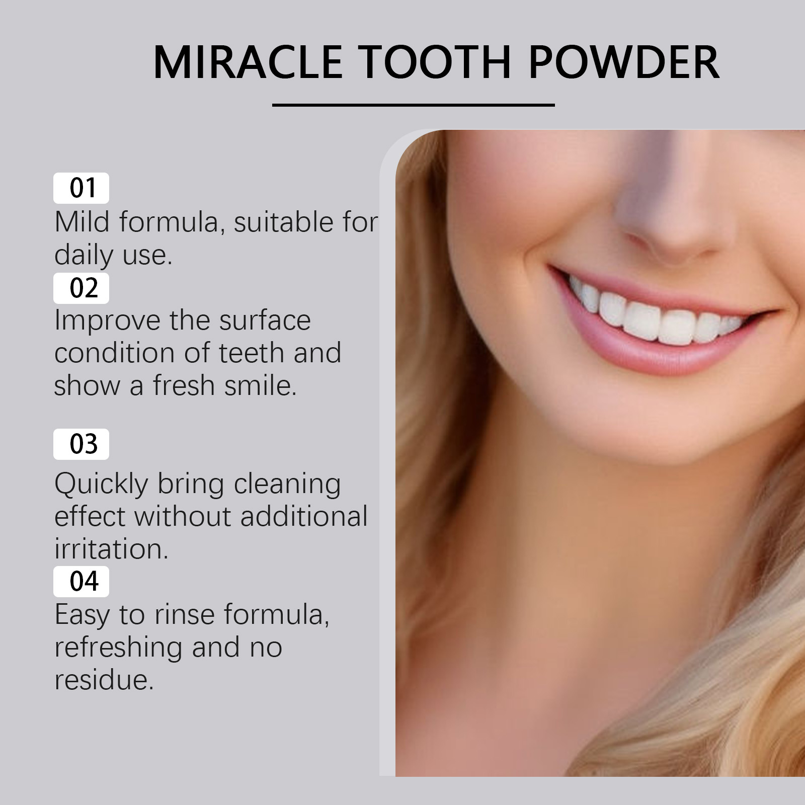 我们的薄荷牙粉含有碳酸氢钠、山梨糖醇。它可以减少牙齿表面的污渍,展现白皙笑容的魅力。带来持久的新鲜感,提高口腔舒适度。它的使用方法很简单:用清水漱口以湿润牙齿。在湿牙刷上放适量的牙粉,刷牙2-3分钟。用清水漱口直到干净。并且可以改善牙齿的白度,恢复健康的光泽,让你的笑容更加自信和迷人。
