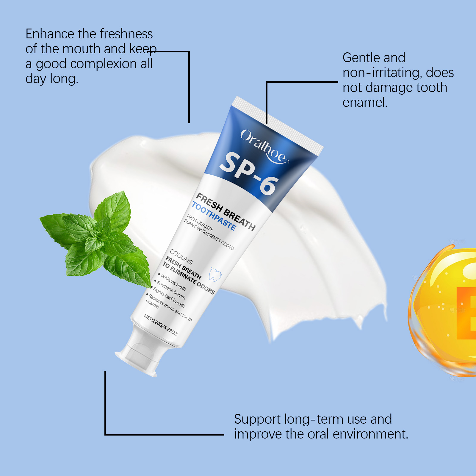 我们的薄荷牙膏含有去离子水、甘油。它可以清洁牙齿表面,减少沉积,保持口腔清新。防止牙垢堆积,保持牙齿光洁。它的使用方法很简单:用清水漱口,使牙齿湿润。在湿牙刷上放适量的牙膏,刷牙2-3分钟。用清水漱口,直到口腔清洁为止。并且可以减少口腔问题,保持口腔清新,并改善整体口腔健康。