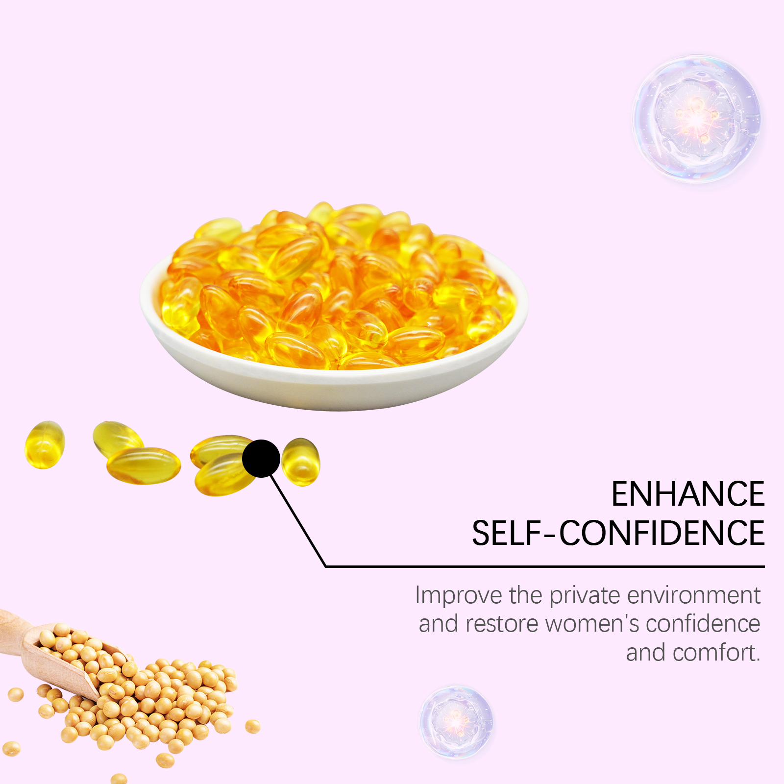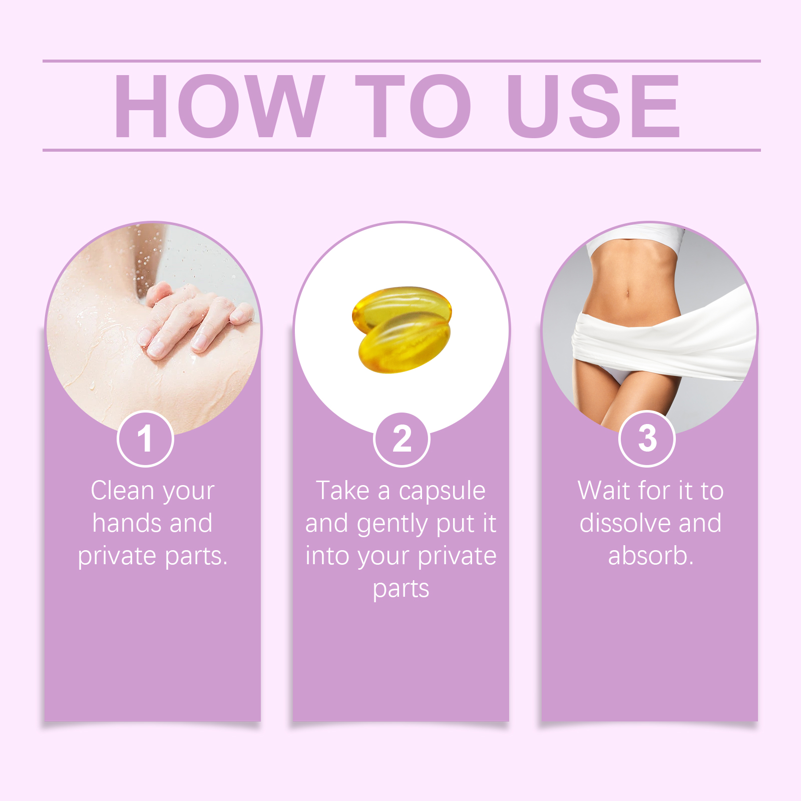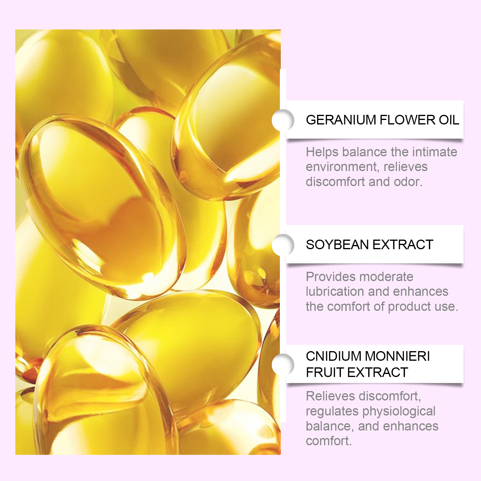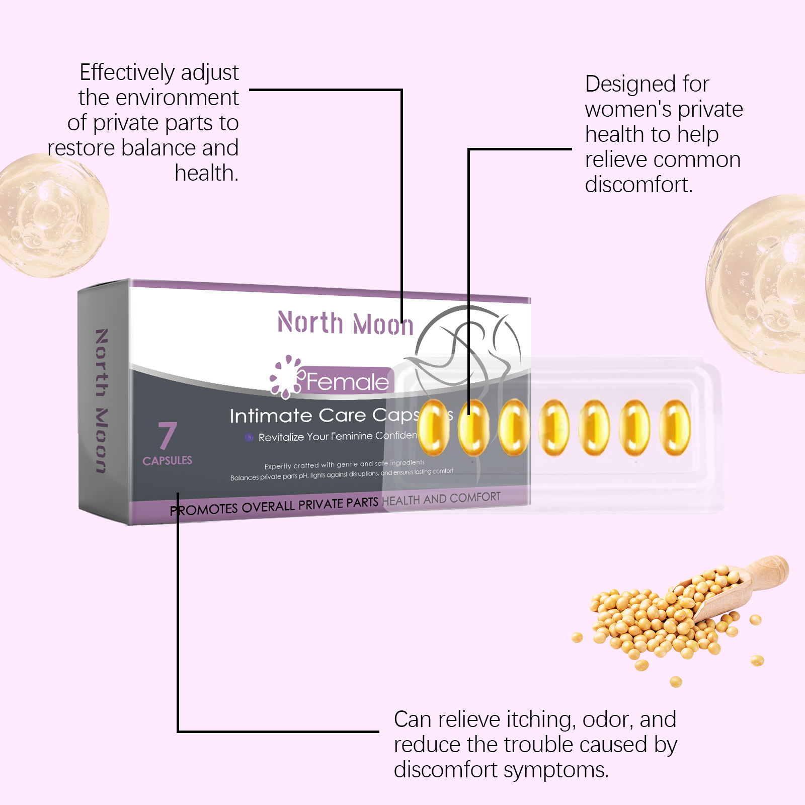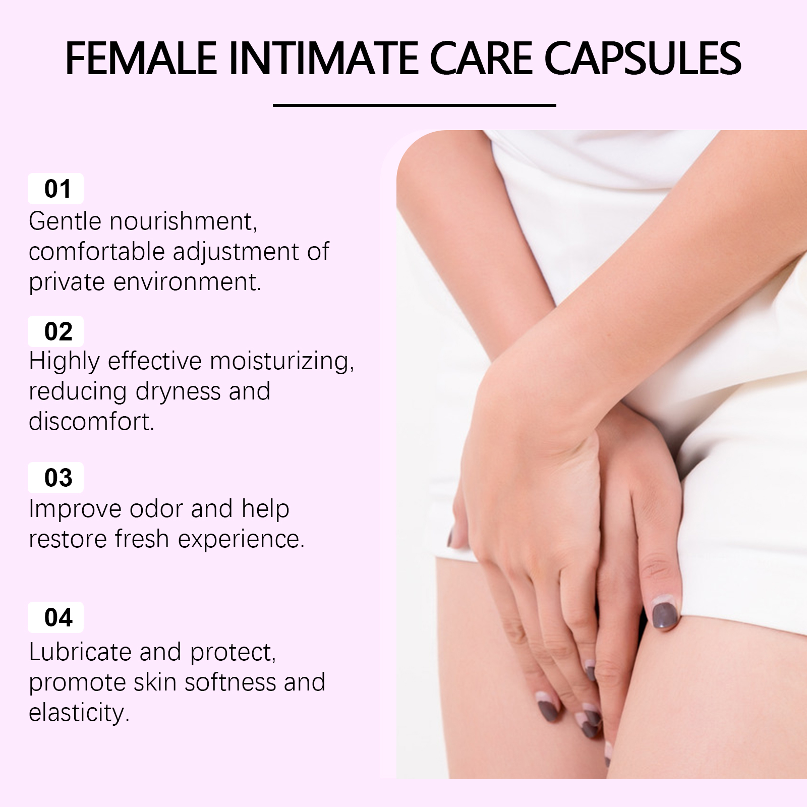 我们的女性身体护理胶囊含有大豆提取物、明胶。它专为女性设计,用于缓解私密区域的异味和不适。调整私人区域的平衡,恢复舒适感。它的使用方法很简单:清洁你的手和私处。取一粒胶囊并轻轻放入你的私处,等待其溶解和吸收。并且可以帮助减少瘙痒和保持干燥。减少月经等引起的不适保持身体舒适和平衡。