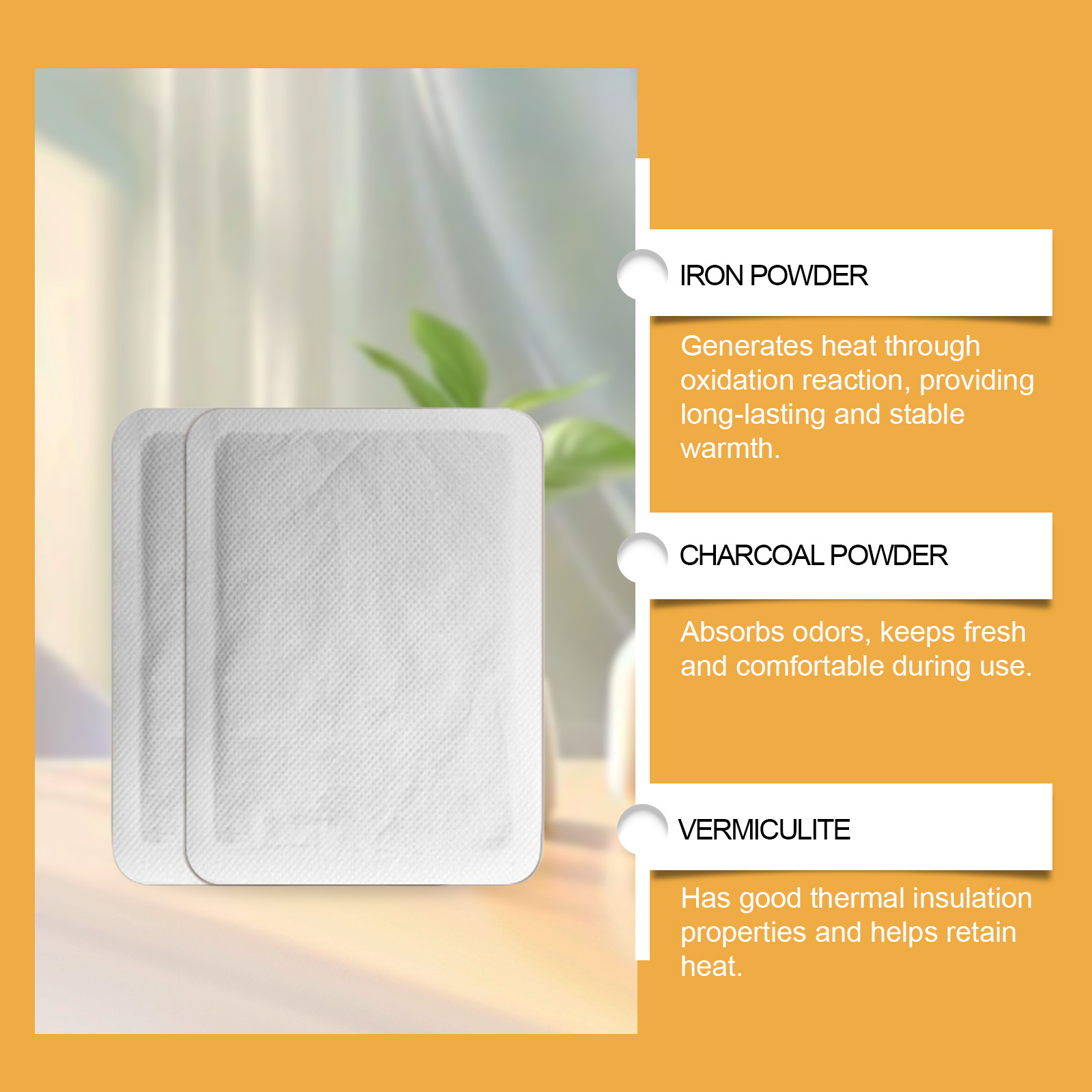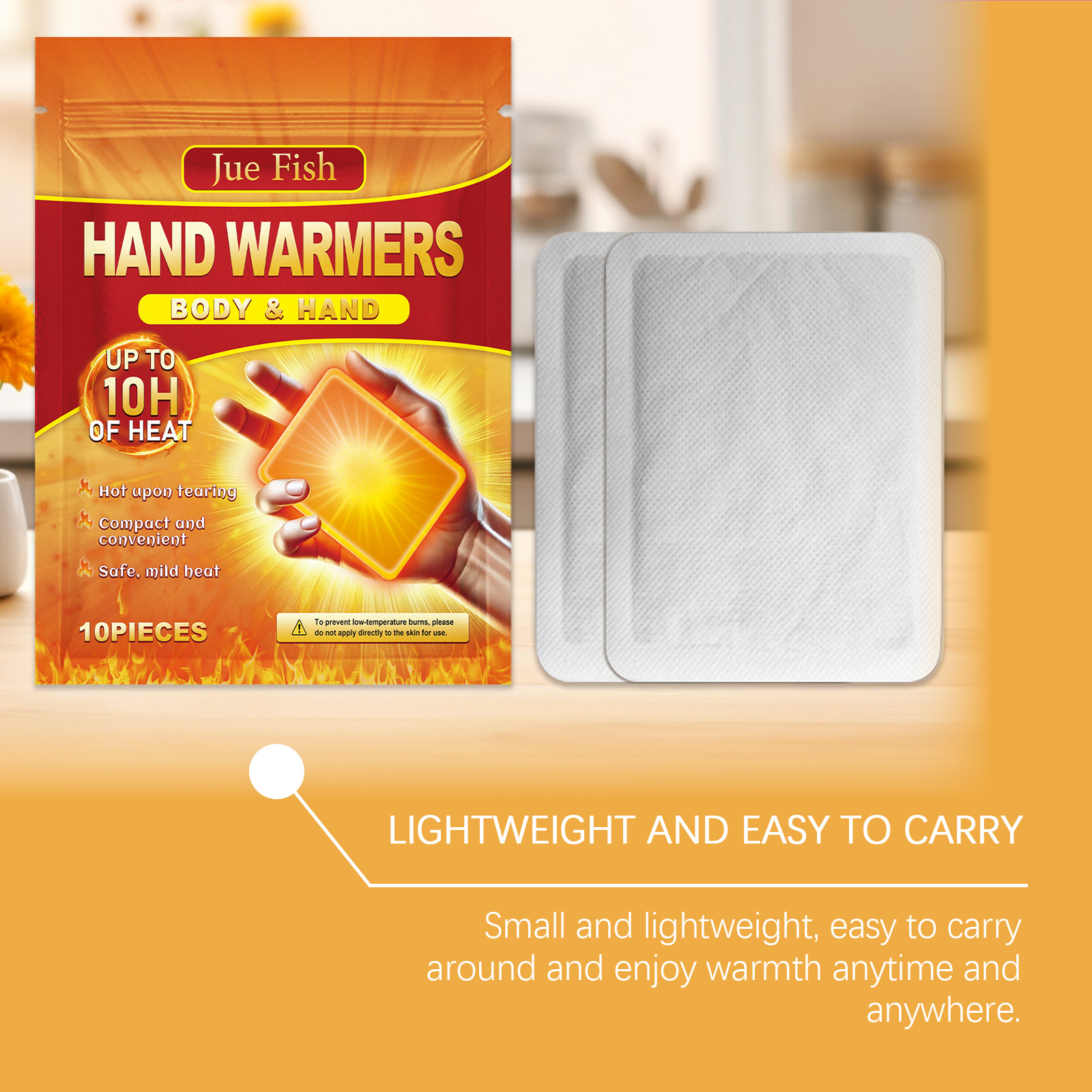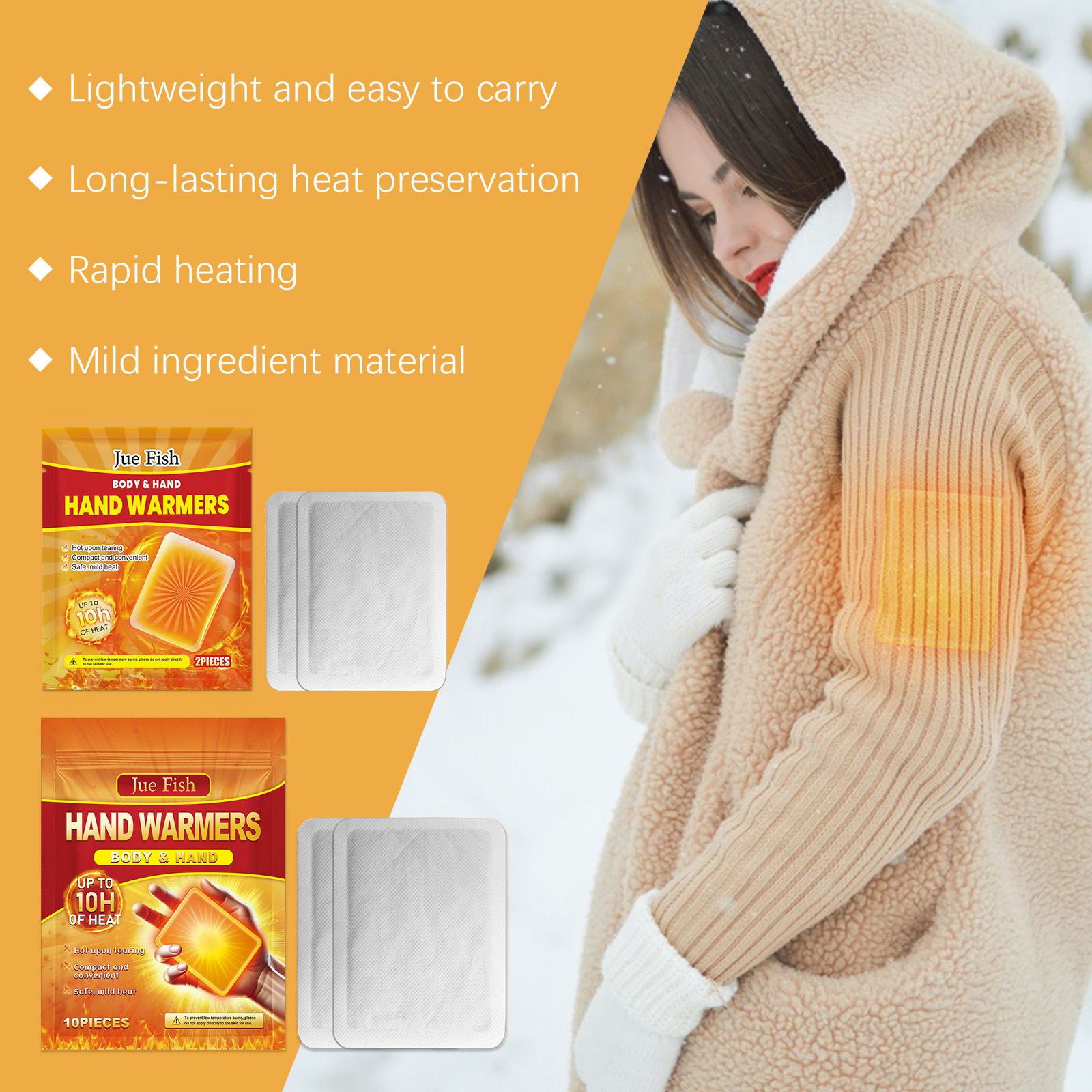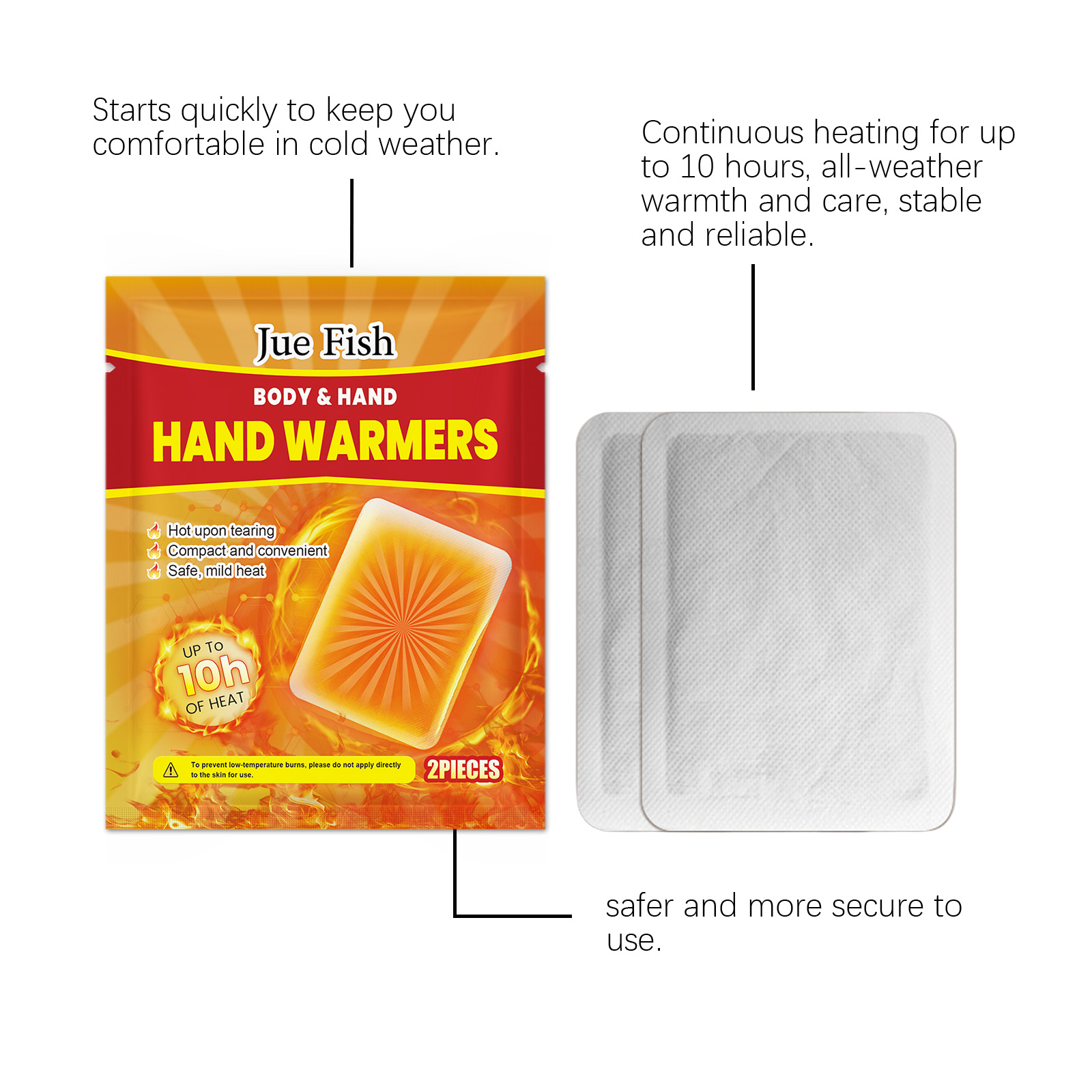 我们的保暖自热贴含有铁粉、炭粉。它可以迅速升温,让你在寒冷的冬天短时间内感到温暖。加热时间长,可持续10个小时,提供全天候的温暖和呵护。它的使用方法很简单:打开包装后,取出贴片,贴在衣服内侧,也可以贴在布料上,放在手上暖手。贴片将在15-30分钟内开始加热,隔热效果可持续10小时。并且可以小巧方便,可以随身携带,随时随地享受温暖。