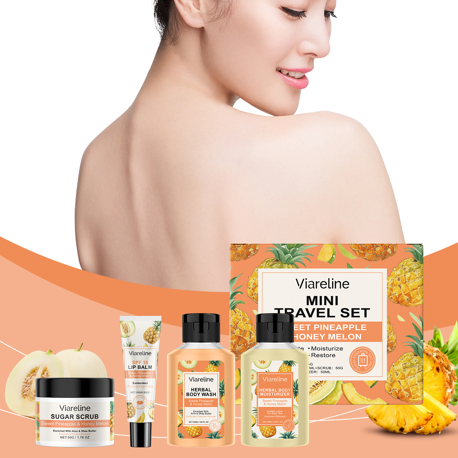 Viareline Sweet Jackfruit Melon Scented Mini Travel Set, Sweet Pineapple Honeydew Melon Scented Cleansing And Moisturizing Skin Travel Portable Set