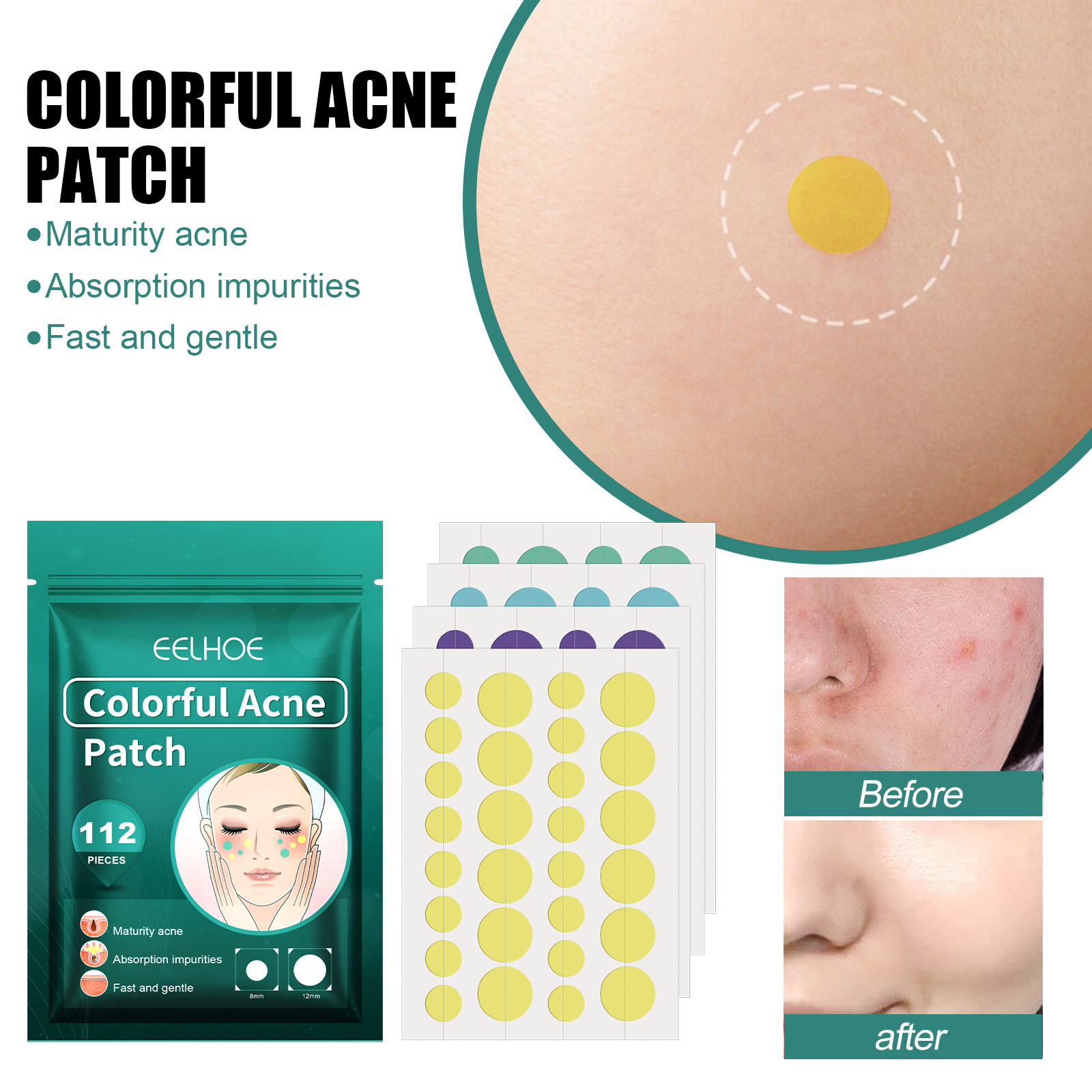 EELHOE Colorful Acne Patch, Clean Facial Impurities Acne Clean Pores Balance Skin Acne Patch