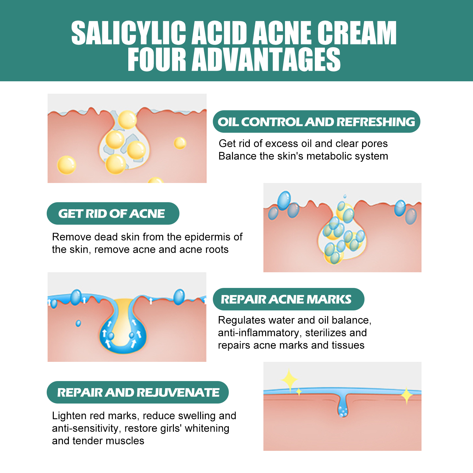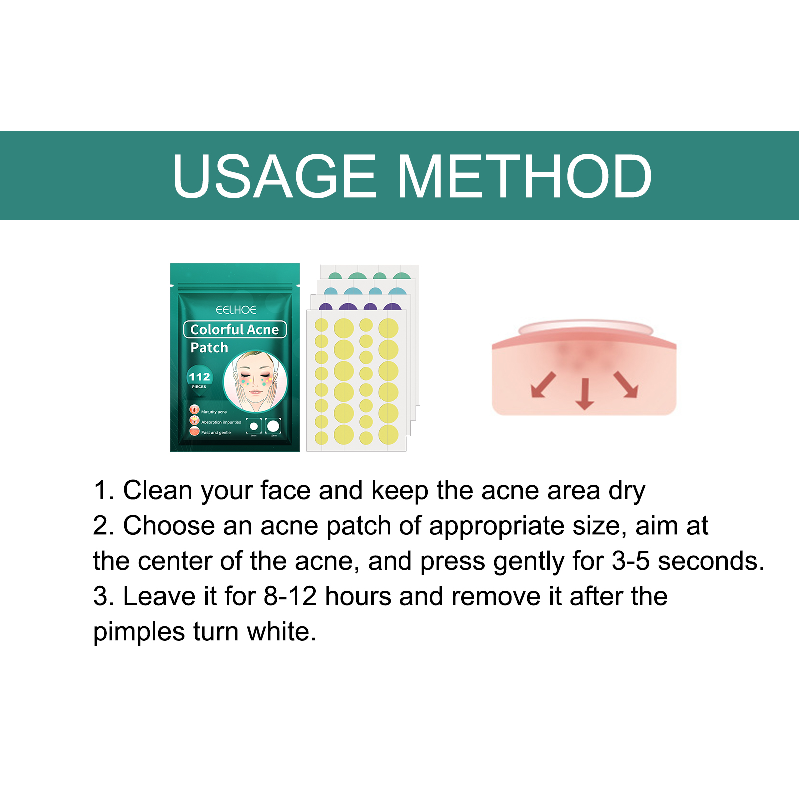 我们的彩色痘痘贴含有水杨酸、互生叶白千层叶油。它可以去除多余油脂,清洁毛孔,平衡肌肤代谢,去除皮肤表皮的死皮,去除粉刺和痤疮的根,调节水油平衡,消炎、消毒和修复痤疮痕迹,淡化红印、消肿、抗敏,恢复少女白哲柔嫩的肌肤。它的使用方法很简单:清洁面部,保持痘痘部位干燥,选择一个大小合适的痘痘贴,对准痘痘中心,轻轻按压3一5秒,静置8-12小时,待痘痘变白后再取下即可。保护受损皮肤,促进痘痘、粉刺愈合,帮助皮肤修复光滑。