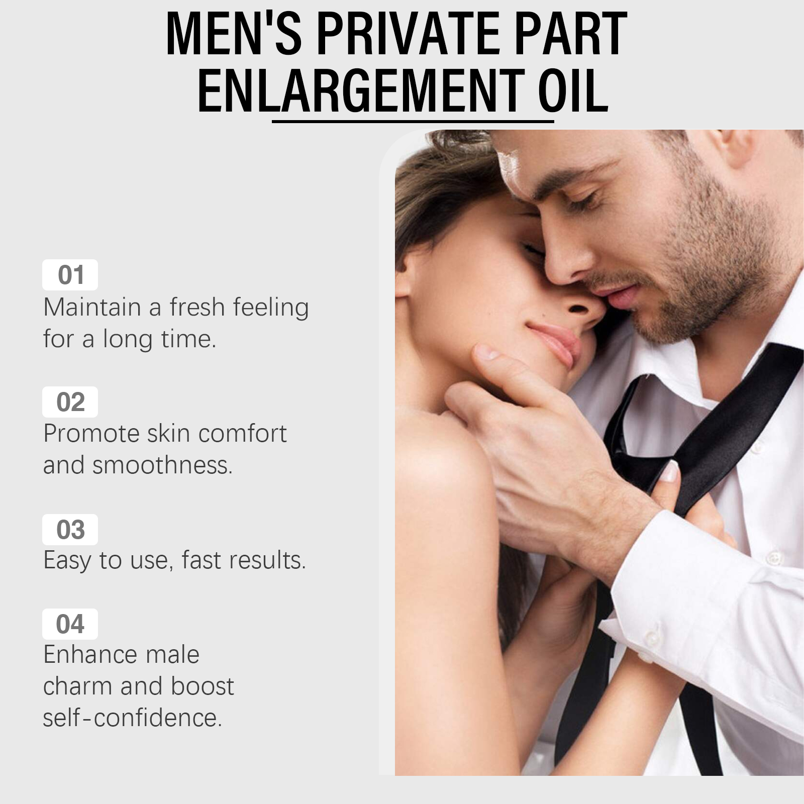 我们的男士身体护理精油含有矿油、甘油。它可以保密包装,尊重隐私配方透明,使用后2无痕迹。无需冲洗,使用方便。日常使用或特殊时刻保护肌肤免受外界影响。小巧的包装设计,方便旅行。它的使用方法很简单:清洁私密皮肤并保持干燥。取适量本品均匀涂抹于私处肌肤,轻轻按摩直到完全吸收。并且可以专为男性设计的护理产品。透明配方,使用后无痕迹。