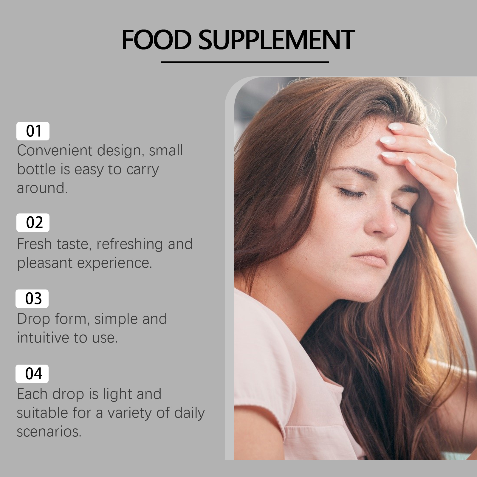 我们的免疫力增强补充滴剂含有葡萄糖酸内脂、山梨酸钾、维生素b1。它可以帮助优化免疫系统的效率,更容易增强抵抗力。它的使用方法很简单:食用前请先摇匀,每次1-2滴,每日1-2次。并且可以改善体内平衡,优化代谢功能,帮助每日活力。