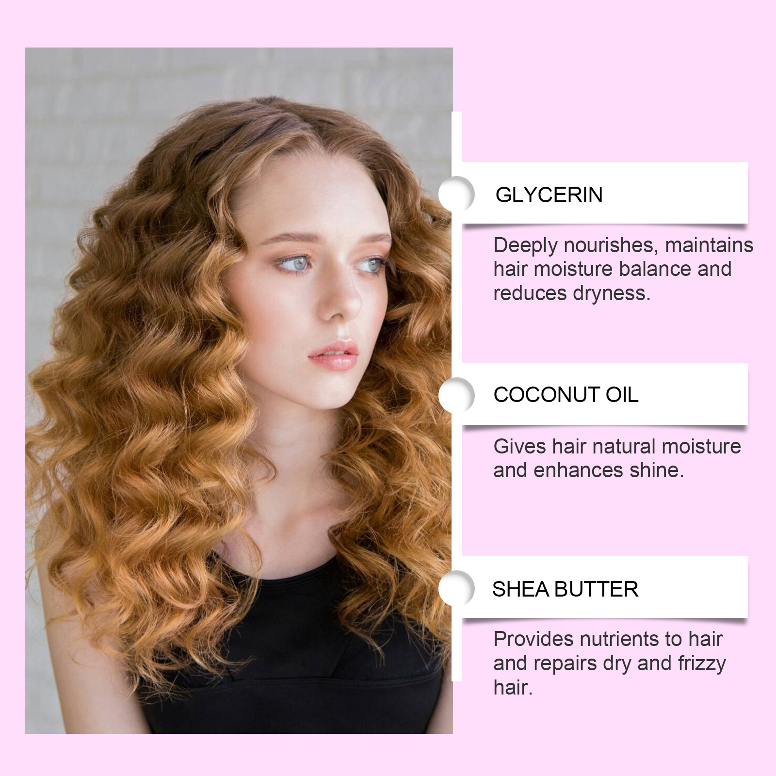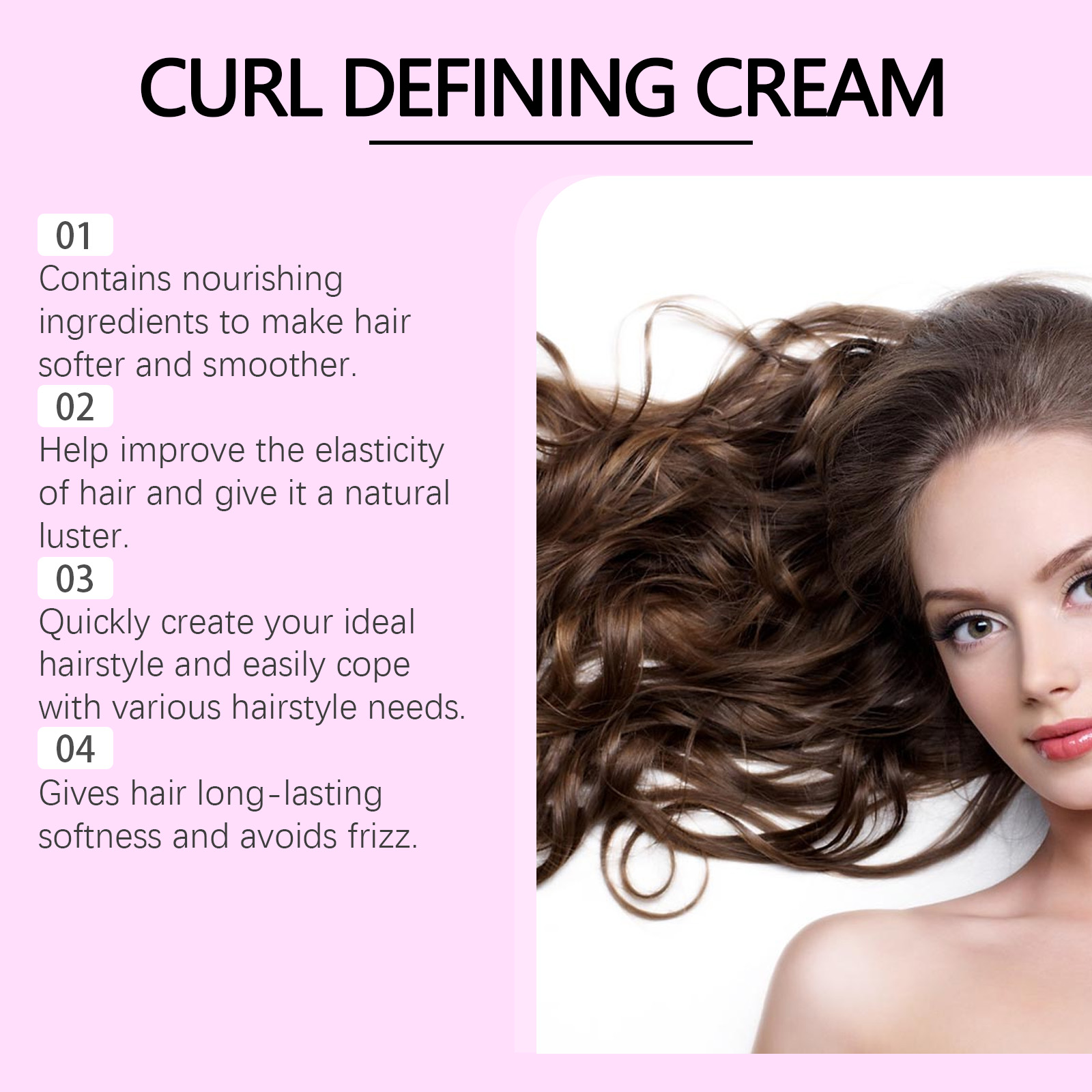 我们的卷发护理定型霜含有甘油、乳木果油、椰子油。它可以让每一根头发都充满活力。它的使用方法很简单:洗发后,将湿发吹至半干,使其蓬松。取适量本品,涂抹在手掌上,从头发中间到头发顶部,均匀地涂在头发上。双手插入头发的尖端,向上抓,直到头发轻轻地向尖端扭动,然后再向上抓。并且可以有助于发型长时间保持不变。