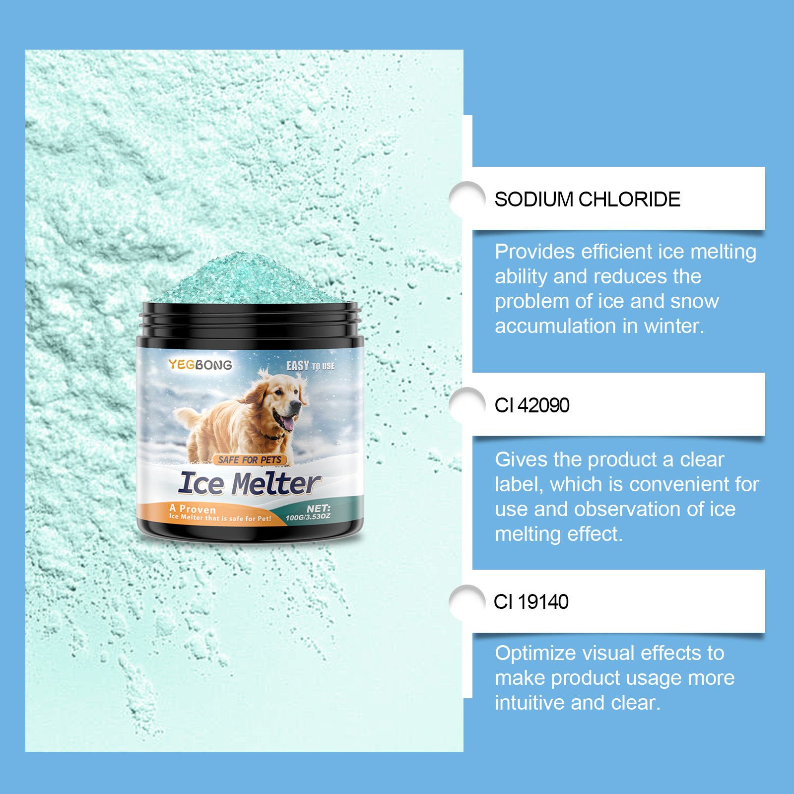 我们的宠物友好型融冰剂含有氯化钠、CI42090、CI19140。它可以有效融化冰雪,同时减少对环境和植被的潜在影响。它采用特殊配方,不会刺激宠物爪垫,减少冬季使用时对宠物可能造成的伤害。它的使用方法很简单:将本品均匀地洒在待处理的表面。冰融化后,建议及时清除泥水,防止再次结冰。并且可以冰融化后易于清洗,不留下有害残留物,保持清洁无忧。