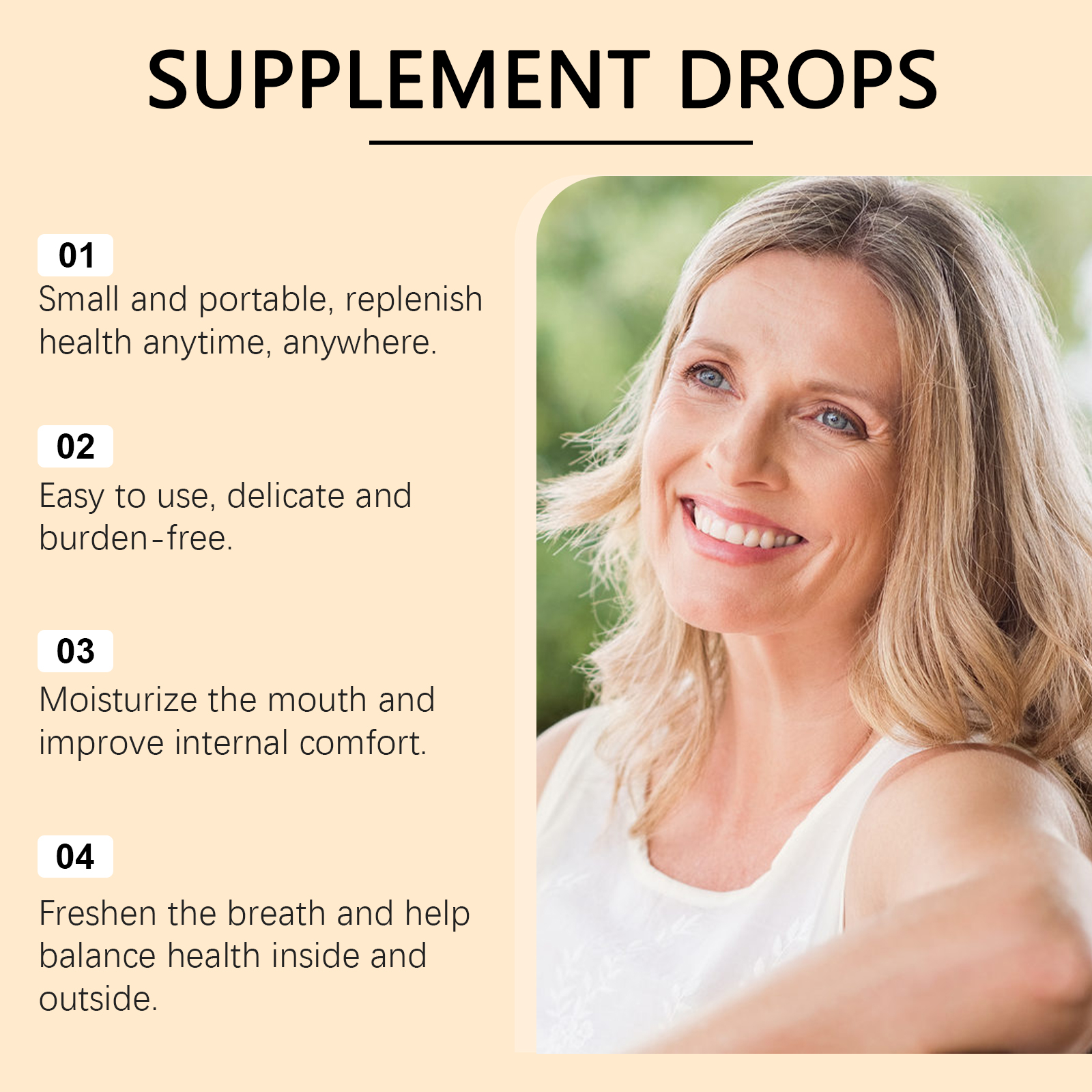 我们的维生素补充滴剂含有薄荷提取液、中药提取物、葡萄糖酸内脂。它可以保持身体平衡,使日常生活更加高效和轻松。它的使用方法很简单:食用前请先摇匀,每次1-2滴,每日1-2次。并且采用小瓶设计,方便随身携带,随时随地使用。