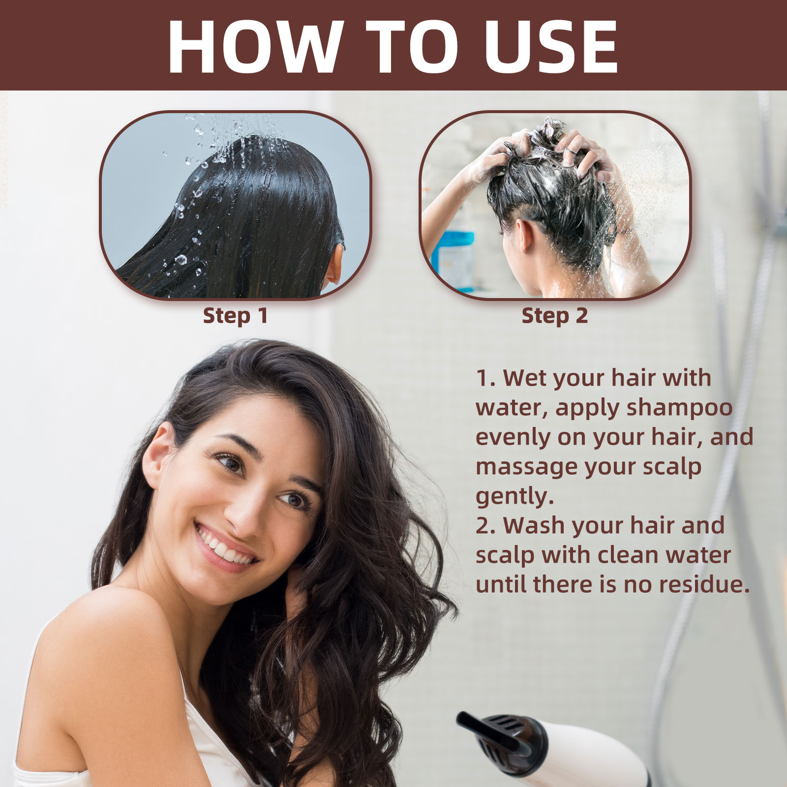 我们的何首乌洗发水含有姜提取物、何首乌根提取物。它可以滋养和保护头发,还能改善毛囊的健康,促进头发生长,滋润发根,提亮发质,掩盖您的白发,还您一头乌黑亮泽的秀发。它的使用方法很简单:用水浸湿头发,将洗发水均匀涂抹在头发上,并轻轻按摩头皮,最后用清水洗净头发和头皮直到没有残留即可。可以深度滋养发根,有效控油,使头发看起来更加蓬松有光泽。
