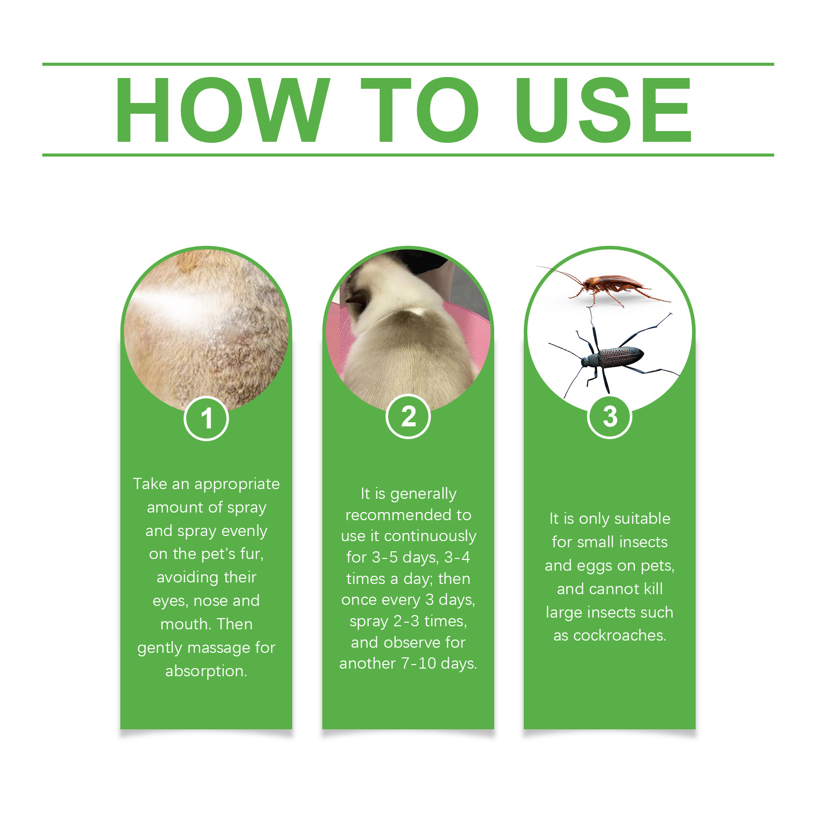 我们的宠物体外驱虫喷雾含有柠檬提取物、薰衣草提取物。它可以保护宠物免受各种害虫的侵害。动作快,见效快。它的使用方法很简单:取适量喷雾,均匀喷在宠物的毛皮上,避开他们的眼睛、鼻子和嘴巴,然后轻轻按摩以吸收。一般建议连续使用3-5天,每天3-4次,然后每3天一次,喷2-3次,再观察7-10天。它只适用于宠物身上的小虫子和卵,不能杀死蟑螂等大昆虫。并且可以有效杀灭跳蚤、跳蚤卵、跳蚤幼虫、蜱、床虱虱子和尘螨,充分保护宠物的健康。