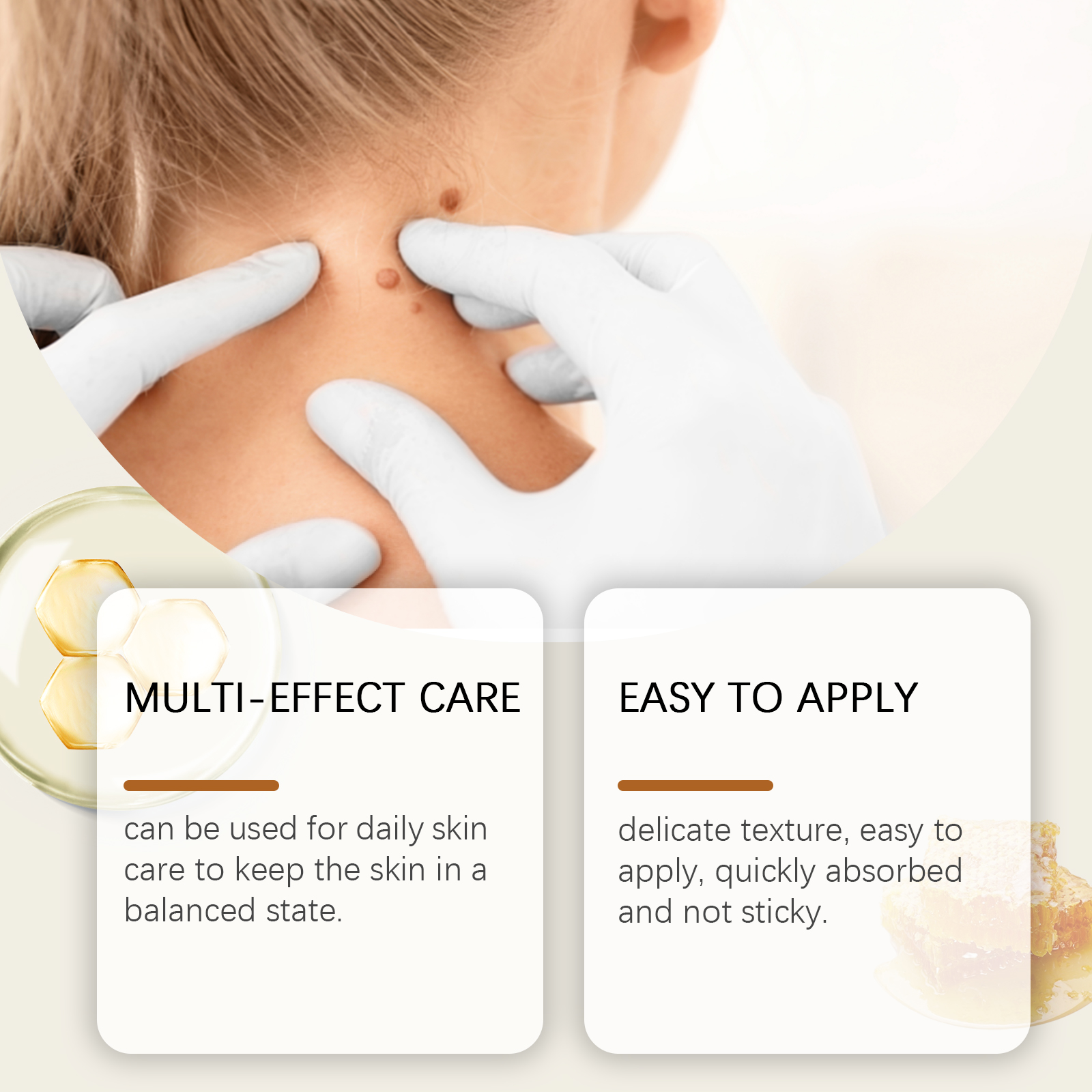 我们的皮肤护理霜含有蜂毒、茶树油。它可用于日常护肤,保持肌肤平衡状态。质地细腻,易于涂抹,吸收快不粘腻。它的使用方法很简单:清洁并干燥皮肤,将适量本品涂抹于身体的皮肤上,并轻轻按摩以促进吸收。并且可以快速无痛去除皮肤斑点、疣、痣和瑕疵;缓解静脉曲张,让腿更舒适;缓解红肿和瘙痒。