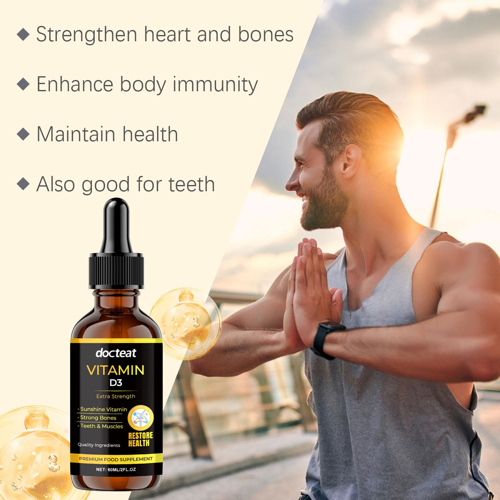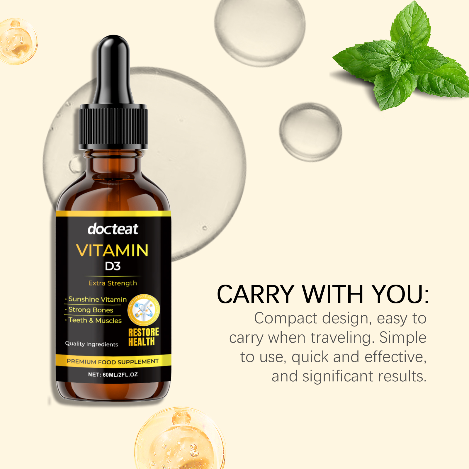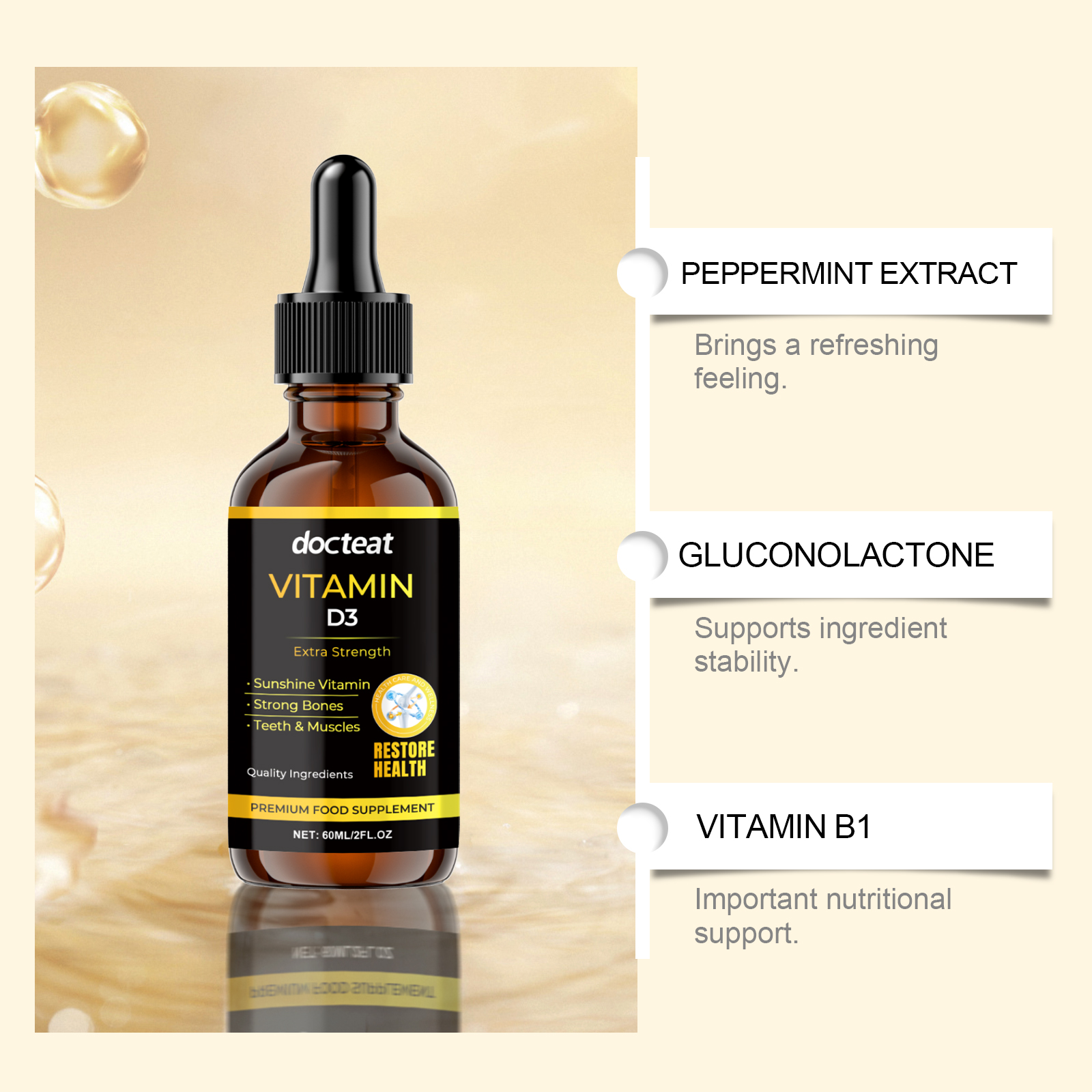 我们的骨骼增强补充滴剂含有葡萄糖酸内脂、山梨酸钾、维生素b1。它可以帮助保持身体平衡,使日常生活更加高效和轻松。它的使用方法很简单:食用前请先摇匀,每次1-2滴,每日1-2次。并且易于使用的滴状,简单而有效。
