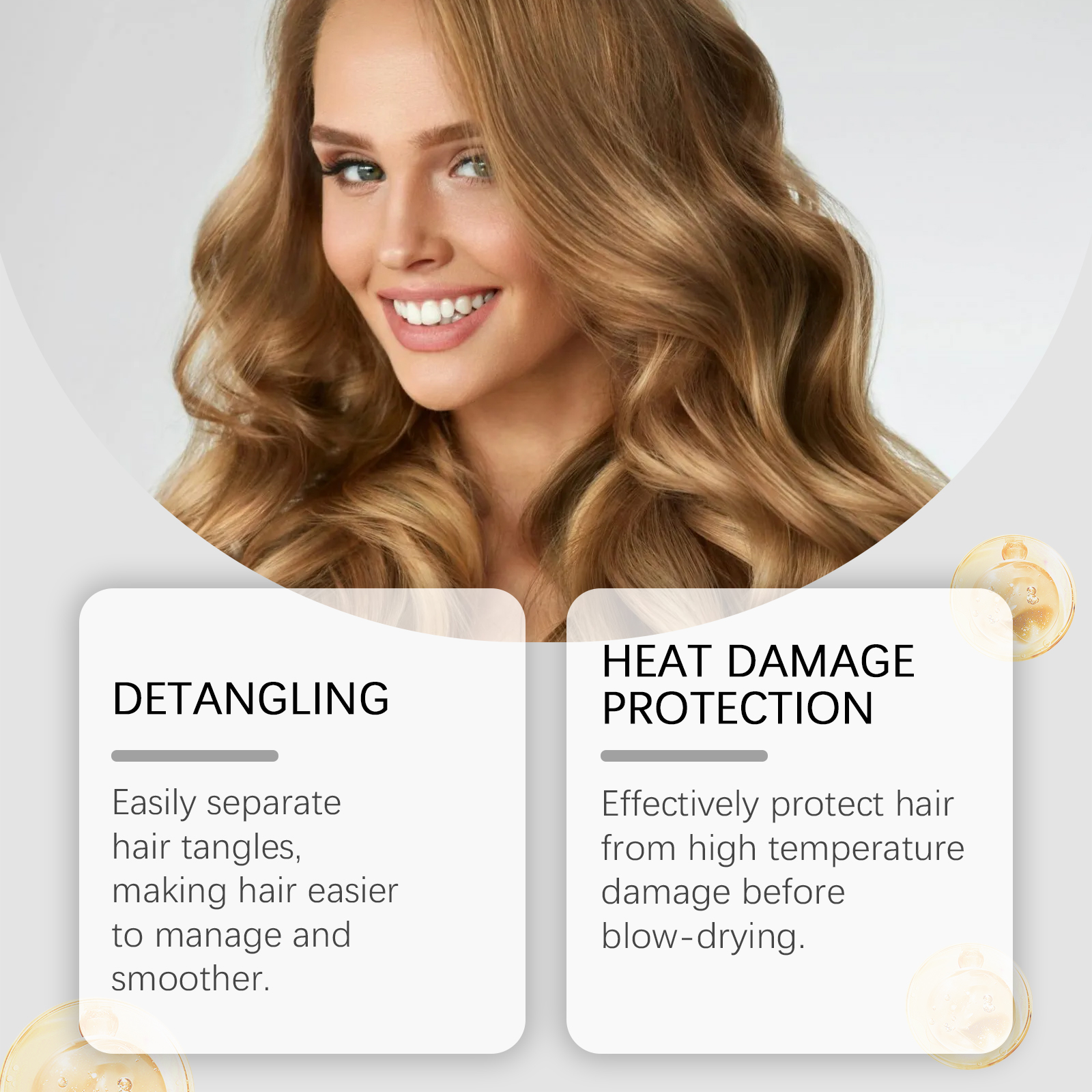 我们的免洗护发喷雾含有椰子提取物、燕麦提取物。它可以轻松分离头发缠结,使头发更易于管理,更光滑。它的使用方法很简单:1.清洁你的头发。2.将适量本品喷于头发上,等待吸收。并且可以有效保护头发,免受高温伤害。