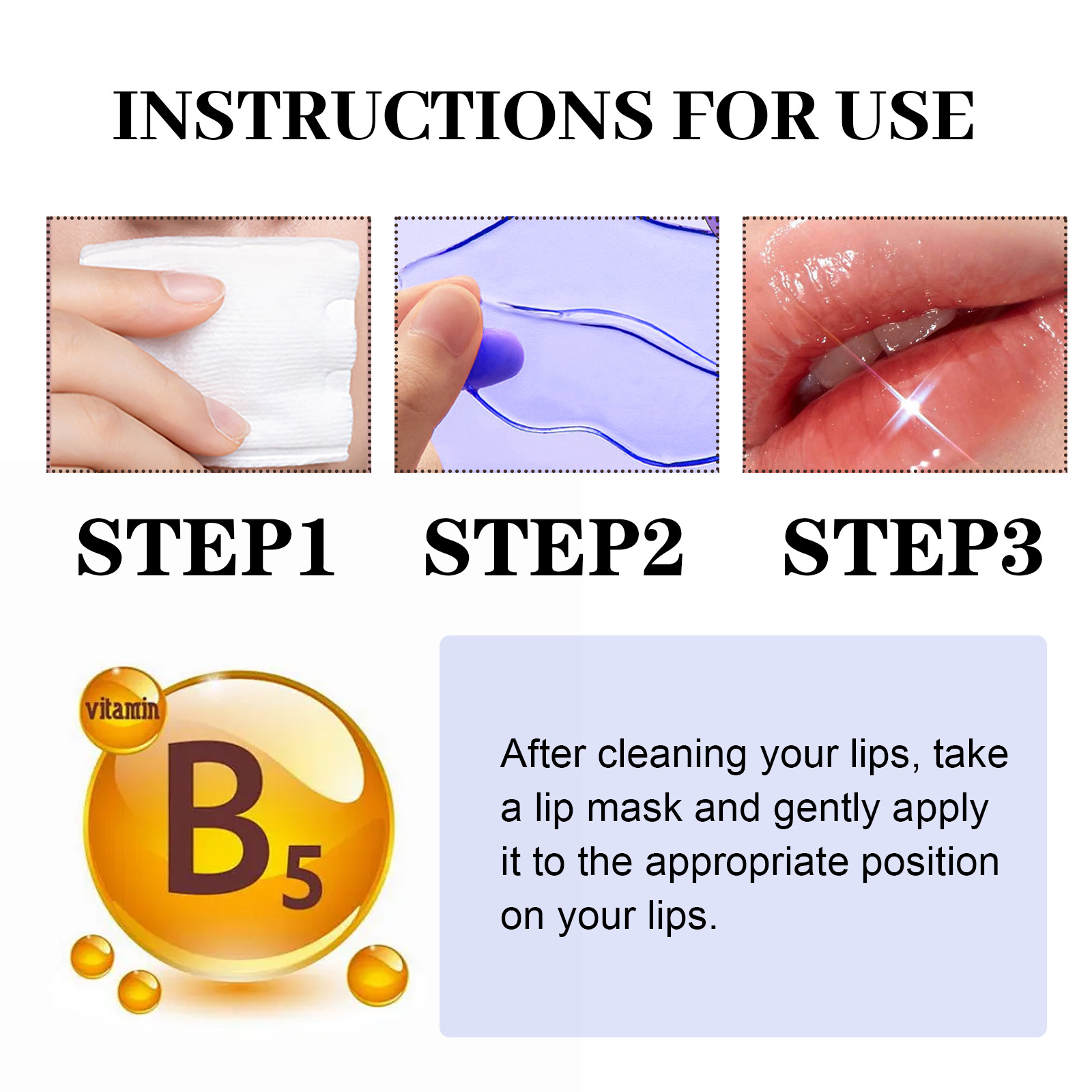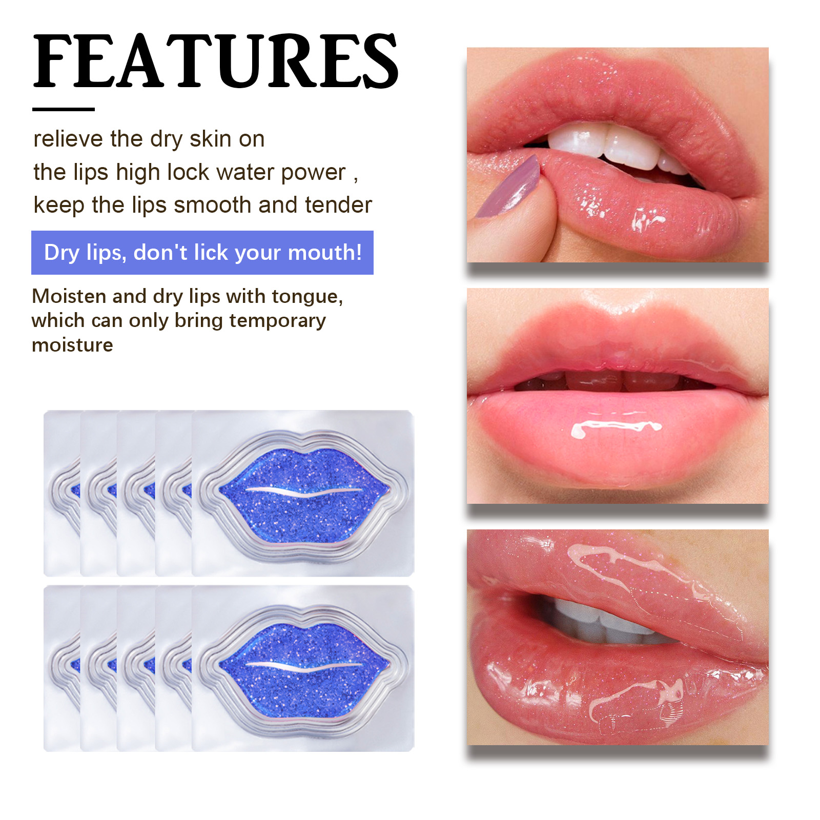 我们的保湿唇膜贴含有B5、胶原蛋白、透明质酸。它可以深层保湿,温和去除角质,减少唇部皱纹,平滑唇部,增强唇部弹性,使您的唇部更加丰盈饱满。它的使用方法很简单:清洁唇部后,取一个唇部面膜,轻轻地敷在唇部的适当位置即可。可以改善干燥脱皮,滋润嘴唇,恢复和保护娇嫩的唇部皮肤。