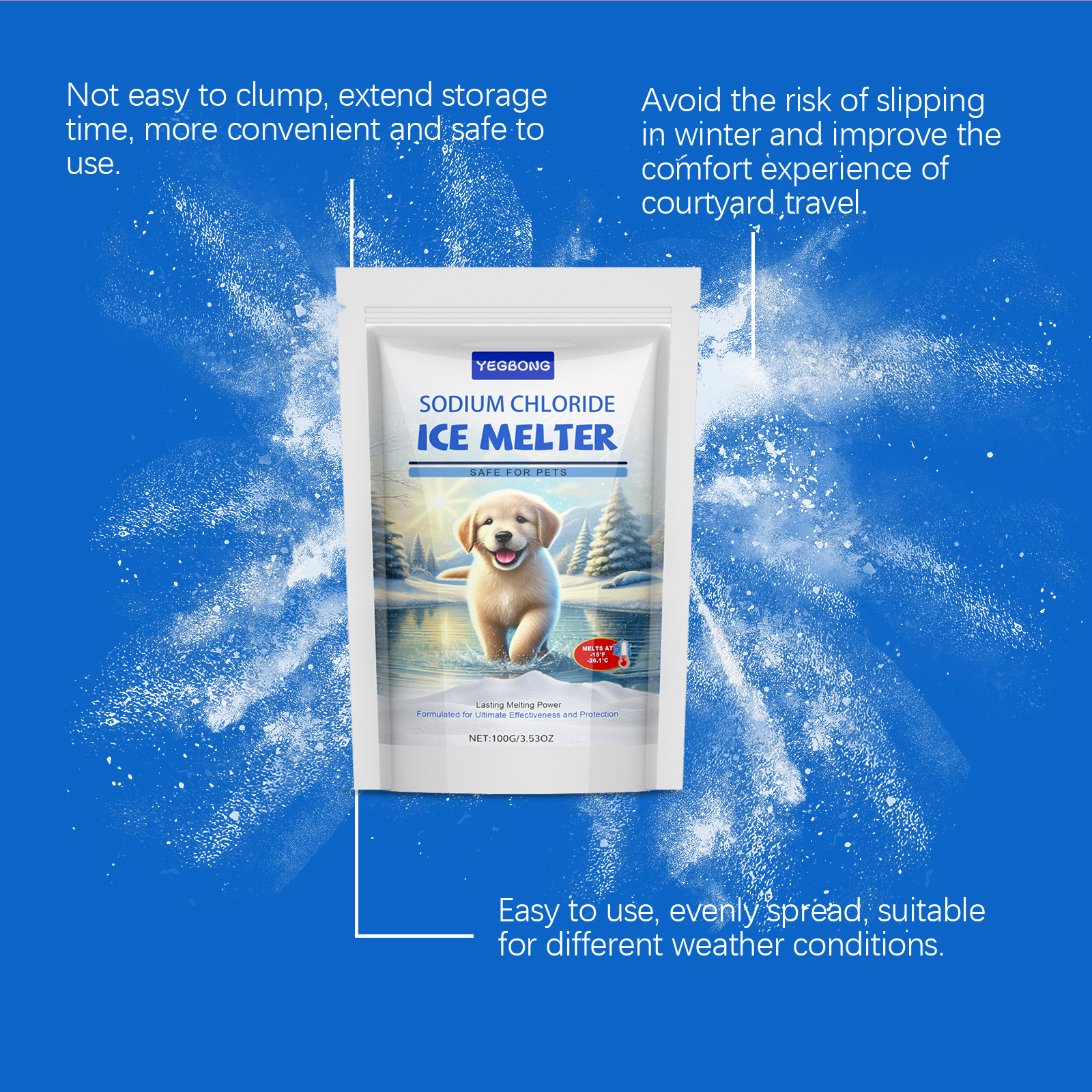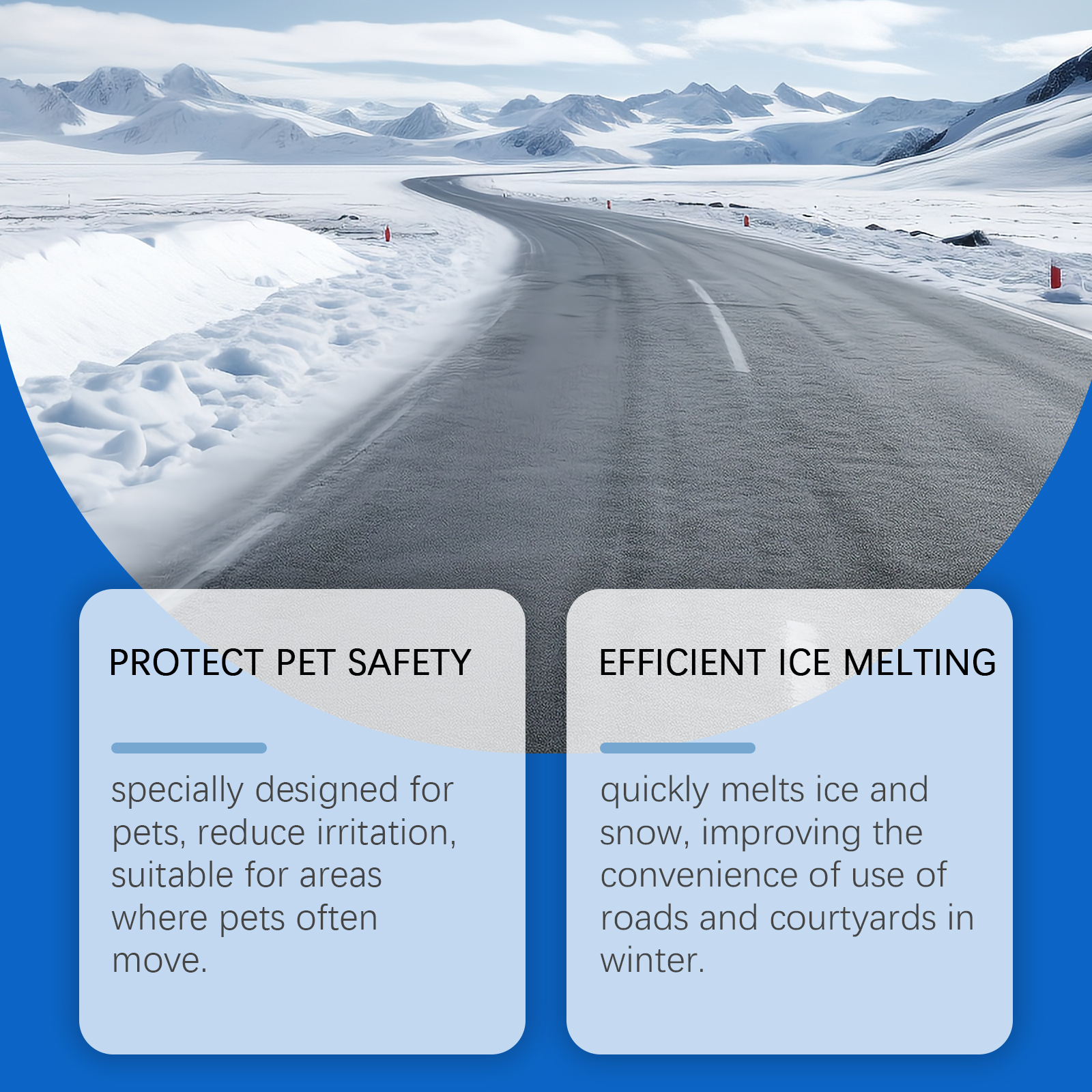 我们的宠物融冰剂含有氯化钠。它可以专为宠物设计,减少刺激,适合宠物经常移动的区域。迅速融化冰雪,提高冬季道路和庭院的使用便利性。它的使用方法很简单:将适量本品均匀洒在待处理的表面。冰融化后,建议及时清除泥水,防止再次结冰。并且它可以快速融化冰和雪,具有持久的融化能力,同时减少对环境和植被的潜在影响。
