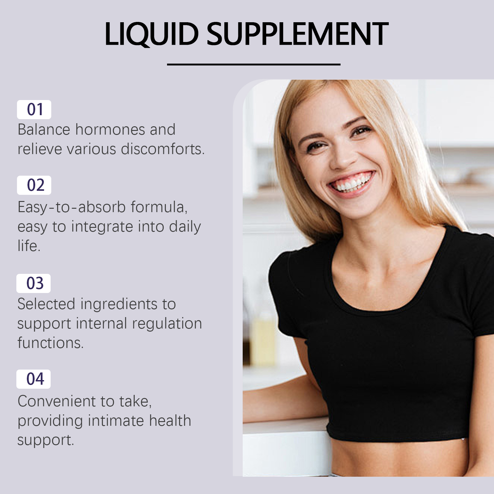 我们的女性激素平衡滴剂含有葡萄糖酸内脂、山梨酸钾、维生素b1。它可以调节激素水平,支持女性健康,缓解日常烦恼。它的使用方法很简单:食用前请先摇匀,每次1-2滴,每日1-2次。并且可以缓解身心压力,让生活更轻松愉快。