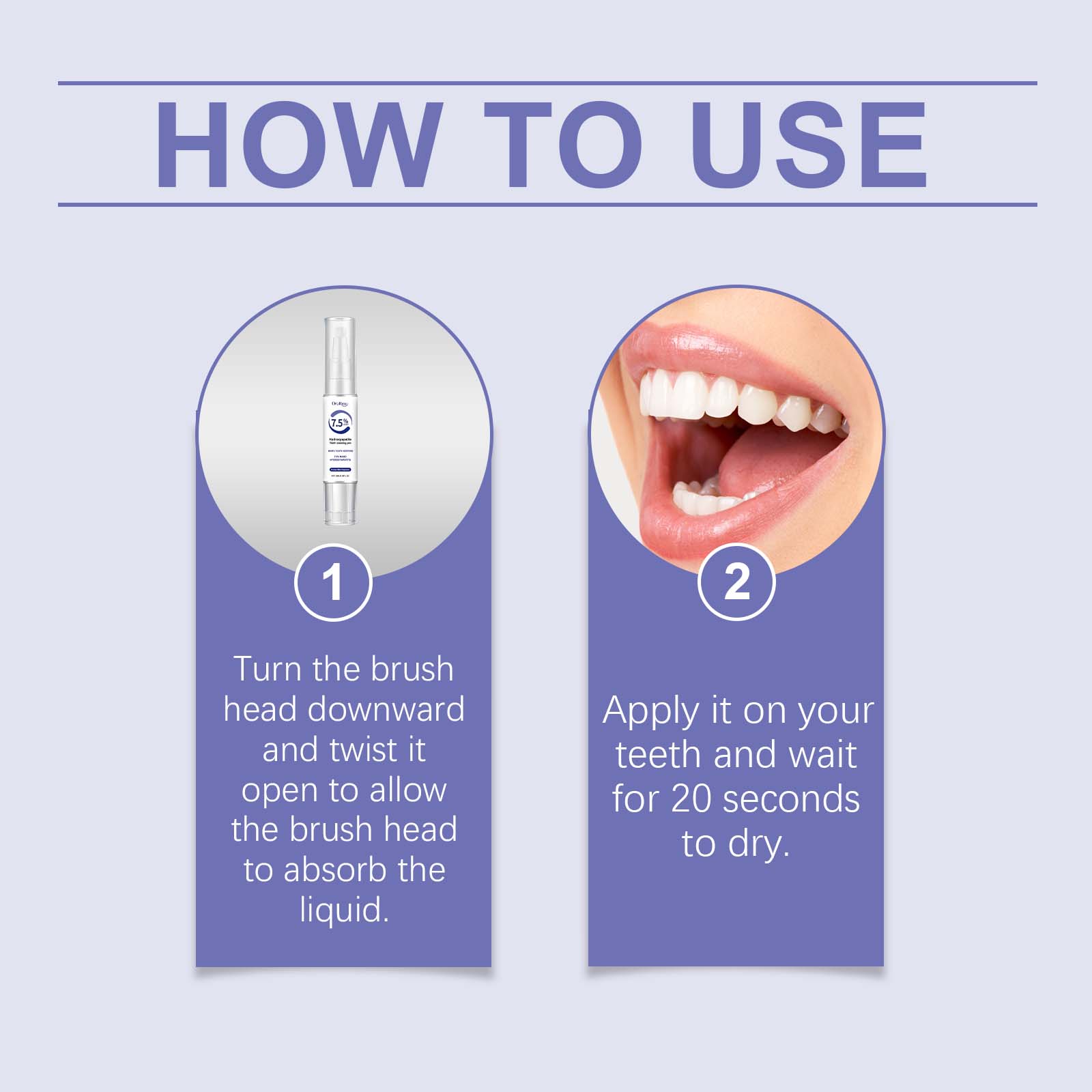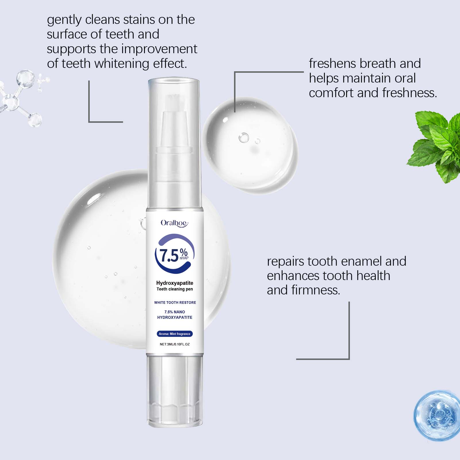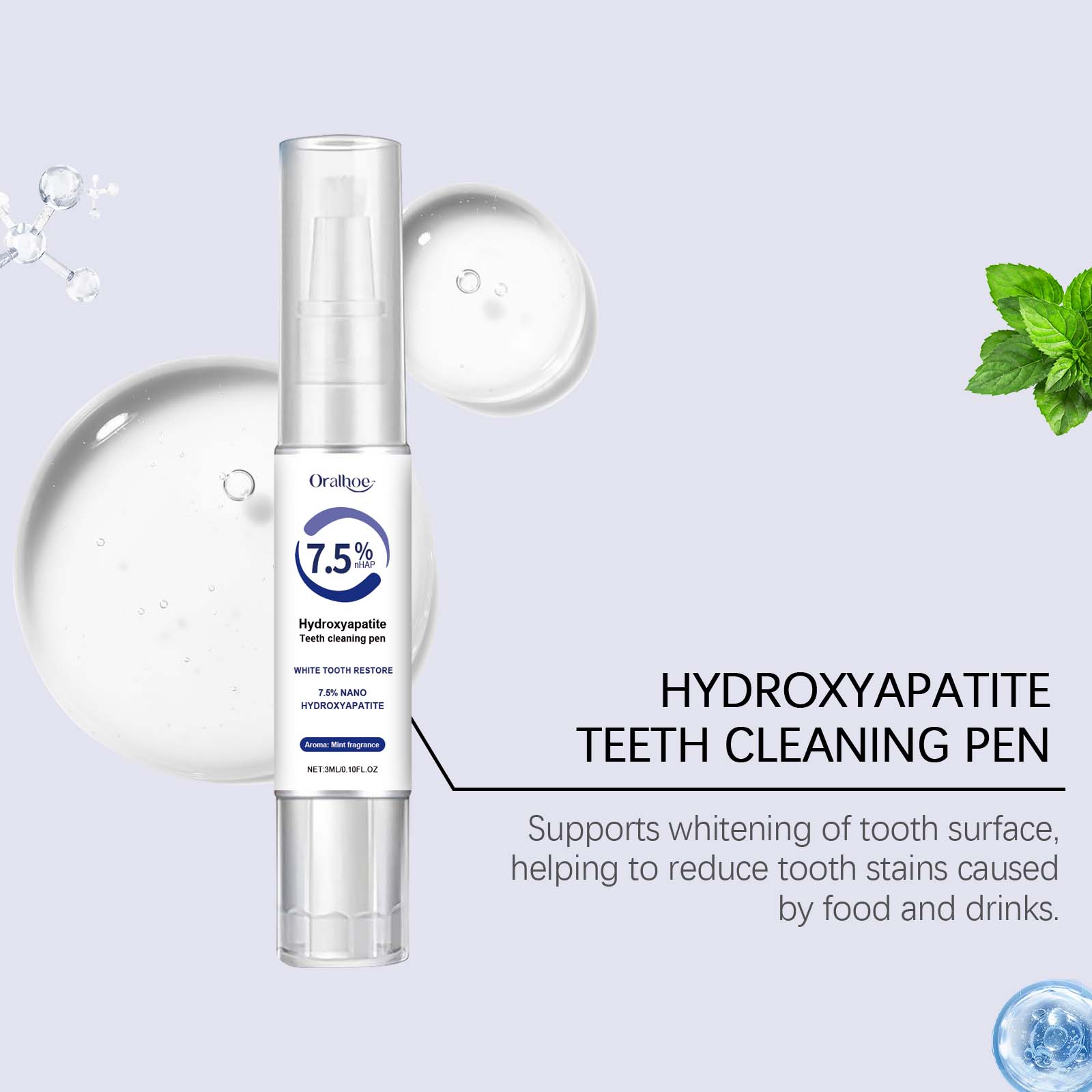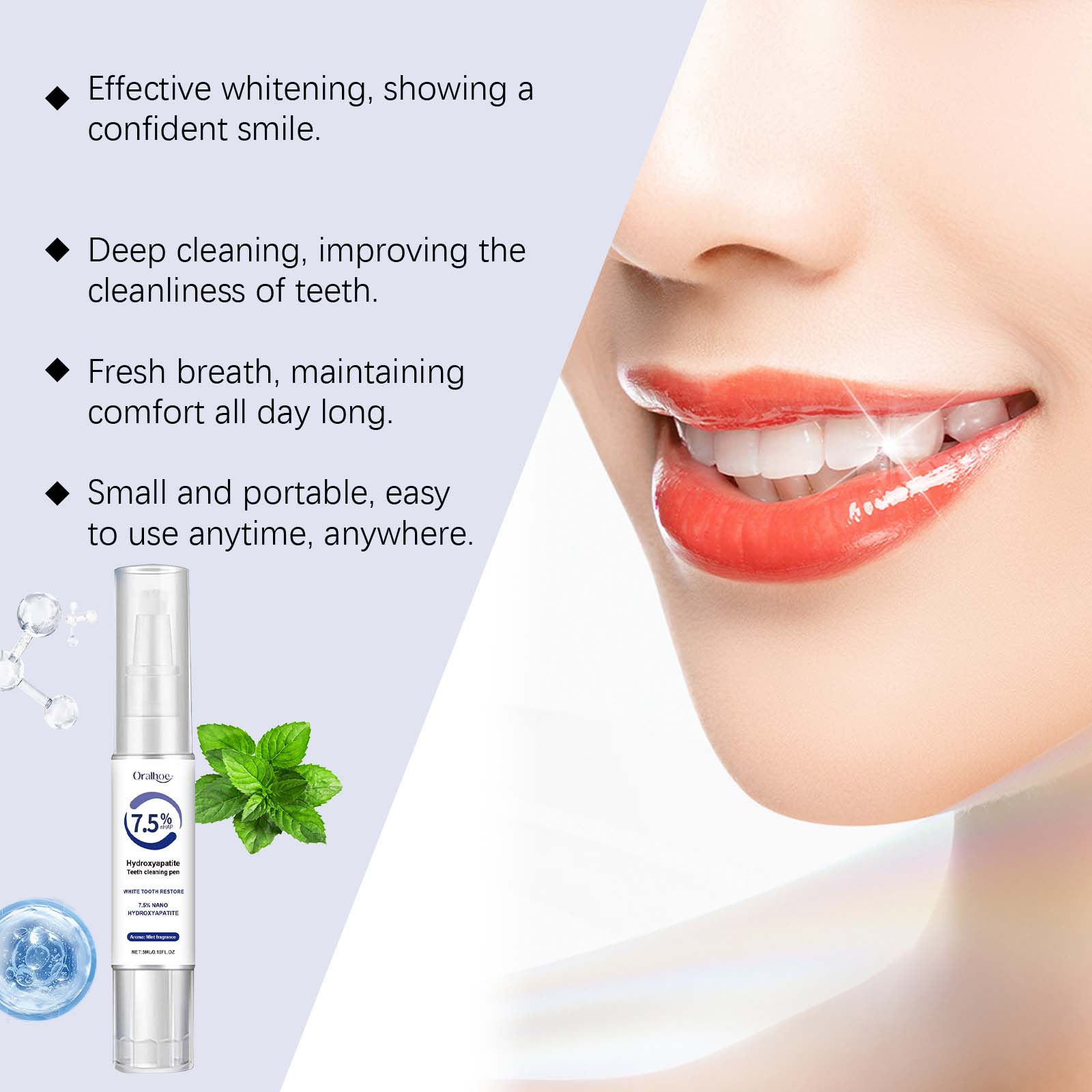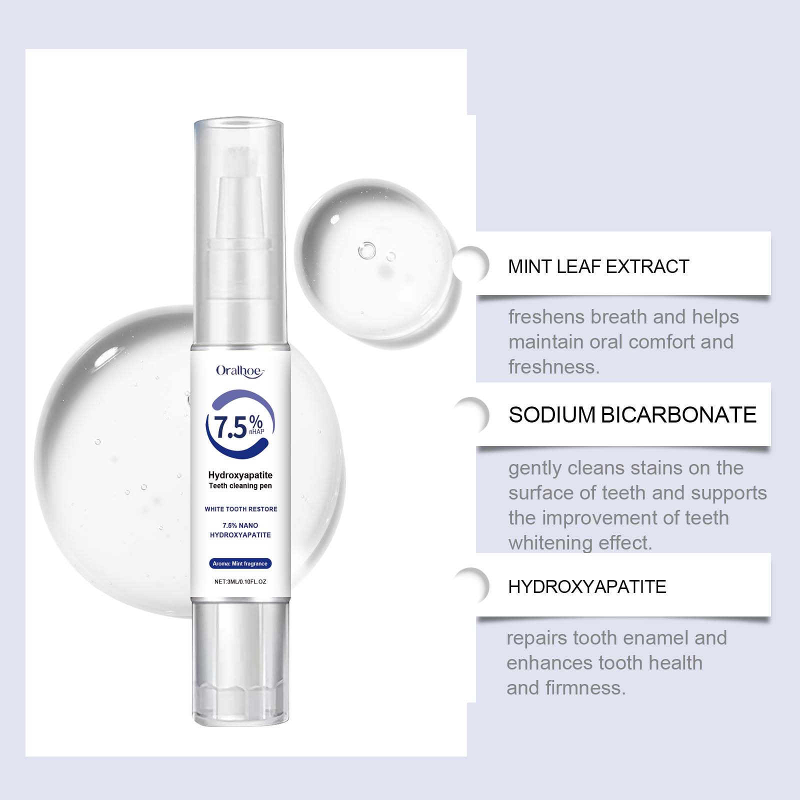 我们的牙齿护理笔含有碳酸氢钠、羟基磷灰石。它可以帮助去除表面污渍和牙垢,使牙齿恢复洁白光泽。使用后清新持久,让您在任何场合都能自信、愉悦。它的使用方法很简单:将刷头向下转动并扭开,让刷头吸收液体涂在牙齿上,等待20秒干燥。并且可以适用于各种场合,满足日常和旅行牙科护理的需要。