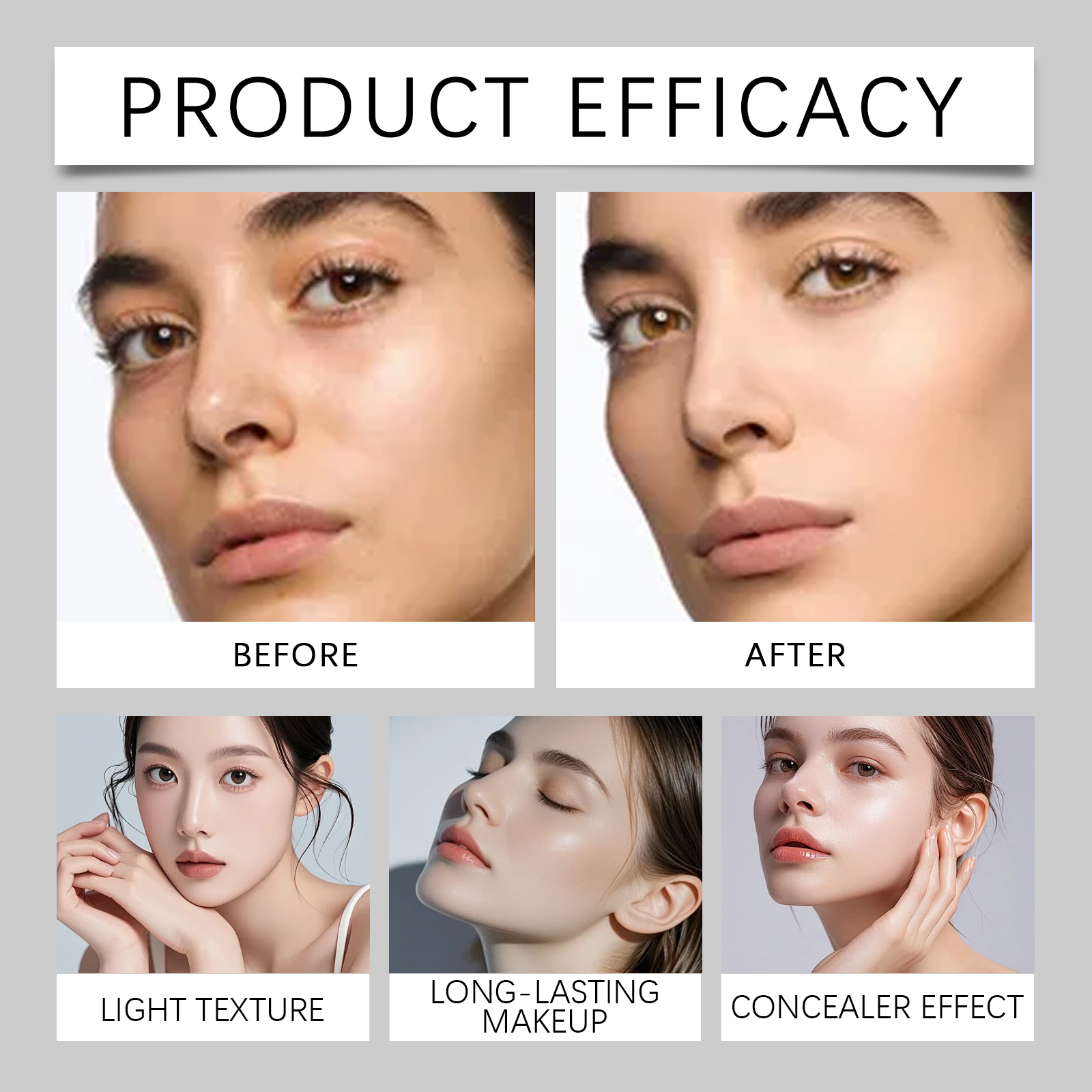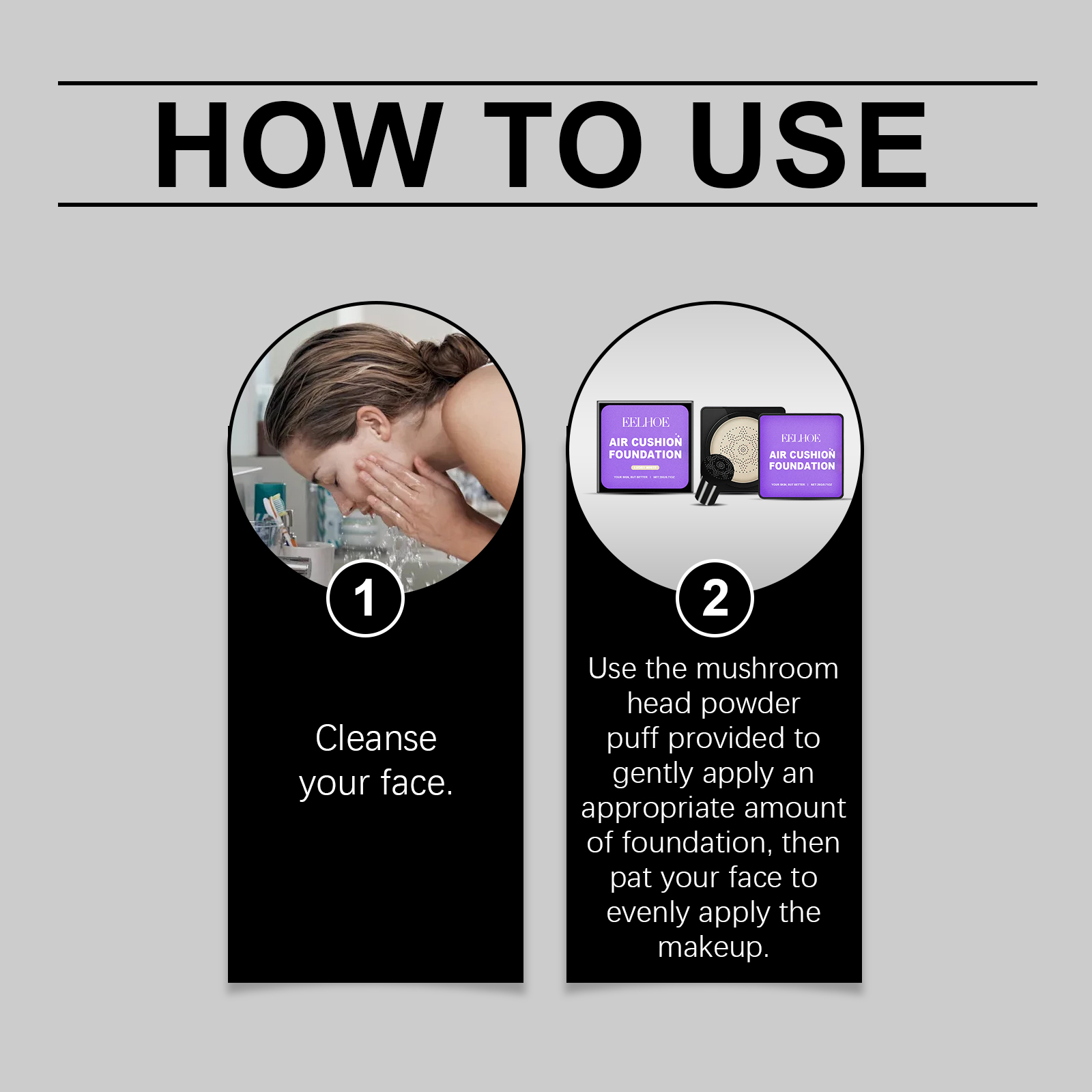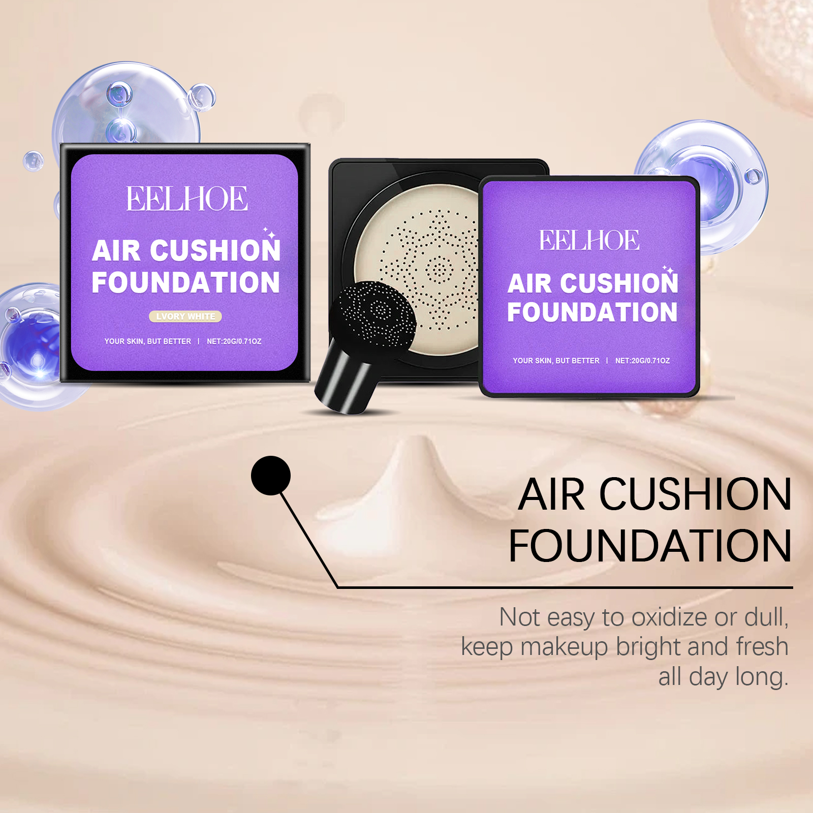 我们的蘑菇头气垫粉底含有二氧化钛、维生素C(抗坏血酸)。它可以有效控制油脂和锁妆,妆容整天焕然一新。它的使用方法很简单:清洁你的脸。用提供的蘑菇头粉扑轻轻涂抹适量粉底,然后轻拍脸部均匀涂抹化妆品。并且轻质感易于扩散,创造出裸体妆效。