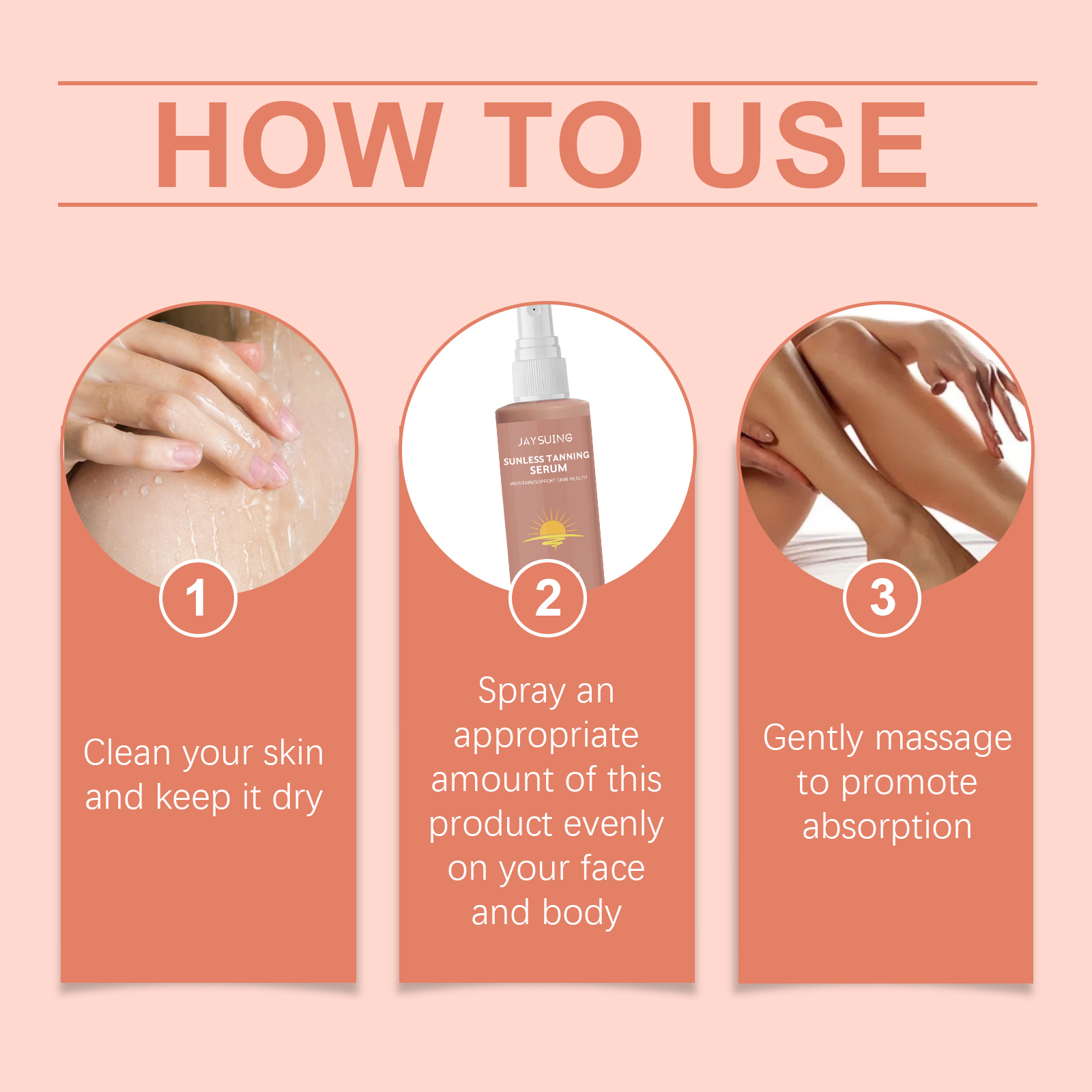 我们的草本免晒美黑精华液含有胡萝卜素、乳木果油、西瓜提取物。它可以深层保湿,保持肌肤水润光滑,为肌肤提供全方位的保护和营养。它的使用方法很简单:清洁皮肤并保持干燥;取适量本品均匀喷于面部及身体;轻轻按摩以促进吸收。并且适合所有肤质,温和护理。改善肤色均匀性并展现动人的光彩。