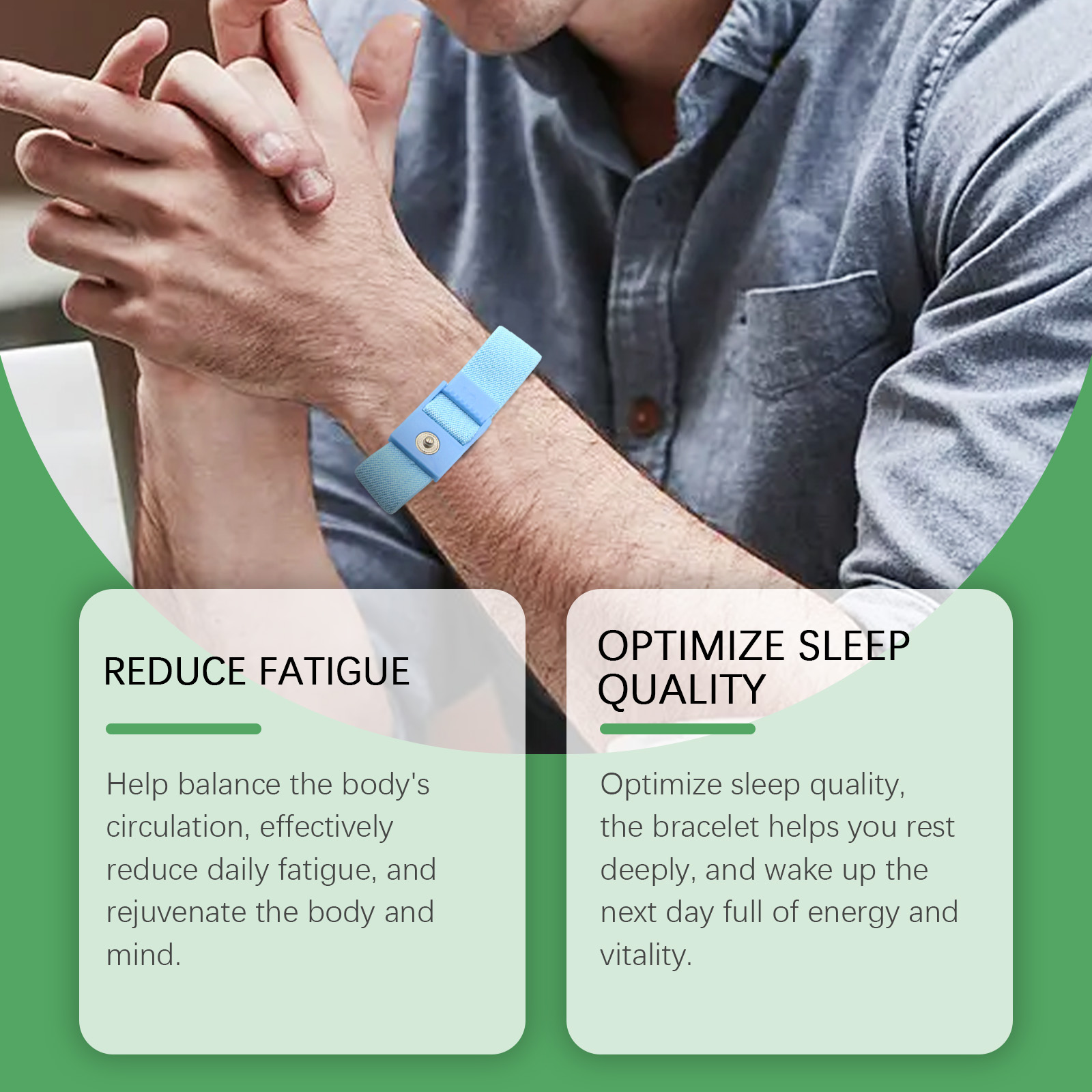我们的身体护理手环含有PVC。它可以帮助平衡身体的循环,有效减少日常疲劳,并使身心焕发活力。它的使用方法很简单:将产品戴在手腕上,并调整到舒适的位置。并且可以优化睡眠质量,手环帮助你深度休息,第二天醒来充满活力和活力。