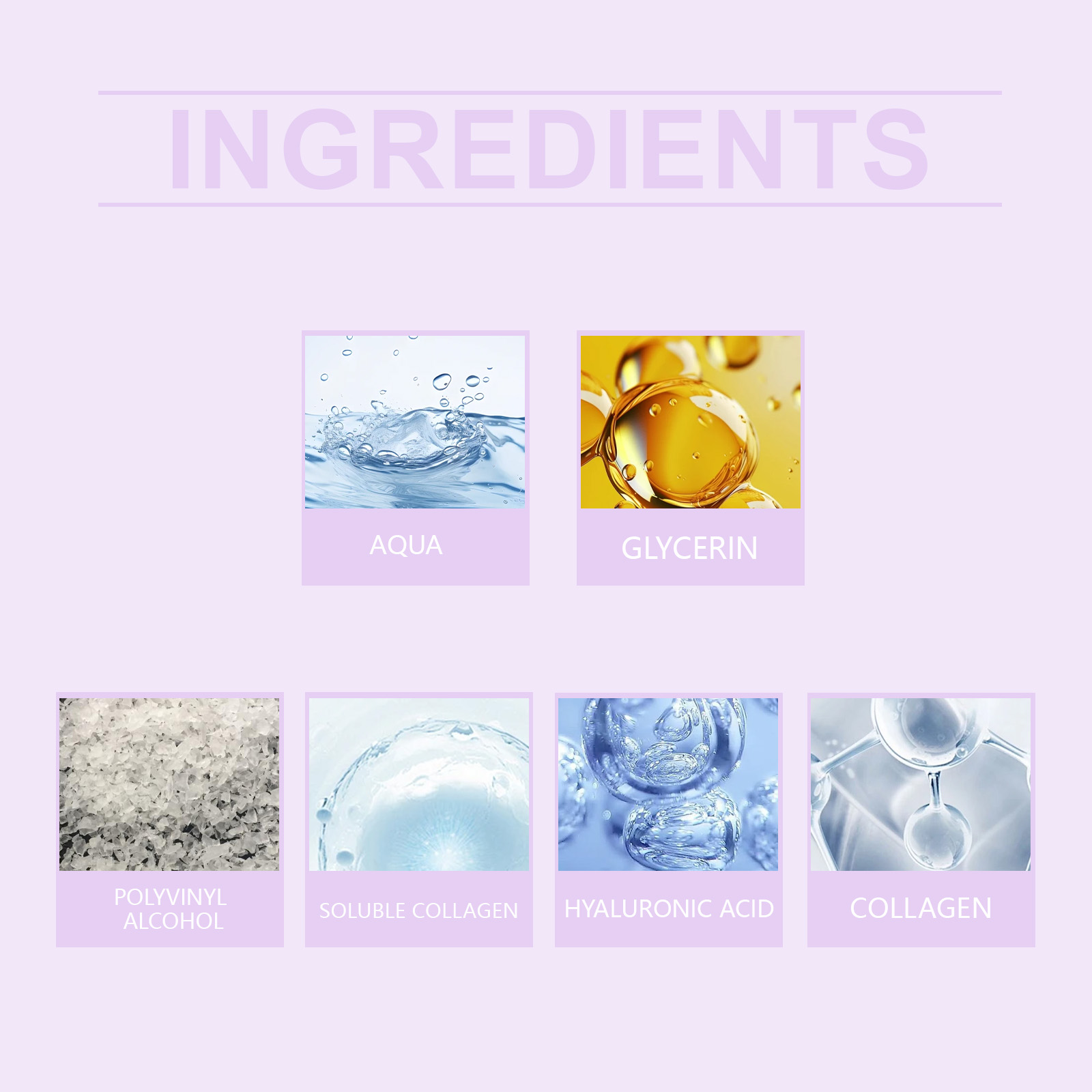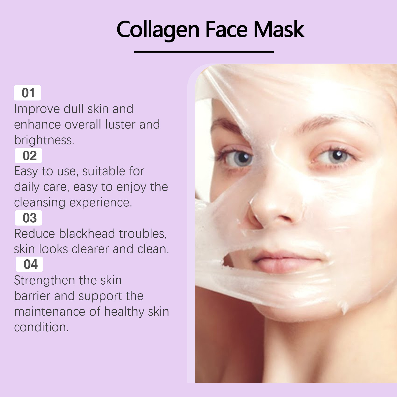 我们的胶原蛋白保湿撕拉面膜含有聚乙烯醇、甘油。它可以快速补充肌肤水分,令肌肤水润光泽。轻易撕掉毛孔中的污垢,清洁毛孔中的残留物。它的使用方法很简单:保持脸部干燥。取适量本品均匀涂抹于面部肌肤上,等待10-15分钟,轻轻剥下面膜,用温水洗掉即可。可与工具一起使用。并且可以锁住水分,使肌肤柔软光滑,并长期保持水分。