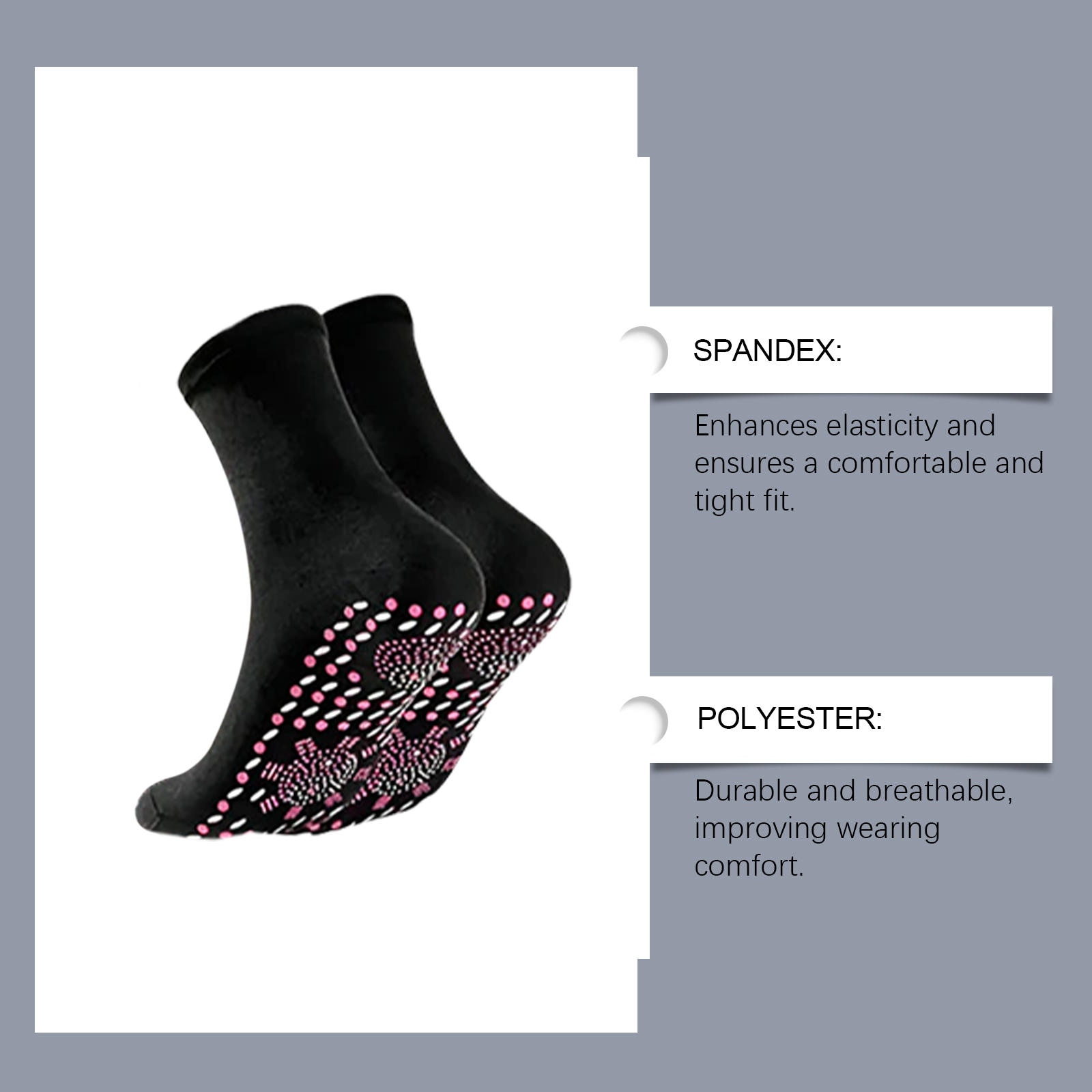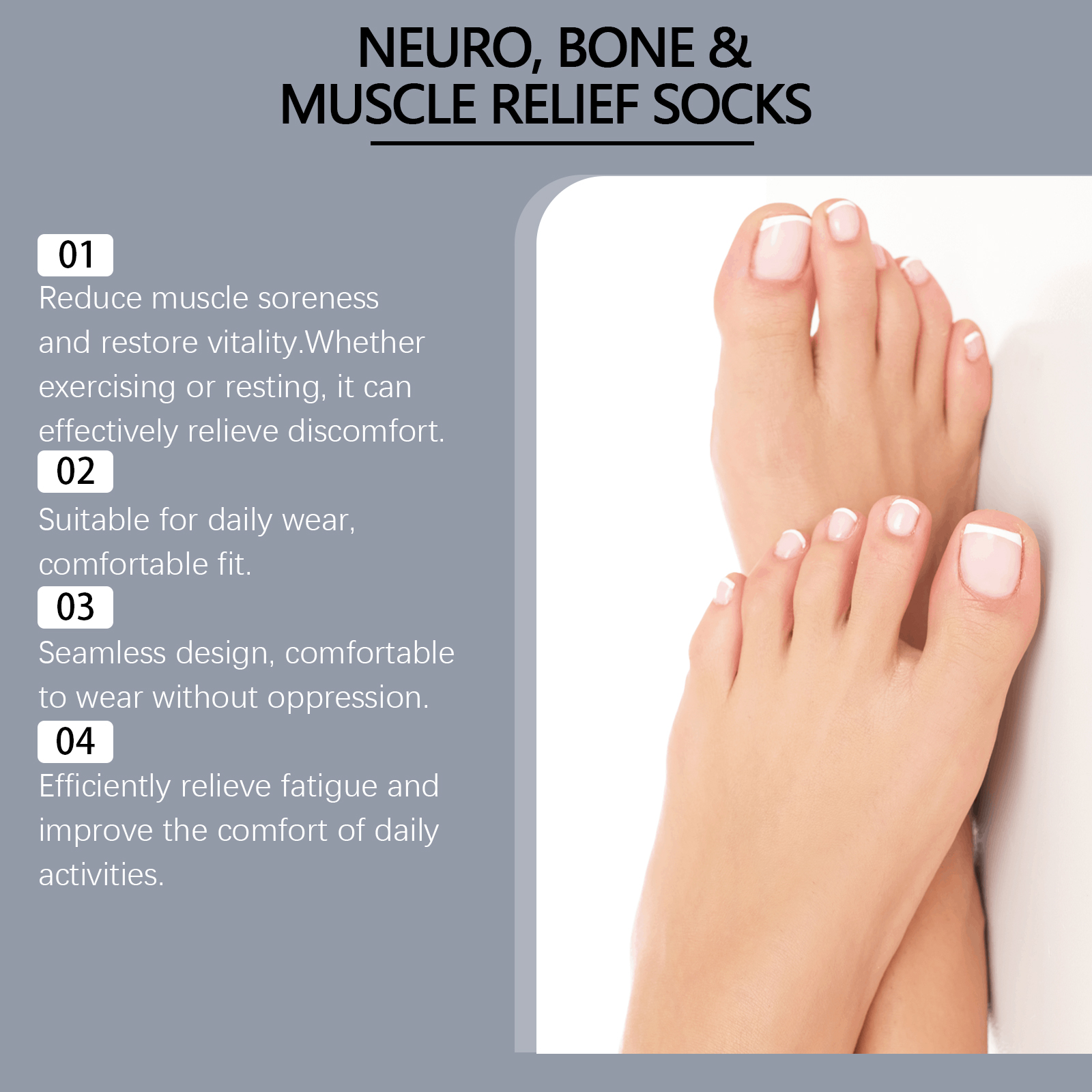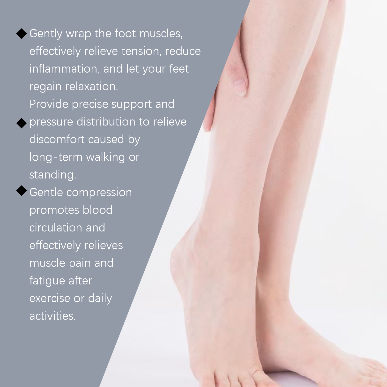 我们的足部护理袜含有97%聚酯纤维、3%氨纶。它可以提供全方位的支持,缓解不适。它的使用方法很简单:只需打开包装,将本产品穿在脚上。并且设计合身,整天舒适。适合长时间坐着和运动后的疲劳缓解。
