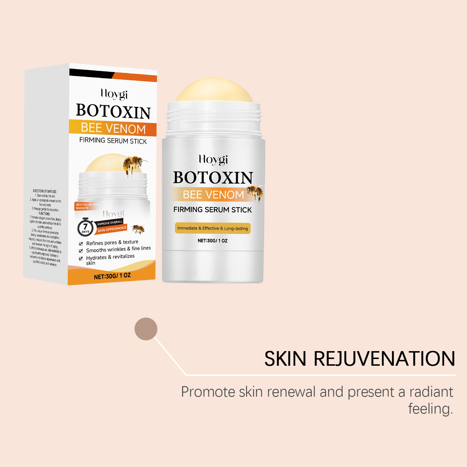 我们的皮肤紧致精华棒含有蜂毒,烟酰胺。它可以紧致肌肤,提高肌肤弹性。它的使用方法很简单:清洁并擦干皮肤。适量涂抹于面部和身体。轻轻按摩以吸收。并且可以有效改善肌肤紧致度,焕发青春。改善肌肤干燥,锁住水分。