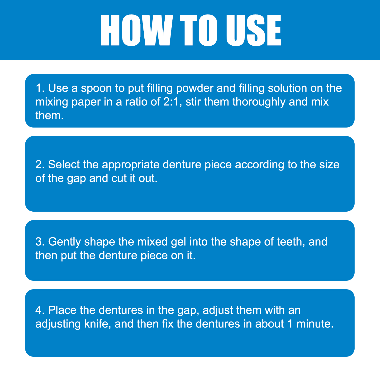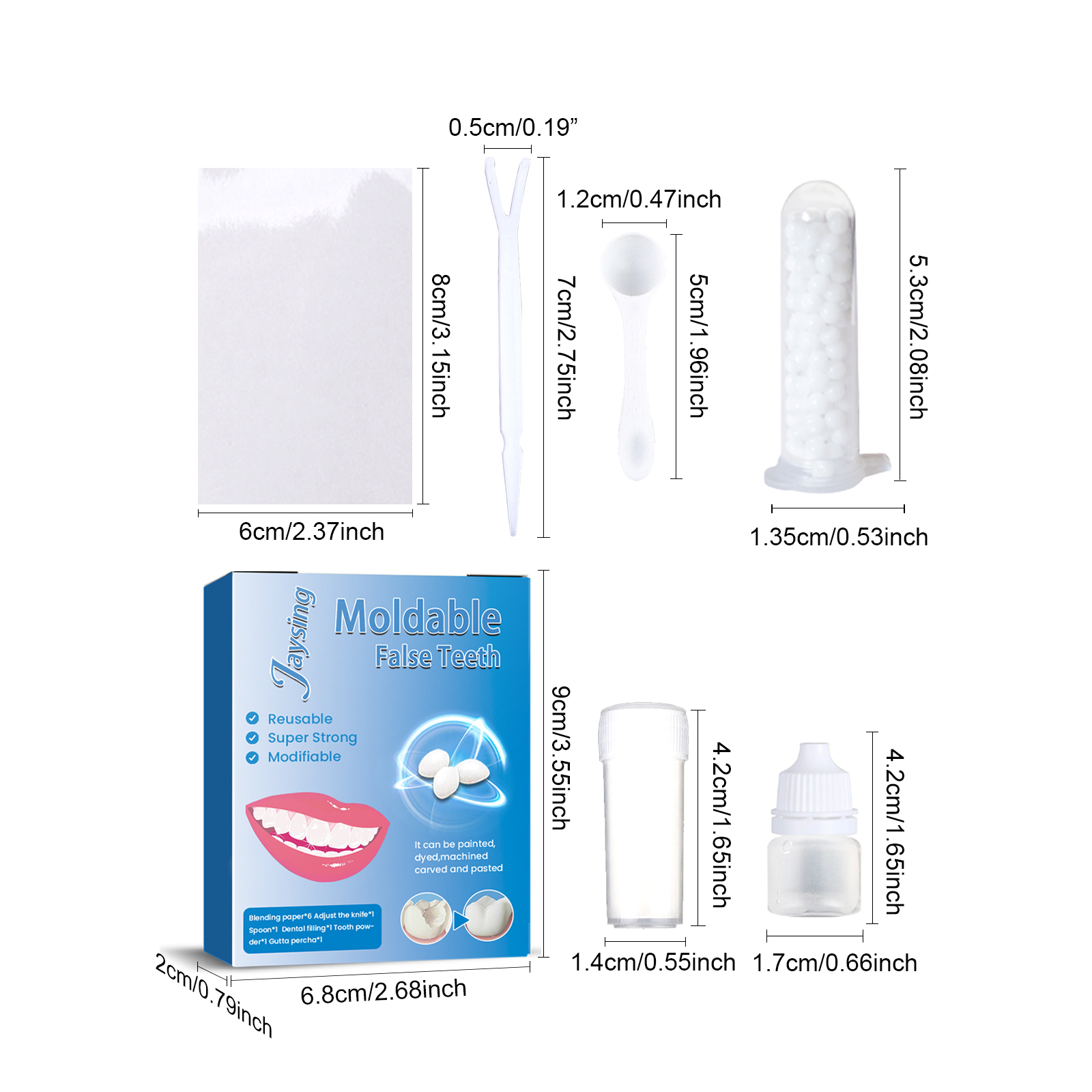 | 产品尺寸 | 调和纸:8*6cm, 补牙液:4.2*1.7cm, 补牙粉: 4.2*1.4cm, 勺子:5*1.2cm, 调刀:7*0.5cm, 牙胶: 1.35*5.3cm |