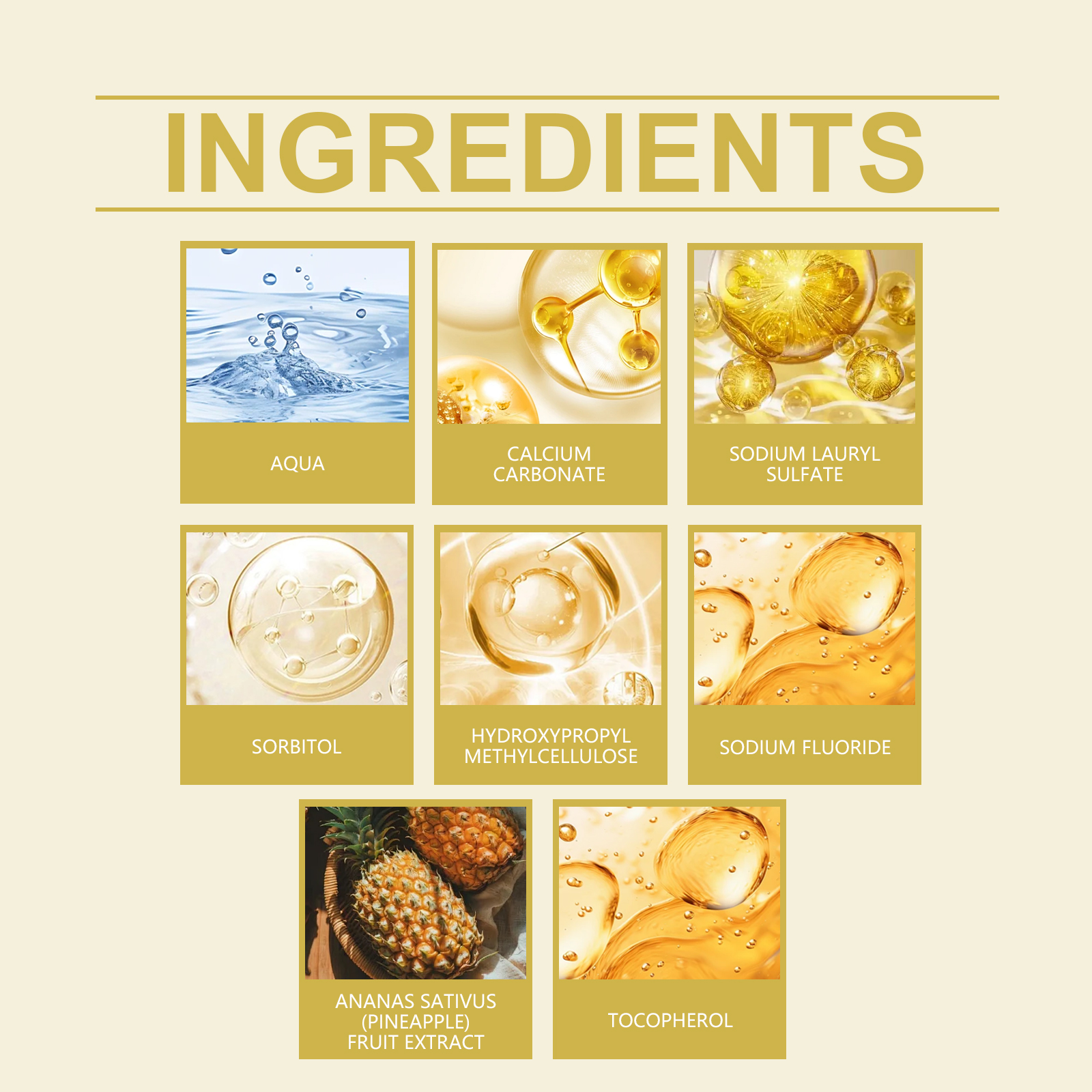 我们的菠萝味牙膏含有碳酸钙、月桂醇硫酸酯钠。它可以清洁牙齿表面,减少沉积,保持口腔清新防止牙垢堆积,保持牙齿光洁。它的使用方法很简单:用合适的清水漱口来清洁牙齿。用清水漱口,直到干净。在湿牙刷上涂上适量牙膏,刷牙2-3分钟。并且可以温和滋养并缓解牙龈敏感。
