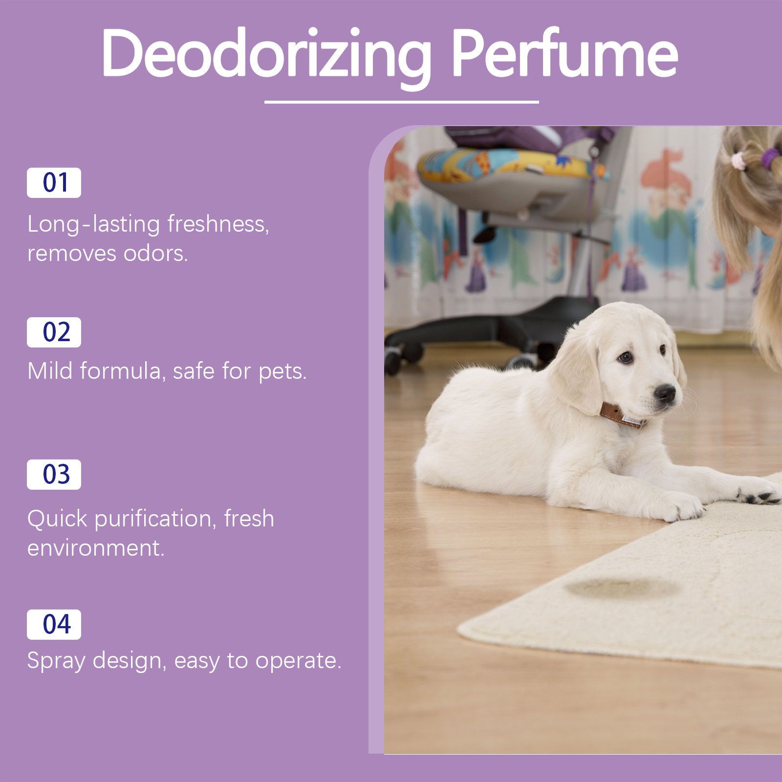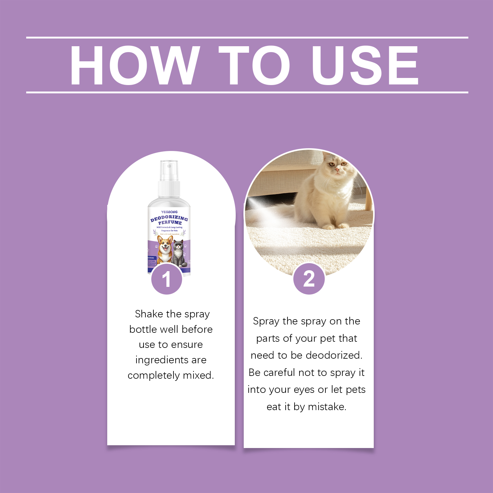 我们的宠物除臭喷雾含有活性炭粉末、表面活性剂。它具有天然植物提取物,新鲜天然。安全温和,不刺激宠物皮肤。它的使用方法很简单:使用前先摇匀喷雾瓶,以确保成分完全混合。将喷雾喷在宠物需要除臭的部分,注意不要喷到眼睛里也不要让宠物误吃。并且可以强力去除宠物活动区域的异味,只需轻轻喷洒即可立即恢复清新空气,不会留下任何残留物。
