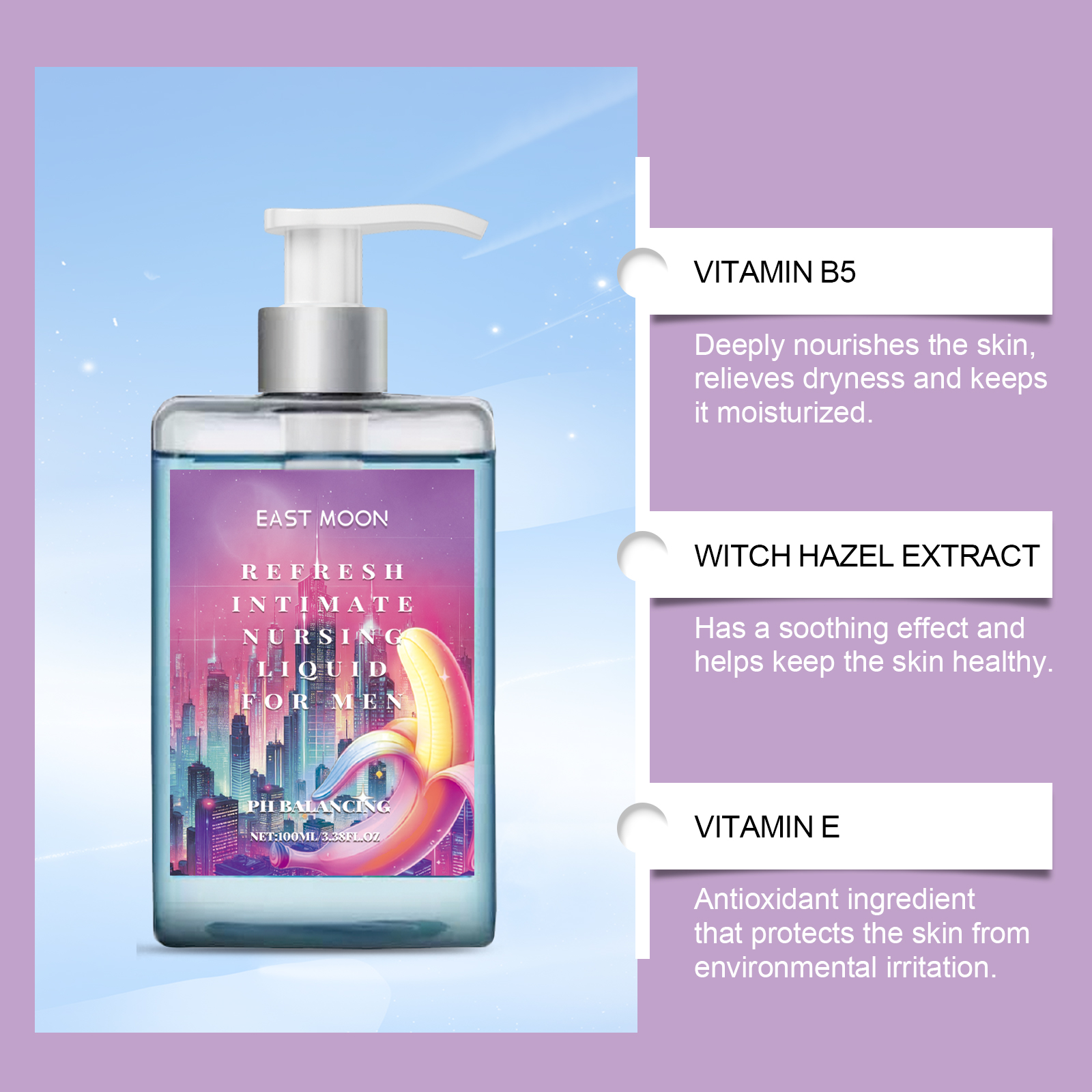 我们的男士护理沐浴露含有金缕梅提取物、生育酚(维生素E)。它可以帮助去除异味,保持清新。它的使用方法很简单:用温水彻底湿润你的身体。取适量本品在手上揉成泡沫。将泡沫均匀涂抹在私处皮肤上,按摩2-3分钟。用温水洗。并且可以舒缓皮肤不适,保护隐私部位。