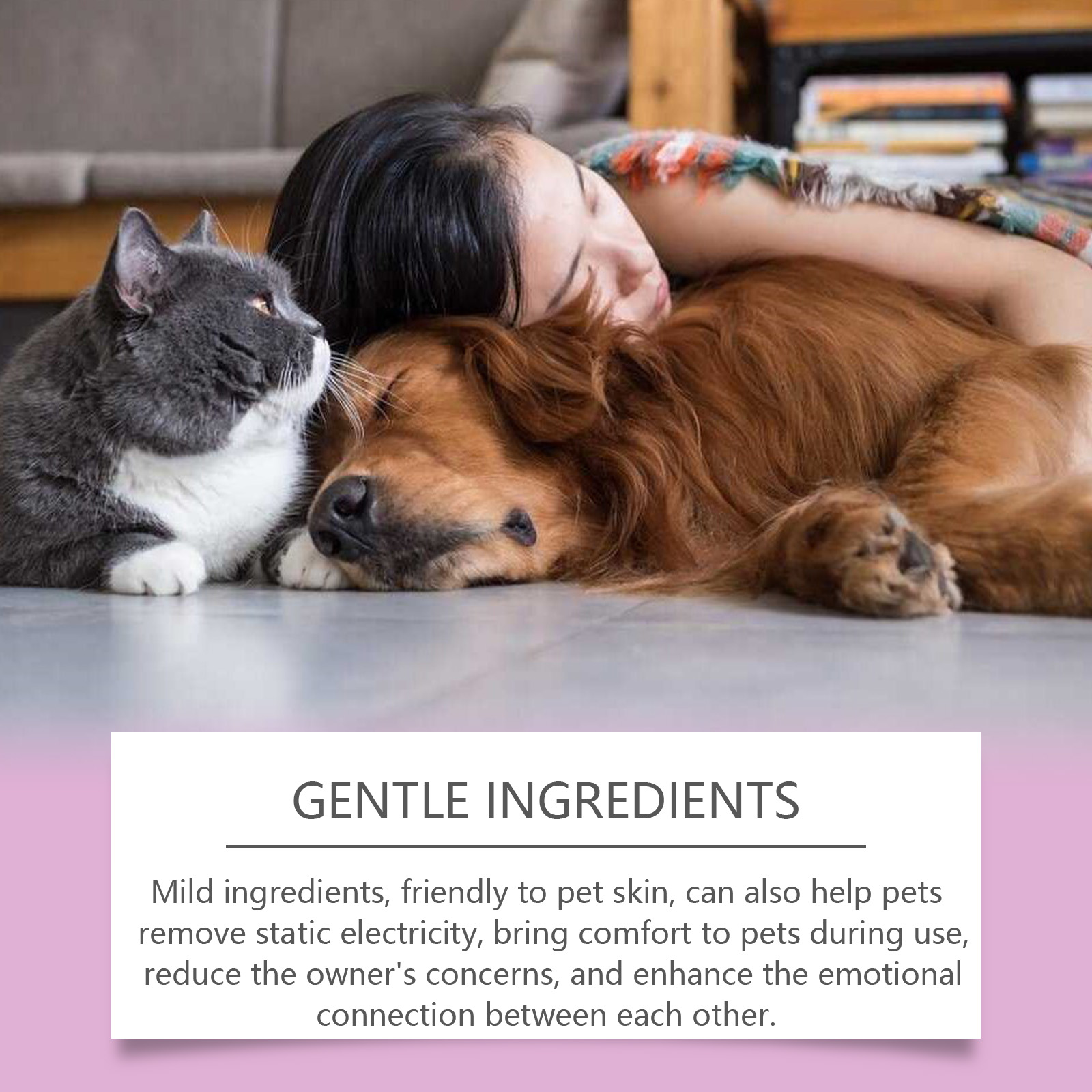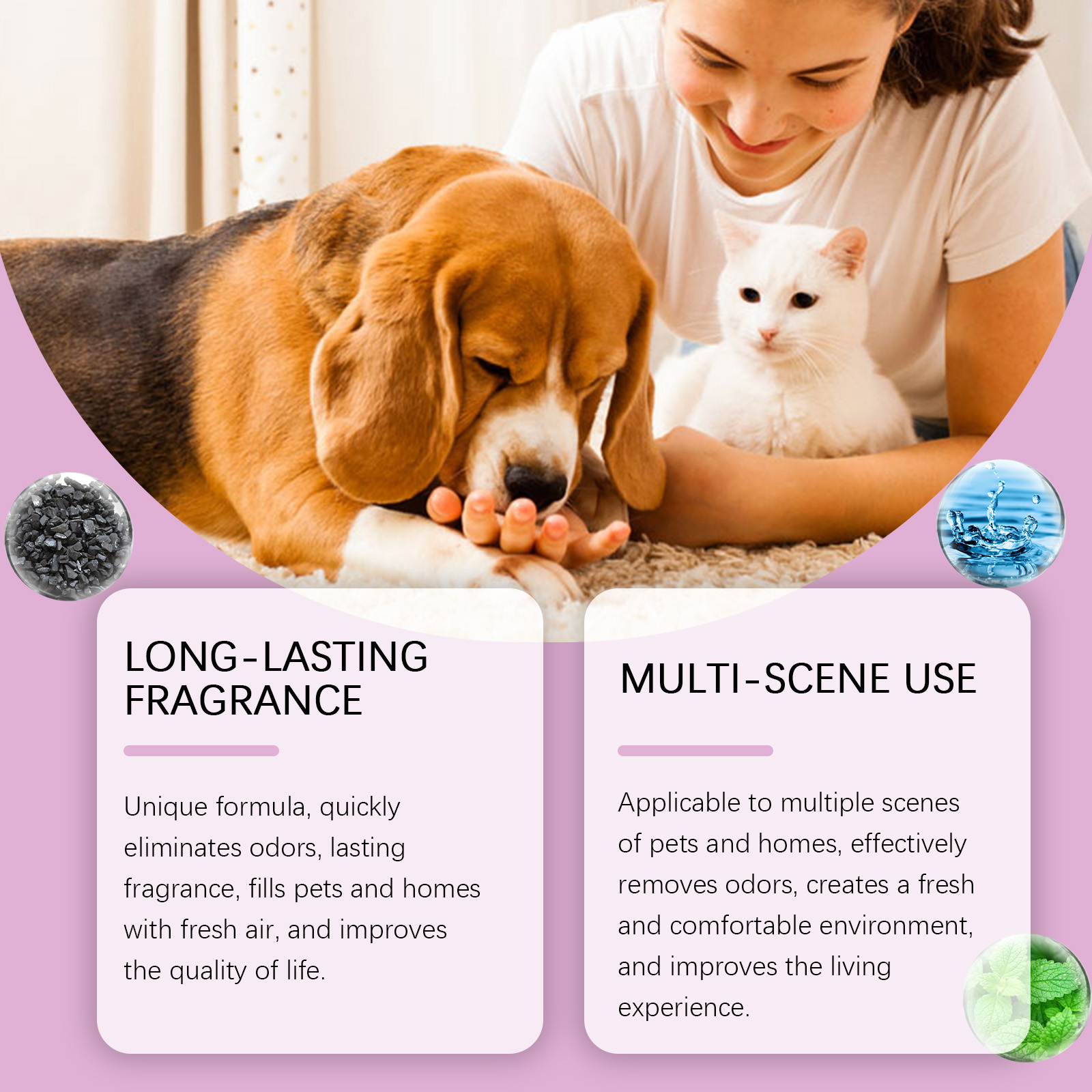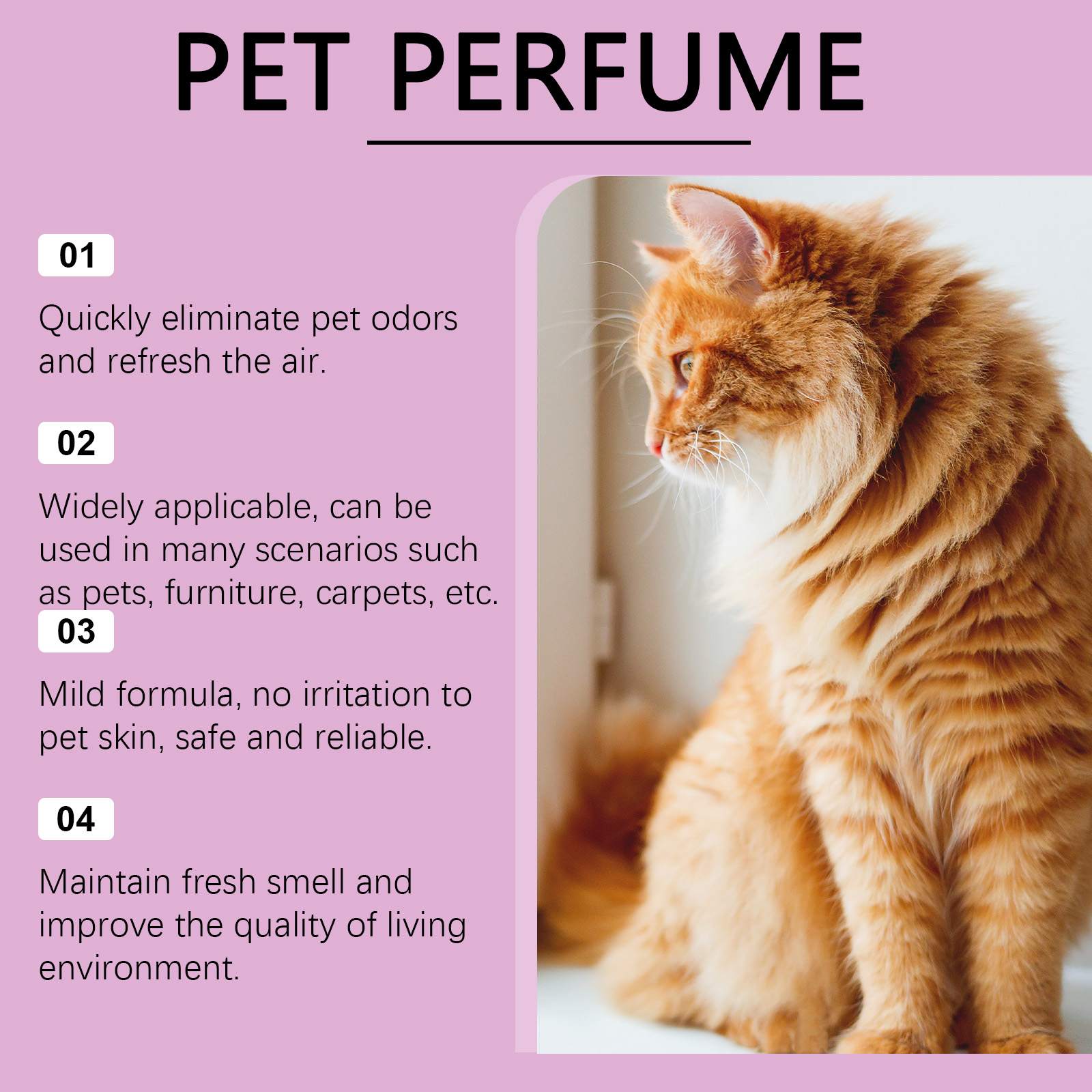 我们的宠物除臭清新喷雾含有活性炭粉末、表面活性剂。它独特的配方,快速消除异味,持久芳香,为宠物和家庭注入新鲜空气,并提高生活质量。适用于多种宠物和家居场景,有效去除异味,营造清新舒适的环境提升生活体验。它的使用方法很简单:使用前先摇匀喷雾瓶,以确保成分完全混合。使用前摇匀将适量本品均匀喷于需要除臭的部位。并且温和的成分,对宠物皮肤友好,还能帮助宠物去除静电,在使用过程中为宠物带来舒适感,减少主人的担忧,增强彼此之间的情感联系。
