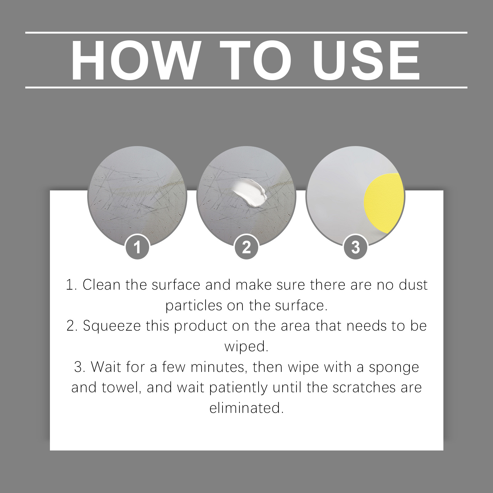 我们的汽车划痕蜡漆面保养液含有碳酸钙、甘油。它可以快速修复汽车漆面上的划痕和缺陷,使车身看起来焕然一新,恢复原有的光泽。它的使用方法很简单:1.清洁表面,确保表面没有灰尘颗粒。2.将本品挤在需要擦拭的部位。3.等待几分钟,然后用海绵和毛巾擦拭耐心等待,直到划痕消除。并且可以彻底去除汽车表面的各种顽固污渍,恢复汽车漆面亮丽的颜色。