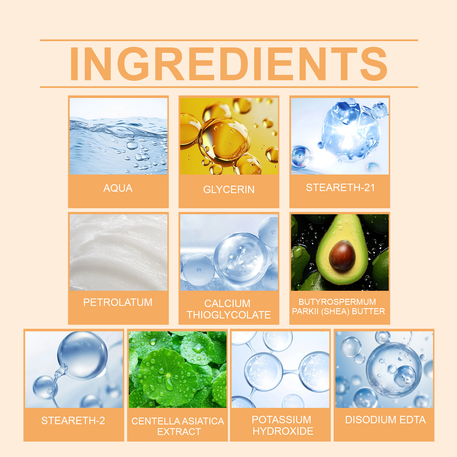 我们的身体面部脱毛霜含有去离子水、甘油。它可以快速软化头发,轻松去除多余毛发,保持皮肤光滑。滋润干燥肌肤,减少瘙痒,并增强使用后的舒适度。它的使用方法很简单:清洁皮肤并保持干燥。将适量的本品均匀涂抹在嘴唇周围的胡须或身体其他需要脱毛的皮肤上,停留5-10分钟。用清水冲洗干净。并且可以有效延缓头发生长,保持光滑效果更持久。