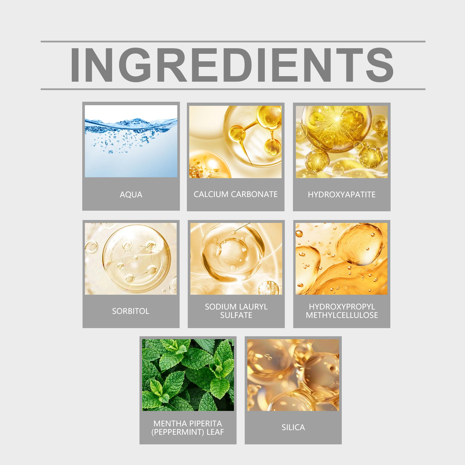 我们的亮白牙齿护理牙膏含有羟丙基甲基纤维素、二氧化硅。它可以清洁牙齿表面,减少沉积,保持口腔清新。它的使用方法很简单:用清水漱口以湿润牙齿。在湿牙刷上放适量的牙膏,刷牙2-3分钟。用清水漱口直到干净。并且可以防止牙垢堆积,保持牙齿光洁。