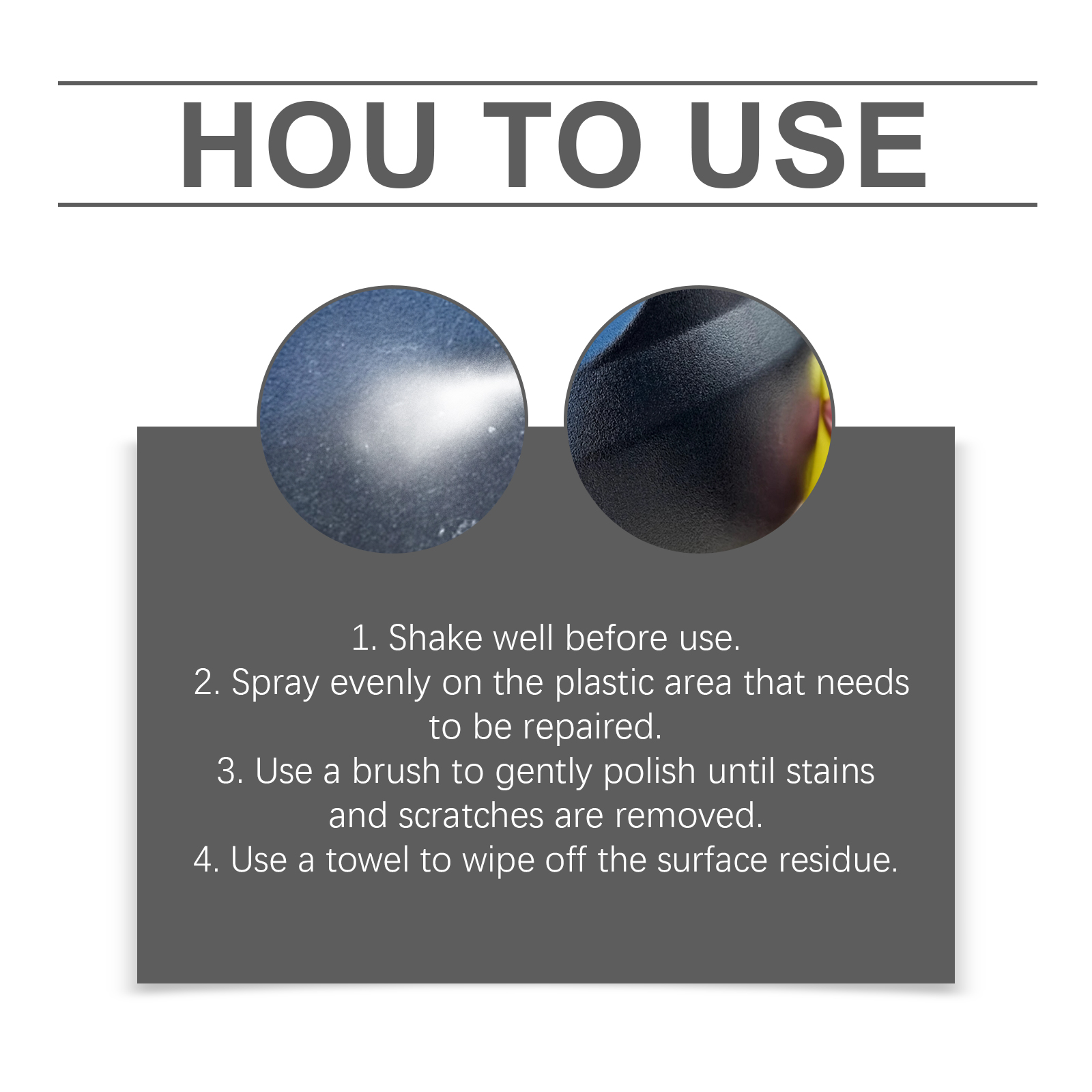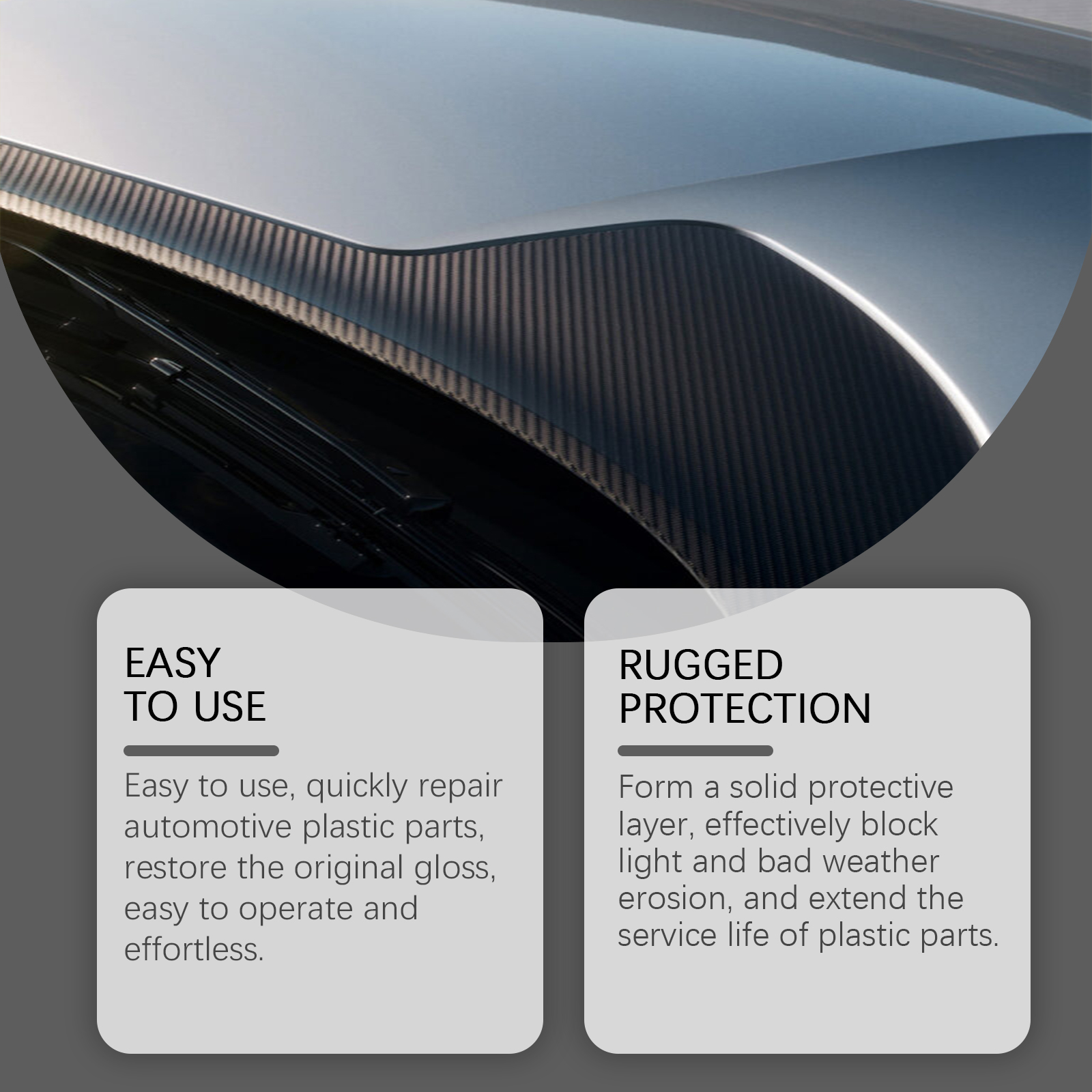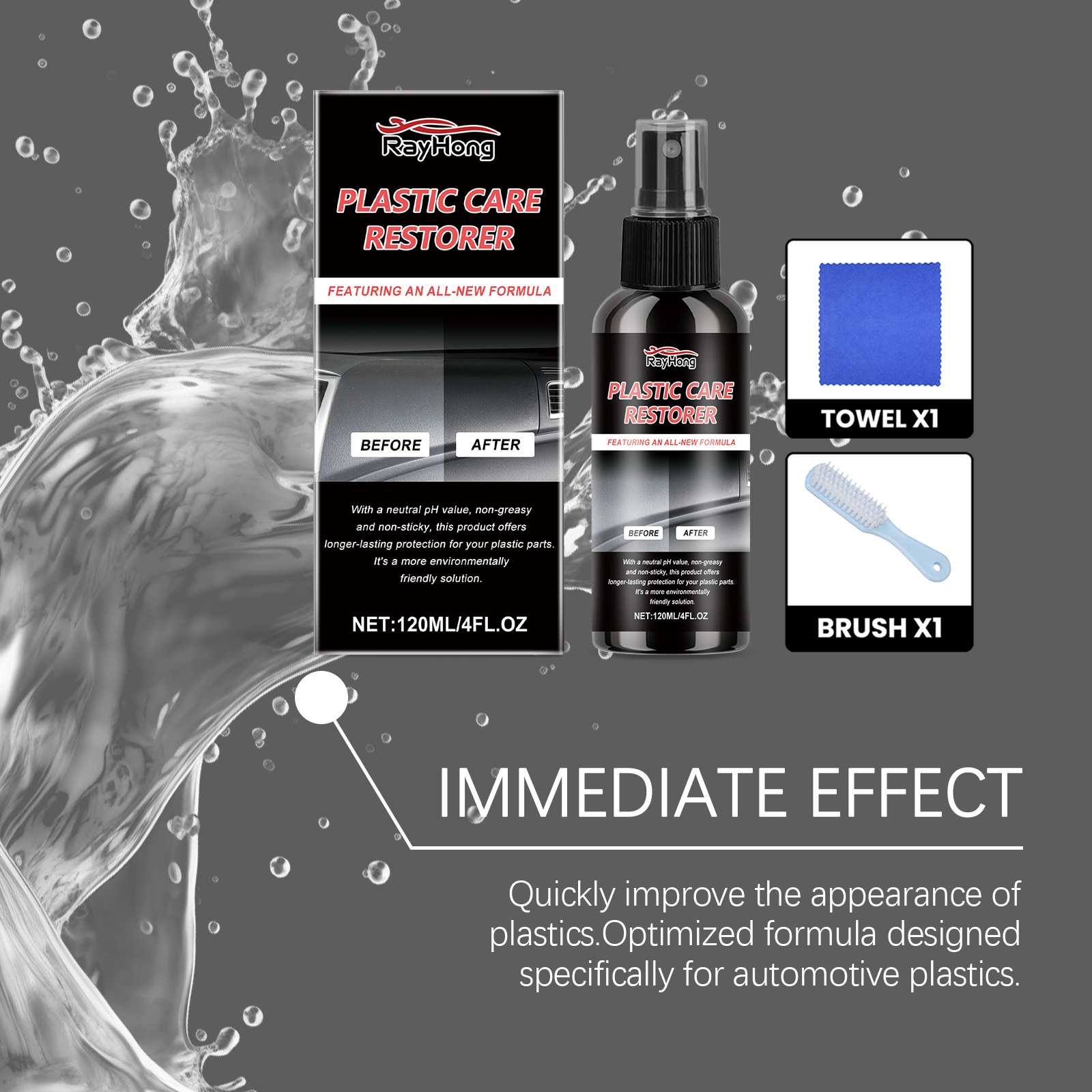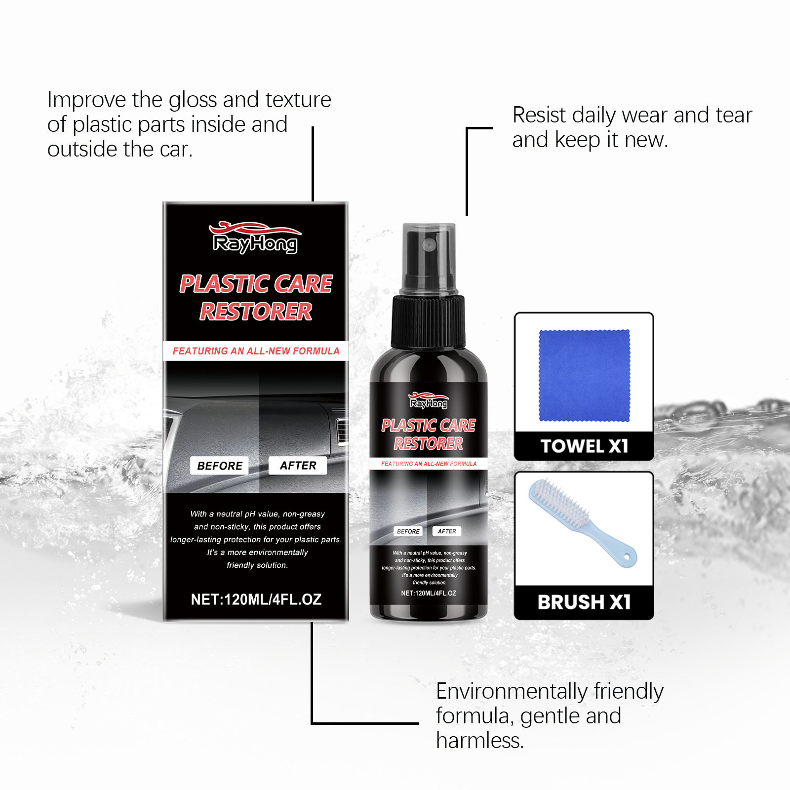我们的汽车塑料护理剂含有丙二醇甲醚、硅酸钠、异丙醇。它可以快速修复汽车塑料零件,恢复原有的光泽,操作简便且毫不费力。它的使用方法很简单:1.使用前请摇匀。2.均匀喷洒在需要修复的塑料区域。3.用刷子轻轻打磨,直到污渍和划痕被去除。4.用毛巾擦去表面残留物。并且可以形成坚固的保护层,有效阻挡光线和恶劣天气的侵蚀,延长塑料零件的使用寿命。