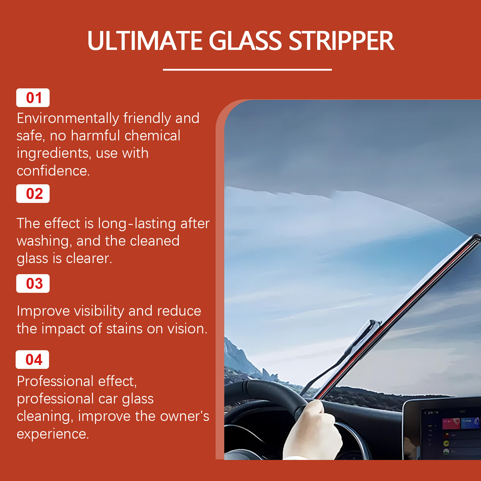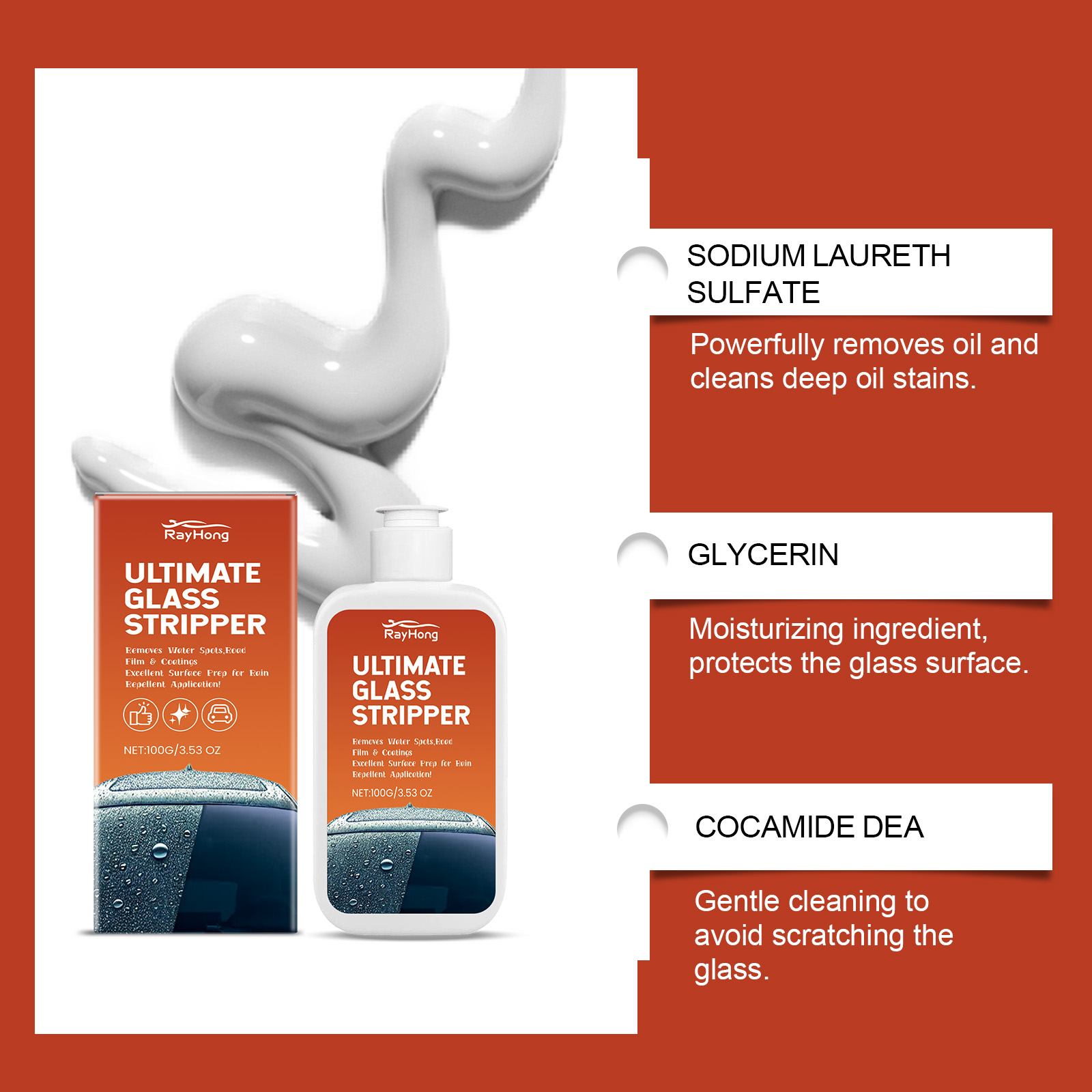 我们的汽车玻璃除油膏含有月桂醇聚醚硫酸酯钠、甘油。它可以有效去除玻璃上的油渍并恢复清晰度。同时清洁和保护玻璃表面。它的使用方法很简单:取适量本品,挤在玻璃杯或海绵上。用海绵或毛巾在玻璃上来回擦拭。用大量清水冲洗并用毛巾擦干。并且它可以乳化和吸附玻璃上的油膜,清洁污渍,使玻璃更清洁,视野更清晰。