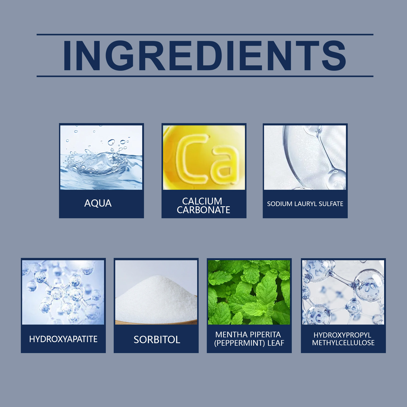 我们的牙齿清洁牙膏含有羟丙基甲基纤维素、薄荷叶。它可以清洁牙齿表面,减少沉积,保持口腔清新。它的使用方法很简单:用清水漱口以湿润牙齿。在湿牙刷上放适量的牙膏,刷牙2-3分钟。用清水漱口直到干净。并且可以防止牙垢堆积,保持牙齿光洁。