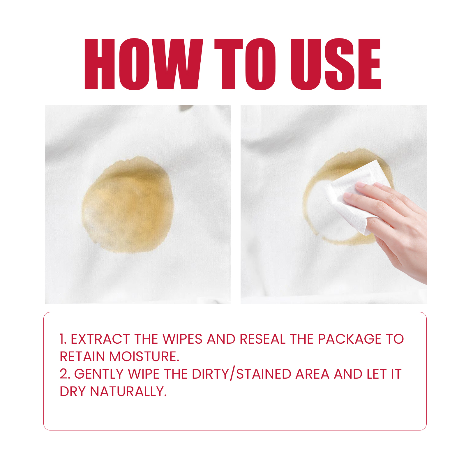 我们的衣服去污湿巾含有水、表面活性剂、保湿剂。它可以保持清洁,防止永久性污渍,含有丰富的去污成分,能有效清除衣服上的灰尘和污渍,让你的衣服更亮。它的使用方法很简单:1. 取出湿巾并重新密封包装以保持水分。2. 轻轻地擦拭脏的地方,让它自然干燥。成份温和,不会损伤衣物表面或伤手。衣服去污湿巾含有表面清洁剂,帮助防止污渍变成永久性的,一次又一次地拯救你的衣服。