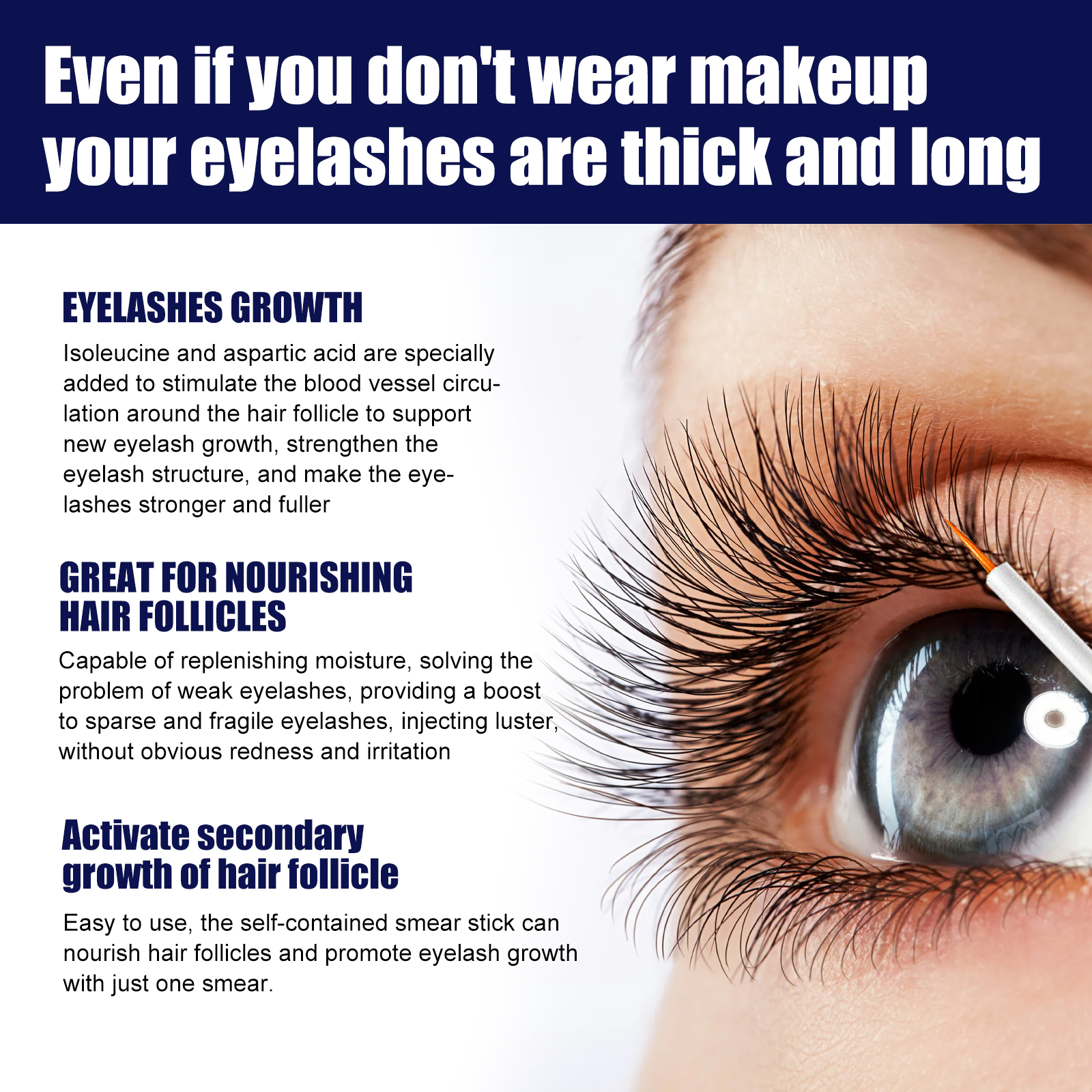 我们的睫毛液含有卡波姆、三乙醇胺。它可以刺激毛囊周围的血管循环,支持新睫毛生长,强化睫毛结构,使睫毛更结实、更饱满非常适合滋养毛囊能够补充水分;有效滋养睫毛,使睫毛长而美丽睫毛更长更浓密非常适合滋养毛囊维生素的营养。它的使用方法很简单:先清洁眼周,保持睫毛干燥,然后用涂抹器将本品均匀涂抹于睫毛根部,从眼内角开始向外扩散,使其完全吸收,早晚交替才能达到更好的效果。解决睫毛脆弱的问题,为稀疏脆弱的睫毛提供提振,注入光泽,无明显的红肿和刺激促进毛囊二次生长易于使用,独立的涂抹棒可以滋养毛囊,促进睫毛生长,只需一秒。