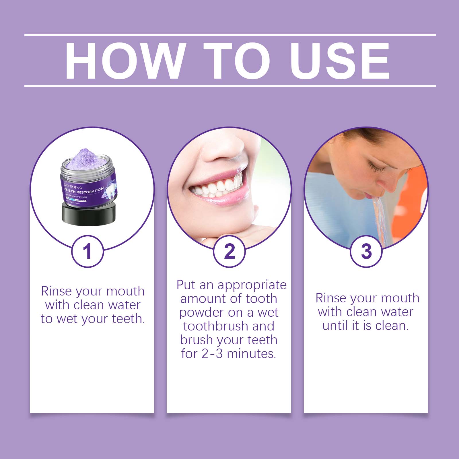 我们的紫色焕白美牙粉含有透明质酸、维生素C(抗坏血酸)。它可以减少牙齿表面的污渍,展现白皙笑容的魅力。它的使用方法很简单:用清水漱口以湿润牙齿。在湿牙刷上放适量的牙粉,刷牙2-3分钟。用清水漱口直到干净。并且可以带来持久的新鲜感,提高口腔舒适度。