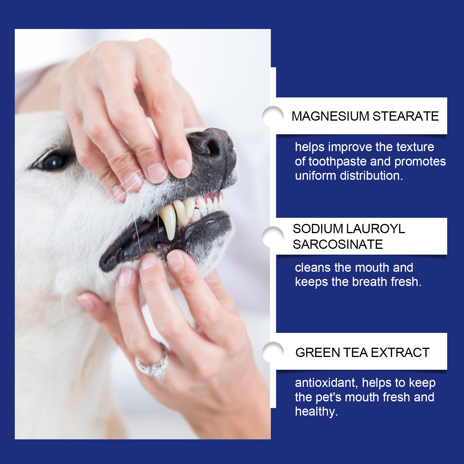 我们的宠物洁牙粉含有绿茶提取物、迷迭香提取物、薄荷提取物。它可以帮助去除宠物牙齿上顽固的牙垢,保持牙齿洁白。它的使用方法很简单:用勺子舀出适量的洁齿粉。用湿牙刷将牙刷浸入牙粉中。使用蘸有牙粉的牙刷轻轻刷洗狗狗的牙齿2-3分钟,以确保牙粉均匀分布在牙齿表面。用清水冲洗狗狗的口腔,去除残留的清洁粉末。并且可以保持呼吸新鲜,长时间避免口臭问题。