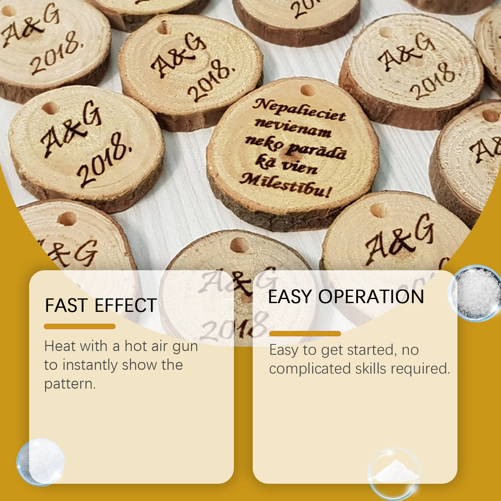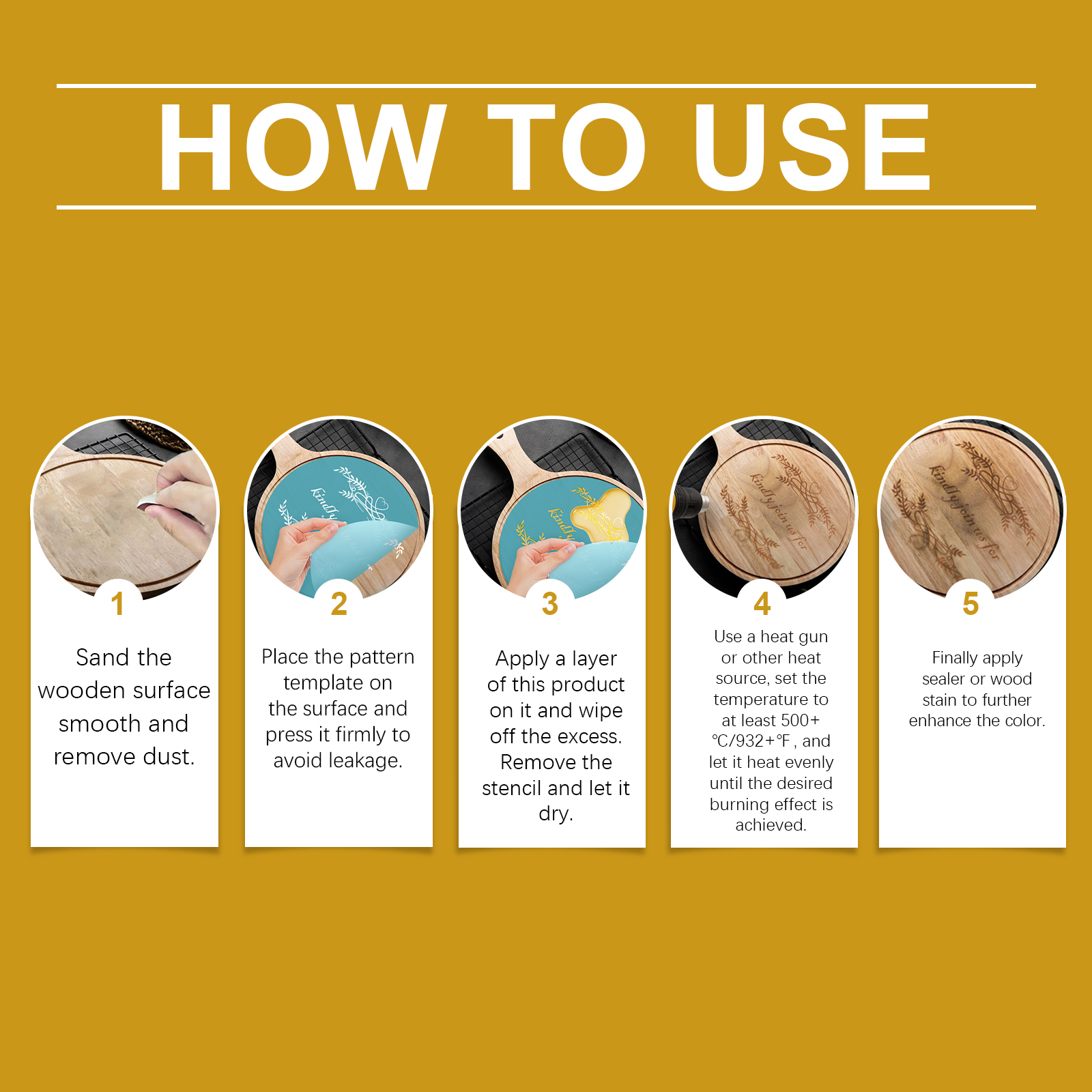 我们的木材燃烧膏含有椰油酰胺甲基、甘油硬脂酸酯。它可以用热风枪加热以立即显示图案。它的使用方法很简单:用砂纸将木制表面打磨光滑并去除灰尘。将图案模板放在表面上并用力按压,以避免泄漏。在这上面涂一层这种产品,然后擦掉多余的。移除模板并让其干燥。使用热枪或其他热源,将温度设置为至少500+℃/932+℉,并均匀加热,直到达到所需的燃烧效果。最后,使用密封剂或木器漆进步增强颜色。并且易于上手,无需复杂技能。