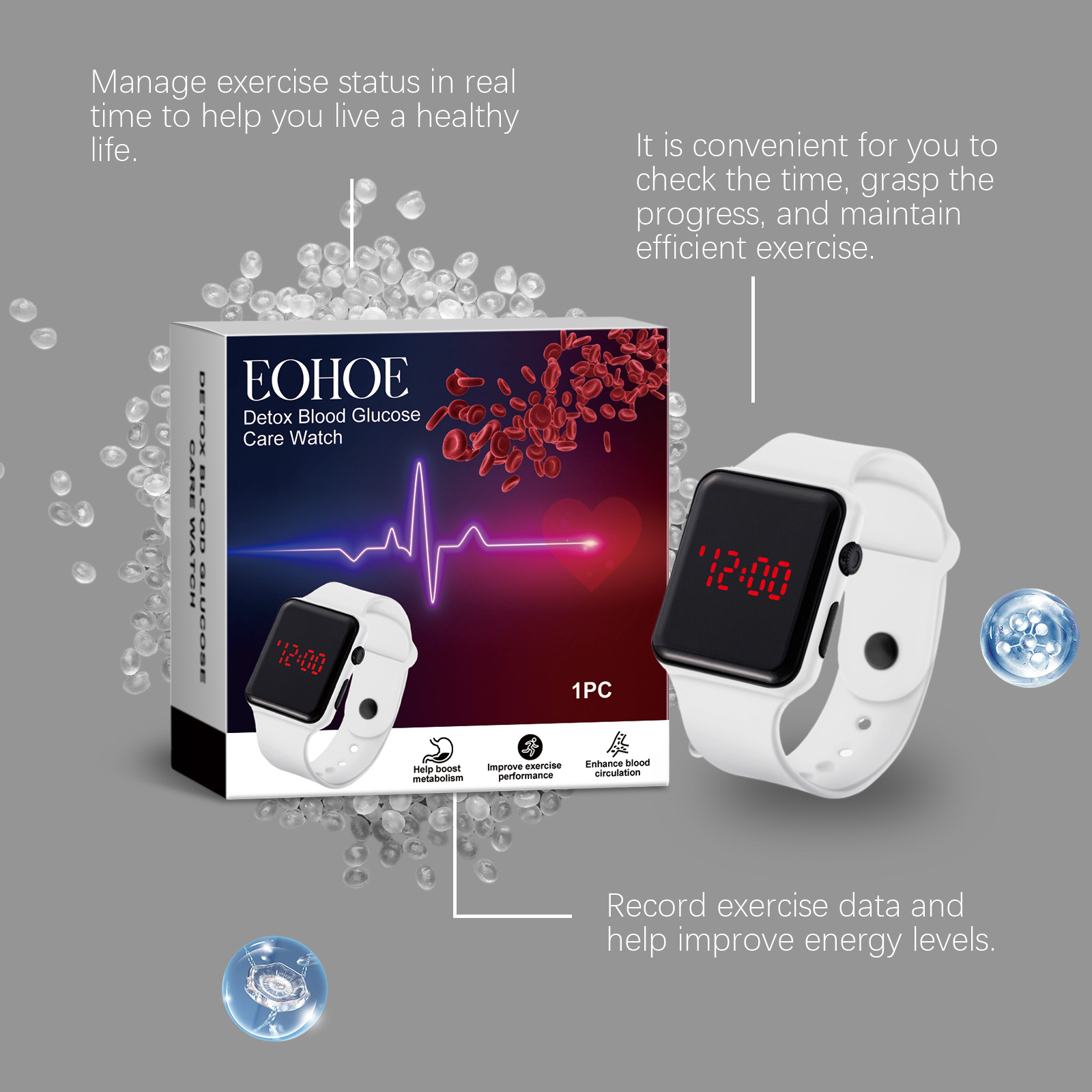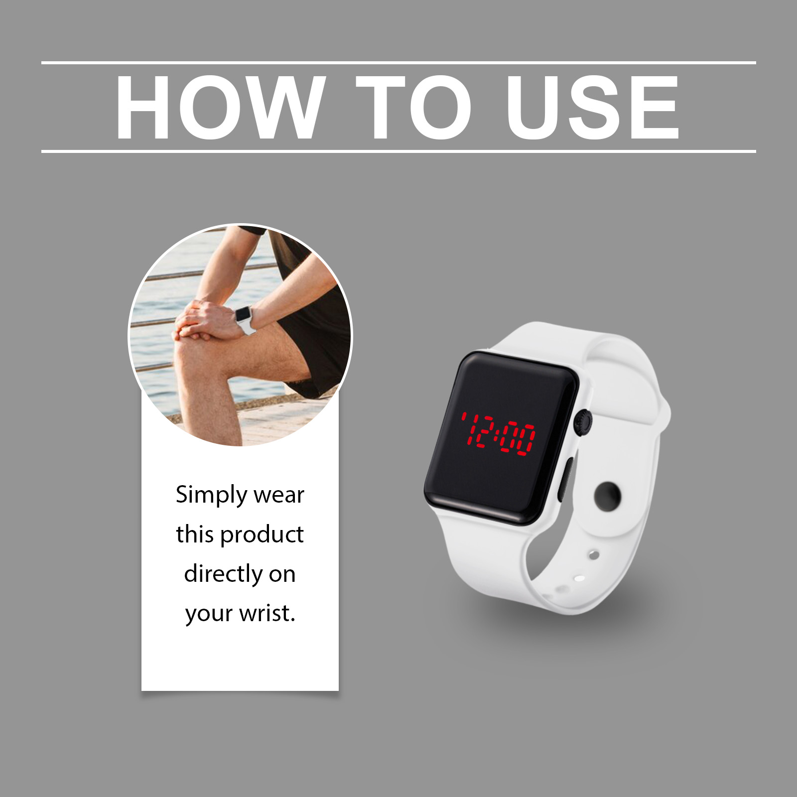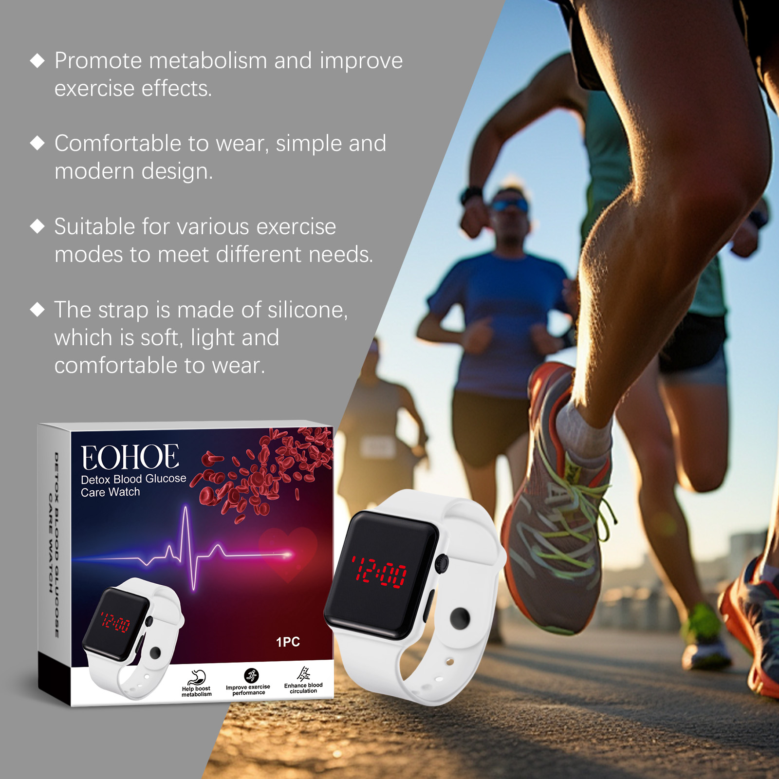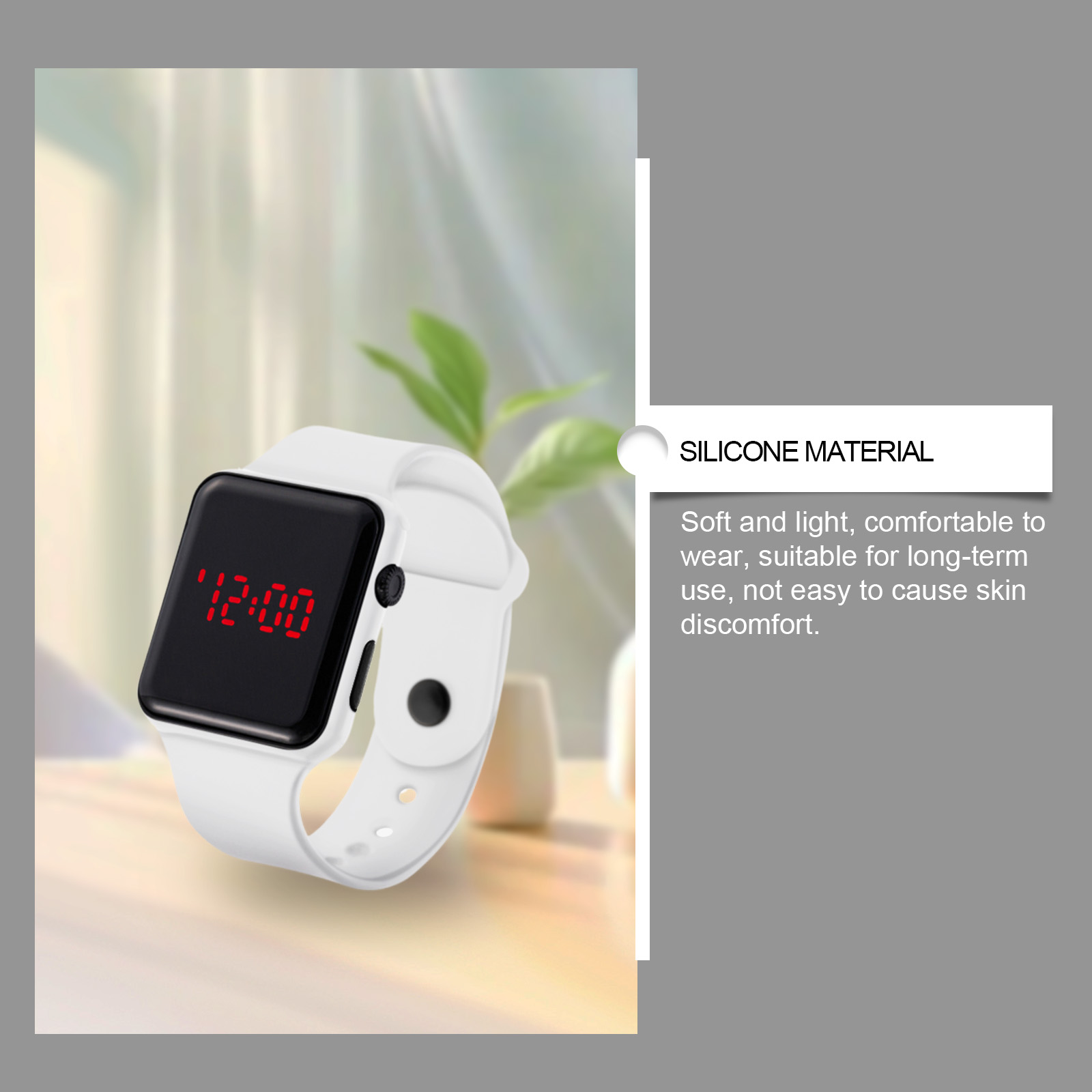 我们的运动手表含有硅胶。它可以鼓励你多锻炼,帮助促进血液循环,使你更健康。它可以促进新陈代谢和脂肪燃烧,提高运动效果。它的使用方法很简单:只需将本产品直接戴在手腕上。并且可以方便查看时间,随时跟踪进度,保持高效锻炼。它轻便舒适,适合各种运动场景,提高了使用的便利性。